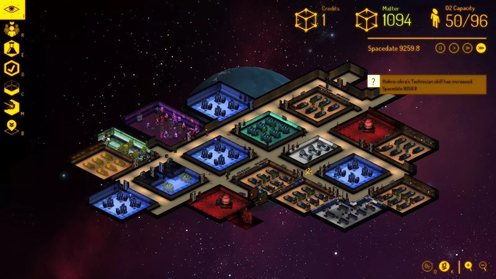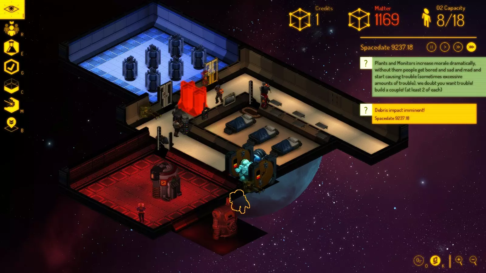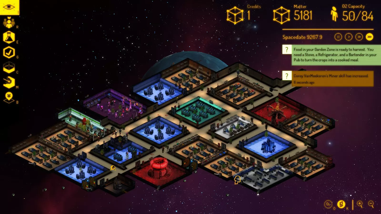 从现在开始,你将收到各种通讯请求,可能导致以下情况: 1) 新市民加入; 2) 掠夺者通过出租车和废弃飞船(与你的基地相连)进行访问; 3) 出现奇怪的空废弃飞船,可能带有研究数据,也可能没有。 你可以接受这些请求,也可以尝试拒绝。此外,当出现废弃飞船和掠夺者突破飞船时,会有通知提醒。 工作 你的自然人口上限为50名市民(但你可以通过俘虏掠夺者并将他们通过禁闭室转变为劳动力,或者用记事本编辑一个游戏文件来突破这个限制)。达到最大人口后,将不会有新市民到来,因此你可以忽略任何通讯请求。基地的每个市民都可以被分配以下工作之一: 未分配 - 每个新来者默认都是这个状态。立即切换到其他居民——你需要的是工人,而不是寄生虫; 建造者——这类居民会使用物质建造地板、墙壁和设备。也可以拆除墙壁和设备,汽化地板砖——从中获取一些物质。他们很有用。有时你会遇到拥有升级设备的建造者,这使他们能一次(以十字形状)建造多达5个方块。 有一种方法可以诱导他们的AI按你的意愿行动:先以你需要的形状下达房间建造指令——然后移除地板砖。当他们即将完成房间形状时,下达铺设地板砖的指令。这会迫使他们在完成地板铺设时待在房间里——这样他们就会去制造你订购的设备,而不是浪费时间去气闸室之类的地方。不过这并非每次都奏效——有些活动是无法取消的。技术员 - 负责修理设备,因为设备可能会被疯子、掠夺者破坏,或者因时间推移而损坏。相信我,你的总人口中大约五分之一需要是技术员。他们的工作永远做不完。 矿工 - 他们开采小行星,将矿石运到精炼厂并转化为物质。 安保人员 - 似乎是唯一懂得使用灭火器的人。他们还会用枪对抗掠夺者,并抓捕你下令逮捕的人。诀窍是在紧急情况下,你可以将其他人重新分配为安保人员。否则,你可以保留他们以提升技能,或者当他们在其他方面没有专长时也可以让他们担任安保。 酒保 - 在酒吧烹饪食物、提供饮品和食物。技能提升最快。当你的基地相当大时,你可能至少需要5名酒保。 植物学家 - 通过可放置物品在园艺室种植植物。更新内容: 1. 区域调整:它们不再是3x3区域,现在仅为1x1,因此花园无需建得太大。 2. 科学家:在研究室使用研究控制台来研发新技术、设备以及未知疾病的治疗方法。 3. 医生:检查人员健康状况以发现疾病,使用复活床进行治疗,将尸体移至物质精炼厂(几乎不会这么做)。 4. 清洁工:用于解决医生处理尸体的问题。同时清除地板上的血迹(也可能不会)。通常不需要长期配备专人,保安人员通常可以兼任。工作安排表如下: