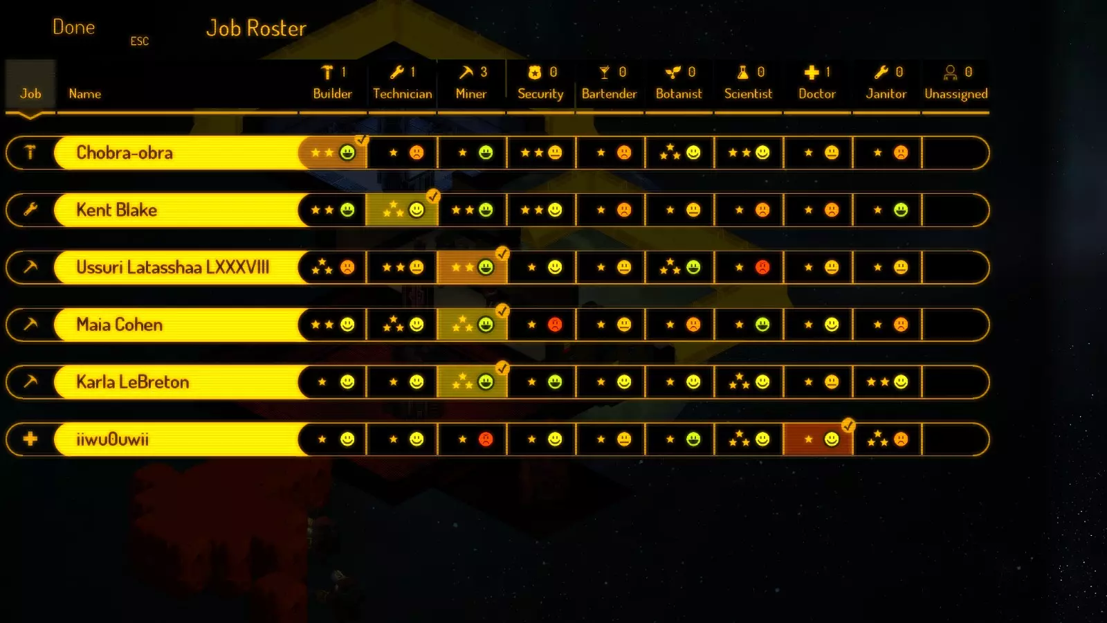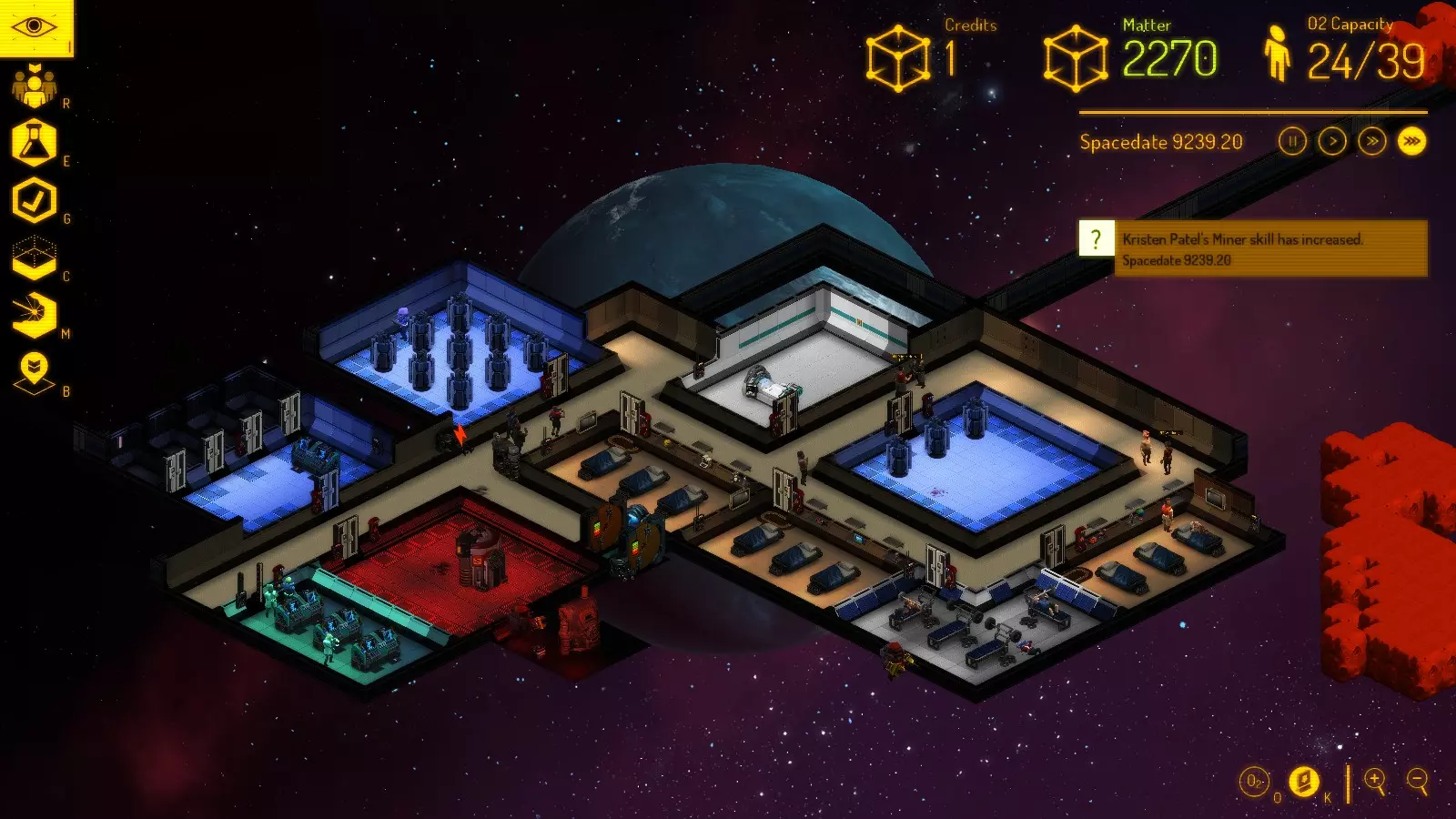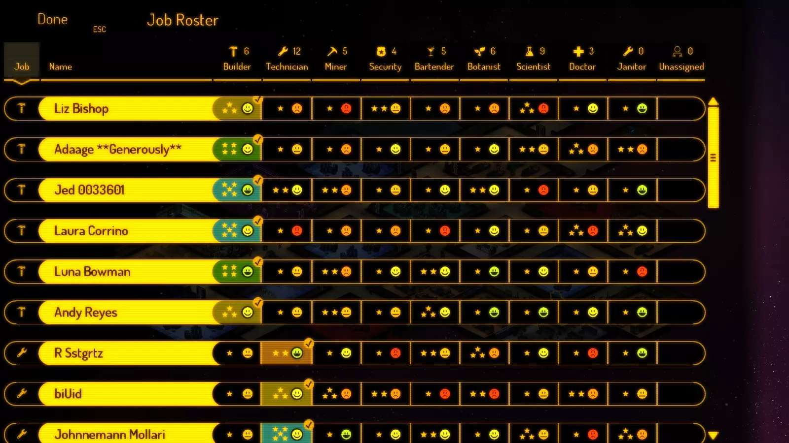 从现在开始,你将收到各种通讯请求,可能导致以下情况: 1) 新市民加入; 2) 掠夺者通过出租车和废弃飞船(与你的基地相连)进行访问; 3) 出现奇怪的空废弃飞船,可能带有研究数据,也可能没有。 你可以接受这些请求,也可以尝试拒绝。此外,当出现废弃飞船和掠夺者突破飞船时,会有通知提醒。 工作 你的自然人口上限为50名市民(但你可以通过俘虏掠夺者并将他们通过禁闭室转变为劳动力,或者用记事本编辑一个游戏文件来突破这个限制)。达到最大人口后,将不会有新市民到来,因此你可以忽略任何通讯请求。基地的每个市民都可以被分配以下工作之一: 未分配 - 每个新来者默认都是这个状态。立即切换到其他居民——你需要的是工人,而不是寄生虫; 建造者——这类居民会使用物质建造地板、墙壁和设备。也可以拆除墙壁和设备,汽化地板砖——从中获取一些物质。他们很有用。有时你会遇到拥有升级设备的建造者,这使他们能一次(以十字形状)建造多达5个方块。 有一种方法可以诱导他们的AI按你的意愿行动:先以你需要的形状下达房间建造指令——然后移除地板砖。当他们即将完成房间形状时,下达铺设地板砖的指令。这会迫使他们在完成地板铺设时待在房间里——这样他们就会去制造你订购的设备,而不是浪费时间去气闸室之类的地方。不过这并非每次都奏效——有些活动是无法取消的。技术员 - 负责修理设备,因为设备可能会被疯子、掠夺者破坏,或者因时间推移而损坏。相信我,你的总人口中大约五分之一需要是技术员。他们的工作永远做不完。 矿工 - 他们开采小行星,将矿石运到精炼厂并转化为物质。 安保人员 - 似乎是唯一懂得使用灭火器的人。他们还会用枪对抗掠夺者,并抓捕你下令逮捕的人。诀窍是在紧急情况下,你可以将其他人重新分配为安保人员。否则,你可以保留他们以提升技能,或者当他们在其他方面没有专长时也可以让他们担任安保。 酒保 - 在酒吧烹饪食物、提供饮品和食物。技能提升最快。当你的基地相当大时,你可能至少需要5名酒保。 植物学家 - 通过可放置物品在园艺室种植植物。更新内容: 1. 区域调整:它们不再是3x3区域,现在仅为1x1,因此花园无需建得太大。 2. 科学家:在研究室使用研究控制台来研发新技术、设备以及未知疾病的治疗方法。 3. 医生:检查人员健康状况以发现疾病,使用复活床进行治疗,将尸体移至物质精炼厂(几乎不会这么做)。 4. 清洁工:用于解决医生处理尸体的问题。同时清除地板上的血迹(也可能不会)。通常不需要长期配备专人,保安人员通常可以兼任。工作安排表如下: