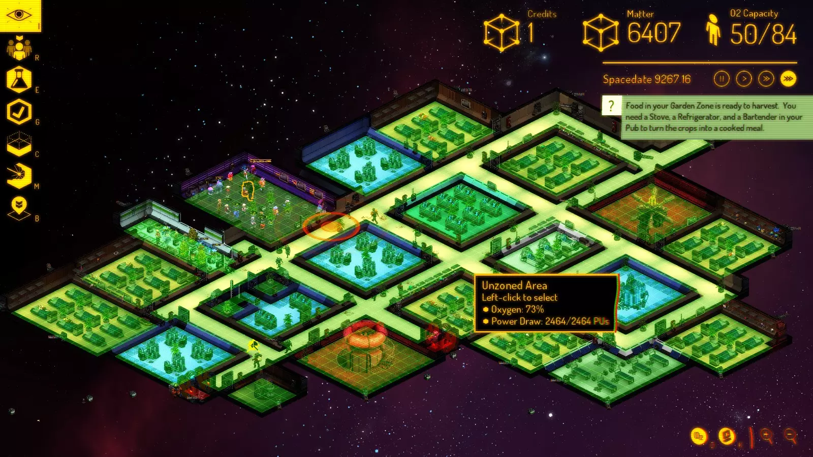 此外,在这张截图中,我放置了医务室和健身室。 废弃区域陷阱:废弃区域有独立的氧气水平,但总人口是按地图计算的,所以对于不使用的废弃区域(在救出所有人并解除气闸区域划分后),要关闭其中的氧气循环器。由于主要是为了供电,你可以移除除了与反应堆相连的墙壁之外的所有东西。 另一个氧气问题是,未完工的房间(缺少墙壁和/或地板砖)也会被供应氧气,并将氧气浪费到太空中,所以在它们准备好之前要为其密封氧气。 花园和酒吧——我尝试将它们放置在一起,门靠近冰箱。酒吧是个大问题,原因很简单:很多人聚集在一个地方会耗尽氧气,然后引发恐慌。考虑在酒吧后面放置备用的第二代氧气循环器——甚至是第四代的。在酒吧初期建议设置6-9张桌子、几个冰箱、一个 stove(炉灶)和一个吧台。桌子越多,你就需要越多的酒保来更快地为顾客服务。