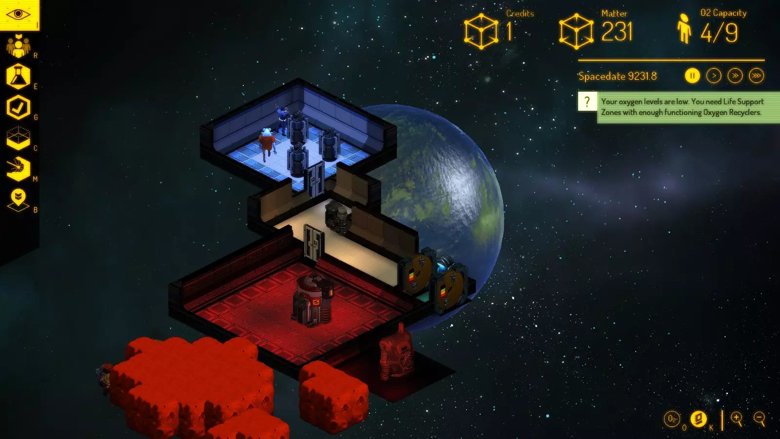 别忘了在大厅里放置食物复制器; 根据人员的偏好分配工作,让他们担任矿工和技术人员,可能在下一批抵达人员中安排一名医生; 建造一个7x4的居住室,配备3张床和3个架子(矿工将为此带来材料)。或者也可以选择7x7的房间。说实话,我发现7x7的居住室更实用; 配备4个氧气循环器,并将生命维持室的尺寸扩大到7x7; 这样就构成了基础基地。