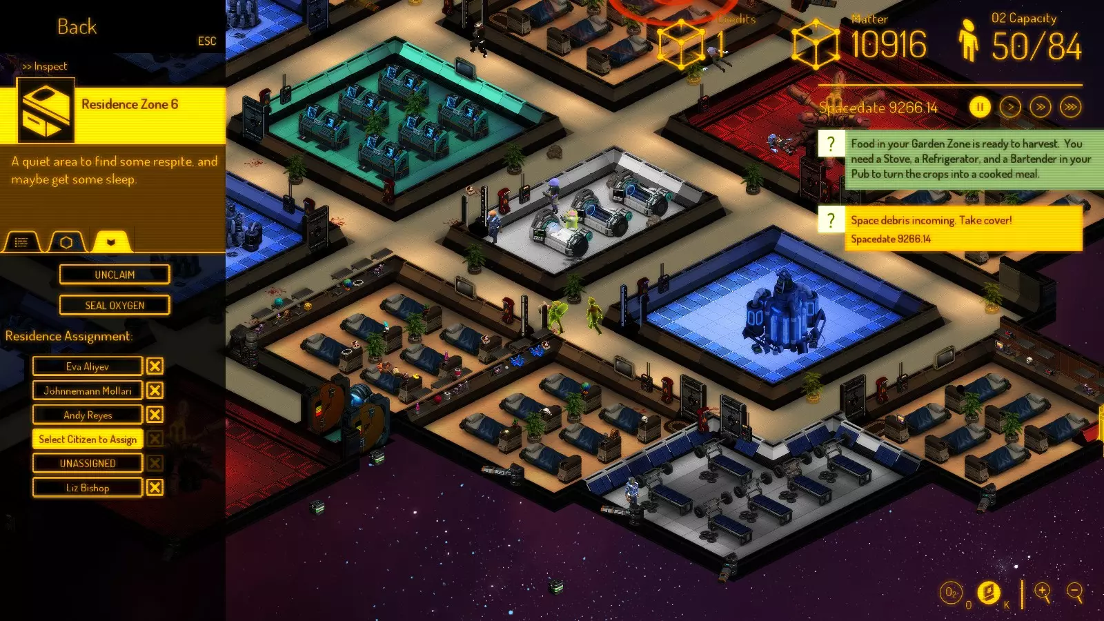 目前几乎所有研究都已完成。建筑工被用来清理废弃的空残骸以获取物质。 在此过程中,我制作了大约52张空床并分配给了人员。这是为了估算物质。 技巧:选择房间,点击列表中的【未分配】,然后点击绿色高亮显示的人员。无床人员和空床会以绿色高亮显示。