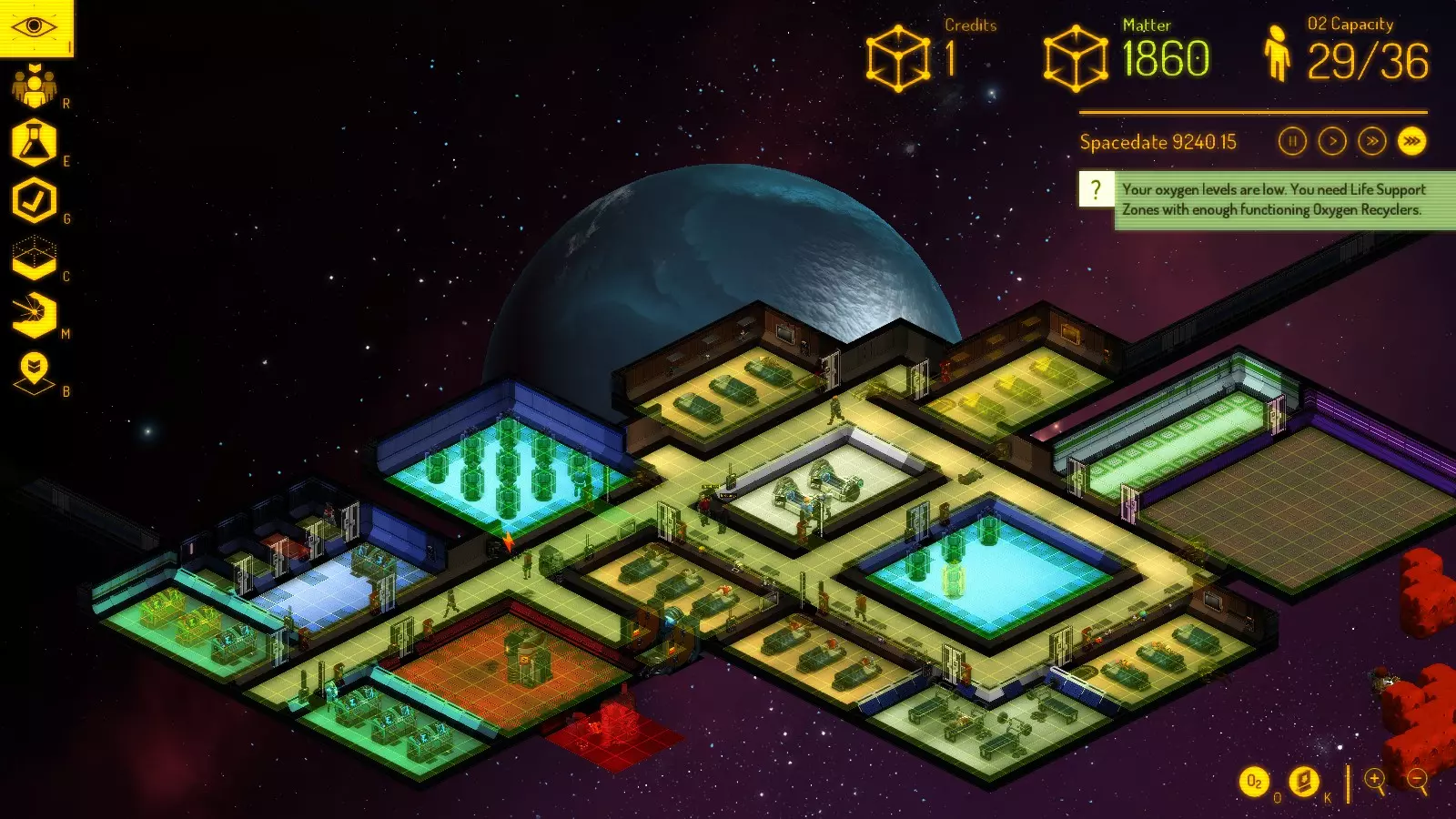 图标内包含两方面信息:一是人物的技能熟练度(以微笑泡泡头的数量表示),二是他们对这些工作的喜爱程度(通过颜色体现,会影响士气)。 技能等级上限为5级,新市民的技能等级上限为3级。技能等级越高,他们的工作表现就越好。你需要将技能最熟练的人员分配到相应的工作岗位上,但并非总能获得最佳选择。 基地建设2 简单的部分已经结束——现在你需要升级并维护你的基地。 看到氧气指示器了吗?它只说明了一半的情况。氧气通过房间在整个基地内扩散,大型基地需要的氧气总量是人口数量的1.5到2倍。例如,如果你有21名人员(理论上需要7个基础氧气循环器),那么你需要42的最大可用氧气量(即14个基础氧气循环器)。当船上人数达到20-25人左右时,这一点会开始变得明显。 此外,研究才是你真正需要做的,原因很简单——没有新东西你是撑不下去的。 基础氧气循环器有一个问题——它们的数量使得维护起来非常困难。可以考虑制造高级版本(每个循环器供6人使用,占地4x4——因此单位房间空间的效率较低:7x7的房间里4个高级循环器能供24人使用,而9个基础循环器能供27人使用。但数量少的话维护起来更容易)。而且损坏的循环器产生的氧气量会下降,尽管氧气容量指示器上没有显示变化。要准备好为另一个循环器房间腾出地方。 在我看来,3级和4级氧气循环器并不是那么好。实际上,虽然它们的尺寸是6x6,但1个3级或4级循环器产生的氧气比4个4x4的2级循环器还要少。更换成它们需要额外的一两个房间。但首先,建造至少配备一张复活床的医务室是必须的——因为这是对抗寄生虫病的唯一对策,一旦寄生虫病爆发,那玩意儿可是棘手得要命。 此外,精炼厂还有一个更实际的用途——你可以强制让人员放下手中的任务进入精炼厂,这在你试图让人员撤离废弃空间站时非常有用。 接下来是一些保障安全的实用物品: 灭火器——我会尽量把它们放在门附近。它们是用来灭火的。没有灭火器的话,人们往往会用身体去灭火,效率更低,还会导致受伤甚至死亡。有了灭火器也并非绝对安全,但情况会好很多。 紧急警报器——启动后,人员会逃离所在房间。 防御炮塔——目前你只需要在气闸附近放置一个,在基地内部面向气闸再放置一个就足够了。它们价格不菲且能耗巨大,但两发子弹就能消灭一名入侵者,四发子弹就能摧毁入侵者的破门飞船。我倾向于在游戏初期这样设置炮塔: