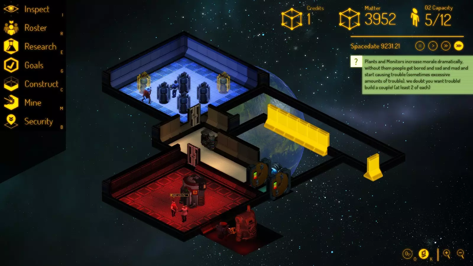 好吧,床还是不够用——都怪那个该死的酒吧:人们光顾酒吧的频率比去食物复制机还高。就算安排了5个酒保让服务速度快了不少,他们还是会在那儿待很久,又是聊天又是吃那些鬼东西。咳咳。 另外,我在基地的左右两侧各建了一个气闸。 至于人员配置,我的安排如下: