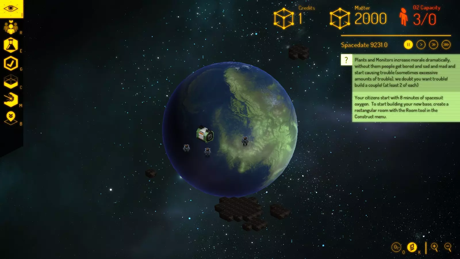 在人员名册中将3人全部设为建造者; 标记种子舱进行拆除——拆除它可获得375物质,加上聚变反应堆提供的1000电力单位和175剩余物质,这比仅获得500电力单位更好; 开始搭建基地基础: 1. 建造1x2地砖大小的气闸门房间; 2. 从气闸门起始处延伸出一个10格长的房间(包含气闸门),作为你的主大厅。在主大厅尽头,向侧面延伸出一个2格长的房间; 3. 在尽头建造两个房间:7x7的反应堆房间和5x5的生命维持系统房间。这样就形成了类似阴茎形状的基地。或者,你也可以将反应堆放置在左下侧——这取决于个人偏好和基地布局。建造反应堆的原因是:基地的种子舱反正已无用,并且花费200单位建造的反应堆,其发电量是种子舱的两倍(回收种子舱可获得375单位价值)。实际上,你可以考虑建造一个7x7的房间,并预留扩展到8x8的空间(用于放置SCI反应堆); 气闸下方铺设4x4的地砖,作为精炼厂的位置(从氧气角度来看有点风险,最好在其他所有设施都建造完成后再标记)——并且一旦精炼厂建成,**不要忘记密封精炼厂内的氧气**。事实上,我最终选择在基地内部设置精炼厂房间——与当你开采完附近所有资源时的氧气问题相比,时间并不是关键因素; 在等待你的人员建造基地时,标记所有小行星进行开采。当他们完成地板铺设(这是他们的首要任务)后,在那里放置可建造物:在5x5的房间内放置2-3个氧气循环器,将反应堆放入反应堆房间。在气闸房间内放置2个气闸门和太空服储物柜。此外,会有消息提示即将有1-2人加入你的基地——接受他们。在基地外的4x4区域建造物质精炼厂。初始物质数量加上拆解种子舱获得的物质,将足以支付建造费用。 别忘了在此过程中建造门! 你的基地可能会是这样的: