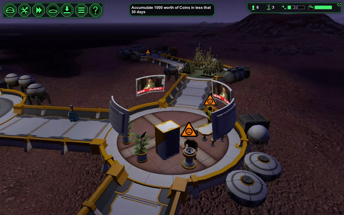 现在你的食堂应该是这个样子的 设置完成。是时候赚钱了 第3-13天:盈利 这是一个基本被动的阶段。你会看到数十名访客着陆,吃你的食物,睡你的床,每人支付10-25美元,然后离开。在任何时候,你的基地大约会有4-5名访客,预计每天能赚100金币左右。 小屋床铺和意大利面餐食基本能满足幸福感需求(这就是西红柿和小麦组合很重要的原因)。不要建造酒吧。你小小的农场和2名生物学家无法支持足够的蔬菜产量,来同时满足餐食和酒精的需求。 你的访客可能会携带流感病毒进入。对此你真的无能为力。生病的人似乎会一直待在原地直到康复。他们头顶的【口臭】图标会从红色变为橙色,再变为黄色,然后消失。一旦图标消失,人们会休息直至恢复健康,之后要么回去工作(殖民者),要么支付费用后离开(访客)。 你的工程师会让机器人保持基本的工作状态。当机器人身上出现扳手图标时不必担心,工程师最终会放下手头的事去修理它们。 在此期间,淀粉会在仓库中不断积累。你有足够的空间存放它。这些淀粉和可能多余的食物将成为你的保险储备,以防万一情况变得糟糕,导致利润极低。 到第13天,游戏可能会警告你备件已经用完。忽略此信息。你只需再维持基地最多2天,即便不进行进一步维修,基础设施也能坚持到那时。 第14天:清仓大甩卖 仅依靠访客收入,你很可能就能达到1000金币。不过,如果到了第13天晚上你仍差一点现金,可以出售你积累的淀粉和任何多余的食物。 从F5菜单再次向贸易商开放你的停机坪。当有贸易商着陆时,将你所有的淀粉以及大部分或全部储存的食物卖给他们。这笔利润应该足以弥补你的收入与目标之间的任何差额。 恭喜!任务完成。