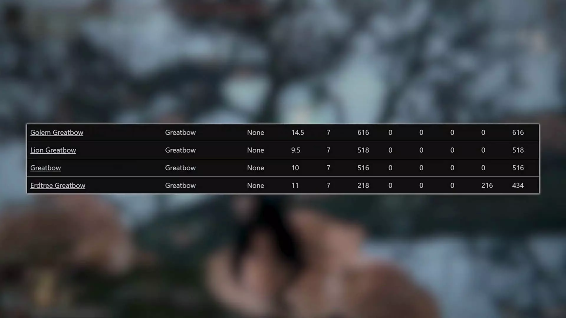 黄金树长弓 掉落自啜泣半岛英雄墓地的灵车 需求:20力量/E-D 14敏捷/E-D 14信仰/D 攻击:物理=60-147 物理=65-159 这把长弓充分说明了为何不应迷恋潜力。乍看之下,所有箭矢伤害都基于信仰进行缩放似乎很疯狂,但实际上这只是一种迂回的方式,告诉玩家这把长弓的信仰缩放比两项物理属性能带来更高的投资回报。有点像在脚踝绑上水泥块比正常潜水更“高效”地到达湖底。这信仰缩放系数居然只有0.54!