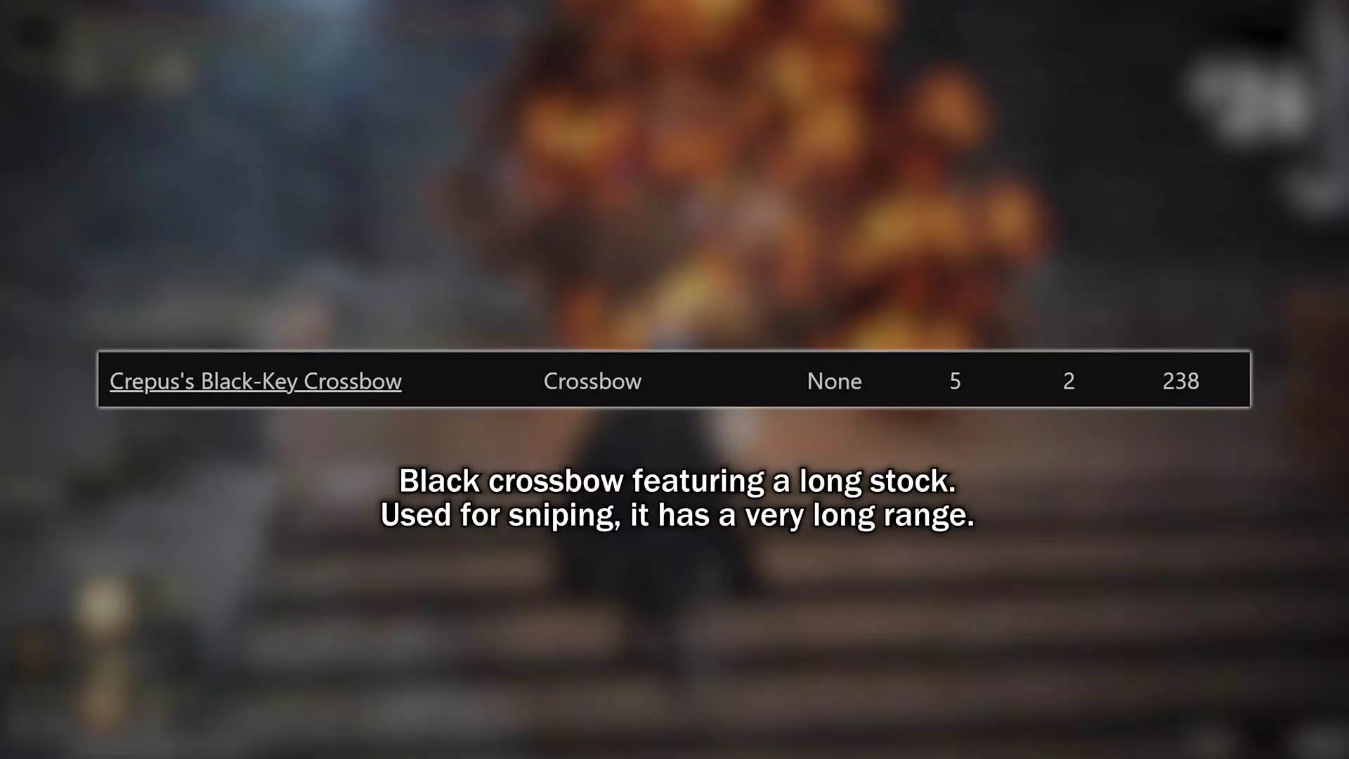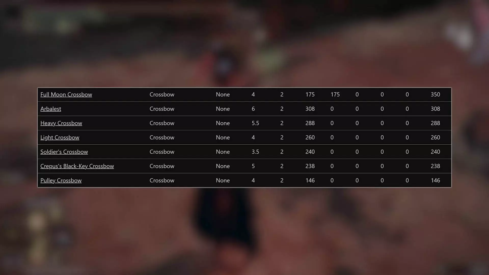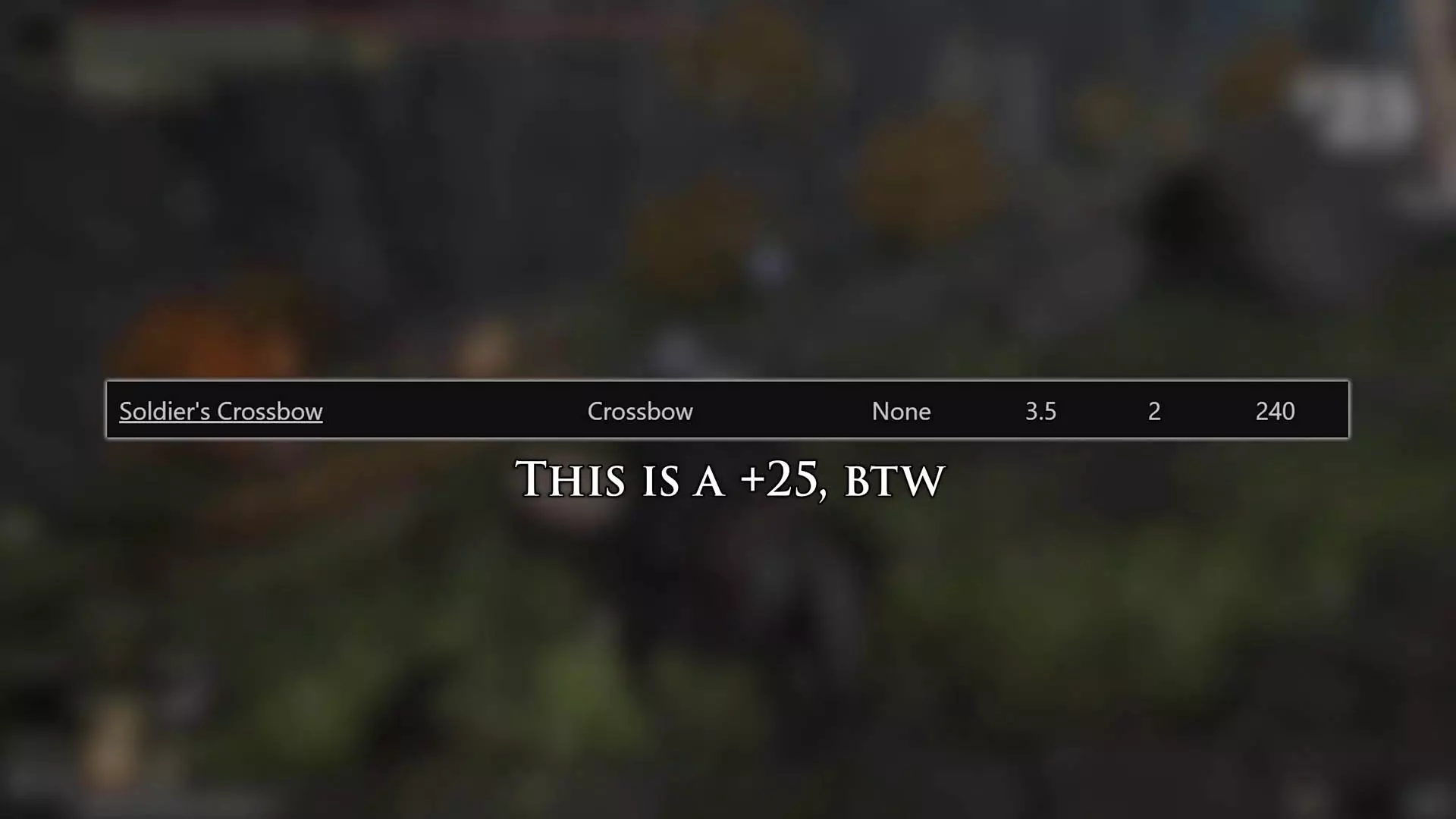 我认为滑轮弓恰好体现了弓类武器普遍存在的问题。 其属性补正确实糟糕透顶,即便它已是游戏中补正较好的弓之一,但如果它的补正能和其他武器持平,你就能轻松撕碎一切敌人,把游戏变成一款点击冒险游戏。 问题甚至不在于弓的伤害不足,而是当你把弓作为主武器时,一旦被敌人近身就毫无近战手段,战斗循环也因此变得模式化,只能进行远程战斗。 这让我对滑轮弓有了最终的看法。射程更远固然不错,但如果不能一击消灭敌人,那这点优势就没什么实际用处了。因为一旦敌人低头看到自己胸口莫名出现的弹孔,他们首先会做的就是开始拉近与你的距离。 如果你追求的是射程,那就用长弓吧,它还能提供强大的制动力。 第十名——十字弩
