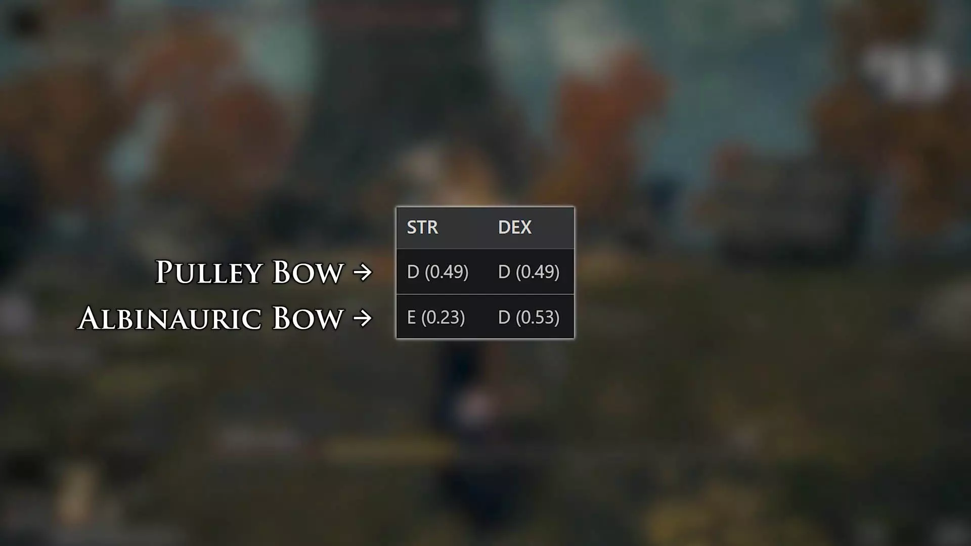 单纯看伤害数字可能会有些误导,因为射程越远,伤害衰减就越不明显,这就是为什么滑轮弓在纸面上看似表现平平,但实际使用中伤害反而更高。D级的属性补正简直是种侮辱性的误导,因为实际补正数值中,敏捷仅为0.39,力量更是低至令人震惊的0.30。