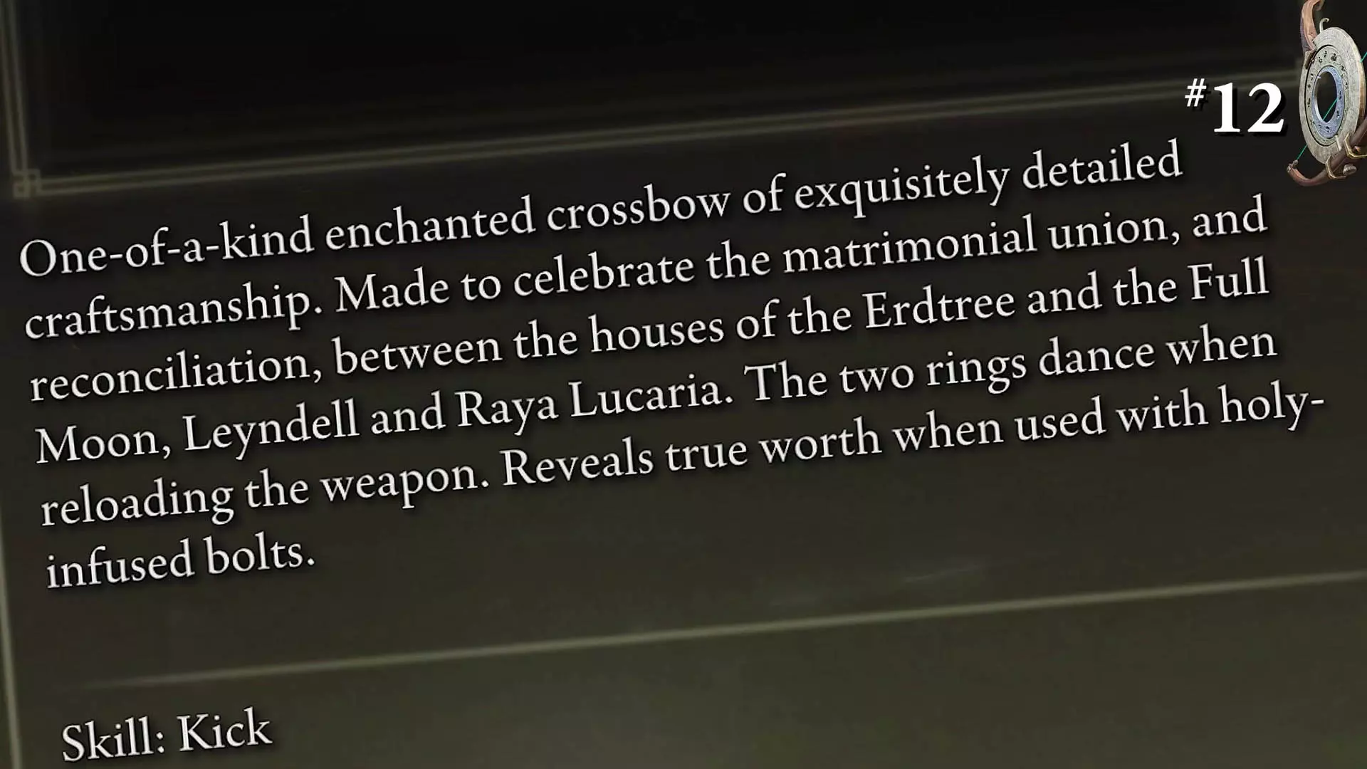 如果连那个超然的旁白都被骗了,那肯定是某种顶级的错误信息。我觉得我们算是正式找到了叙事过于沉浸的临界点。 那种背景设定应该刻在某个雕像的头上,而不是放在该死的物品描述里。 不过一旦你真的搞明白怎么用它,其伤害比大多数其他十字弩略高一些。 这主要是因为它的基础魔法伤害还算高,而且很容易被游戏提供的其他道具所强化。 归根结底,这是一把完美的5分(满分10分)十字弩,这真的是我能给出的最高评价了。 编号13——【阿尔比娜uric弓】