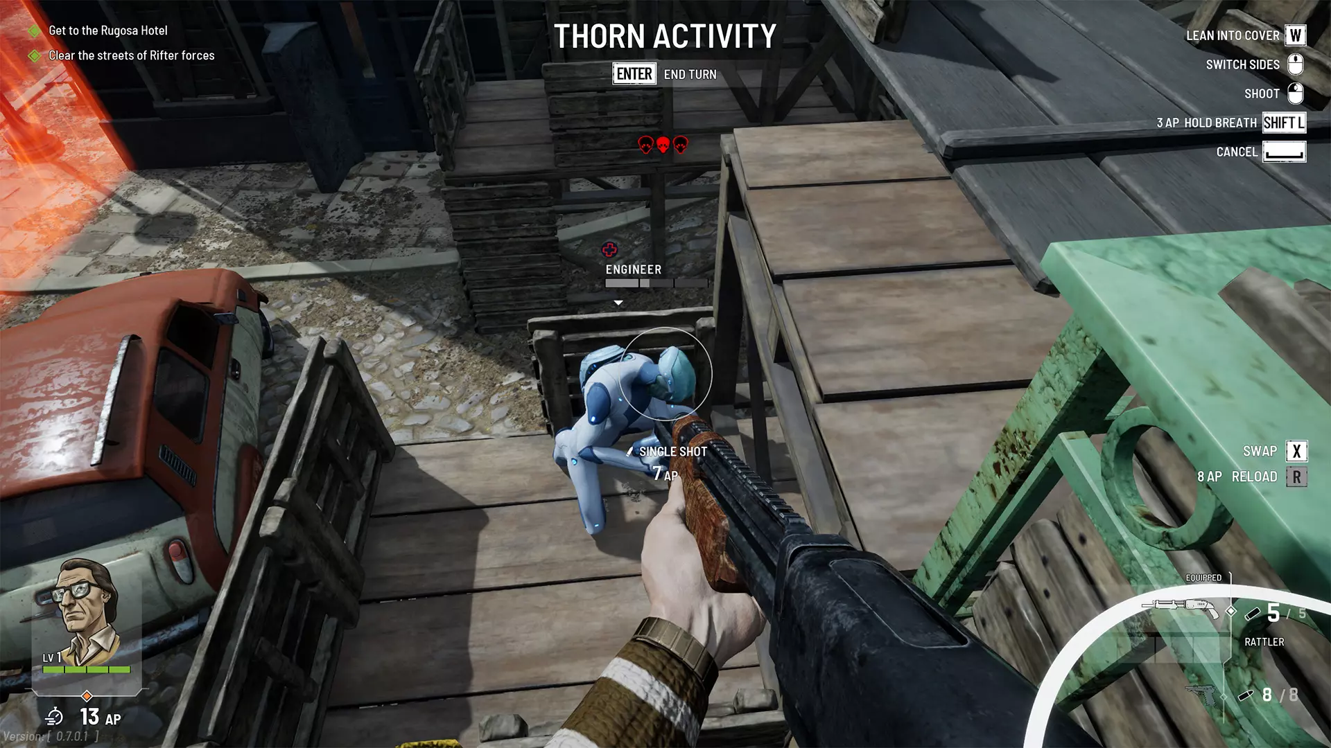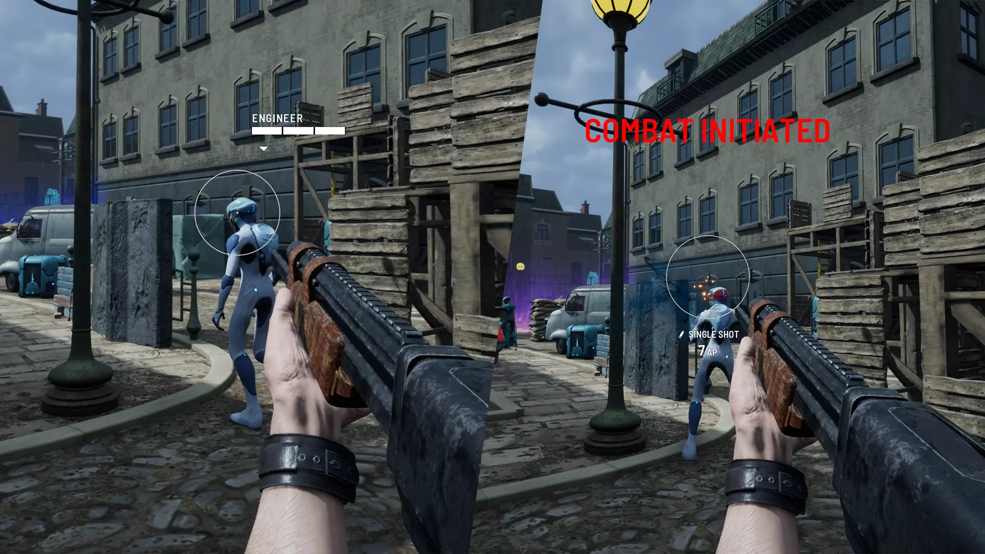 战斗的第二个要素是第一人称瞄准射击。当你准备向敌人开火时,右键点击鼠标进入第一人称模式。现在你可以手动瞄准目标。在第一人称模式下,你会看到一些关键信息: 潜在敌人承受伤害:瞄准目标时,你可以看到成功命中后敌人将受到的伤害数值。 行动点消耗:开火所需消耗的行动点。 第一人称动作:一系列帮助你获得更好射击角度的动作,包括侧身躲入掩体、切换肩膀瞄准另一个目标、消耗行动点屏住呼吸以稳定射击,当然还有射击目标。 切换与装填:你可以同时携带两把武器,切换武器无需消耗行动点。重新装填武器会消耗行动点,因此时刻留意弹药量至关重要。 请注意,爆头通常能对敌人造成最大伤害,但由于掩护、护甲等因素,这一选项并非总能使用。攻击其他身体部位可能是更优的选择,并且射击这些部位有可能造成其他状态效果。