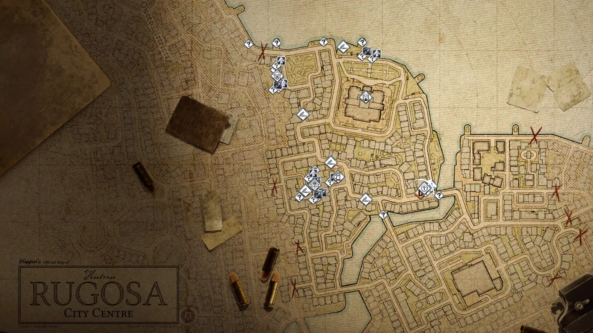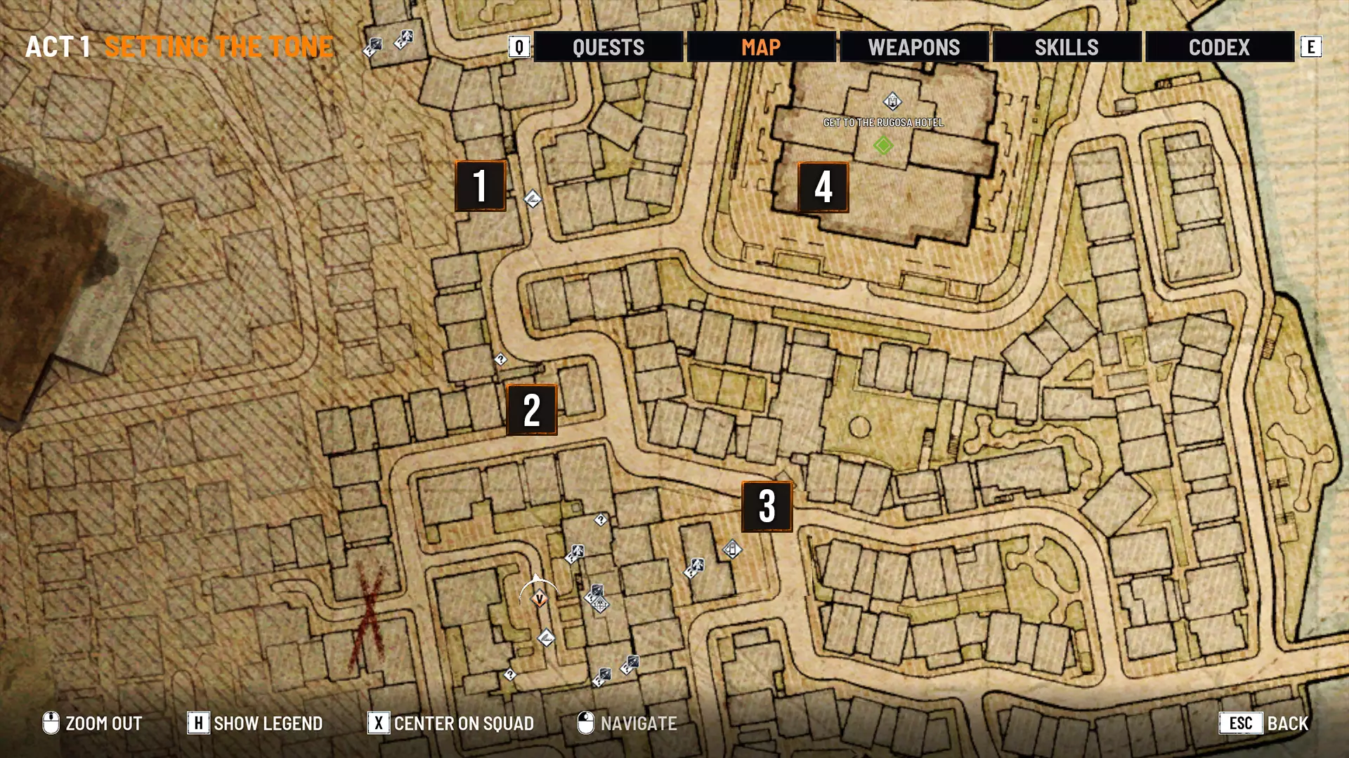 当你探索周围的城市时,城市地图会逐渐标记出你经过的物品和地点。按下H键可以调出地图图例,显示以下位置: 【下水道井盖】——用于快速传送到鲁戈萨的不同区域。 【未发现物品】——在街道或建筑物中发现的物品,例如废料和绷带。 【地点】——帮助你在城市中导航的重要兴趣点。 【主要目标】——你需要参与的战役相关任务。 注意,地图上的任何红色X标记都是无法穿过的边界障碍。