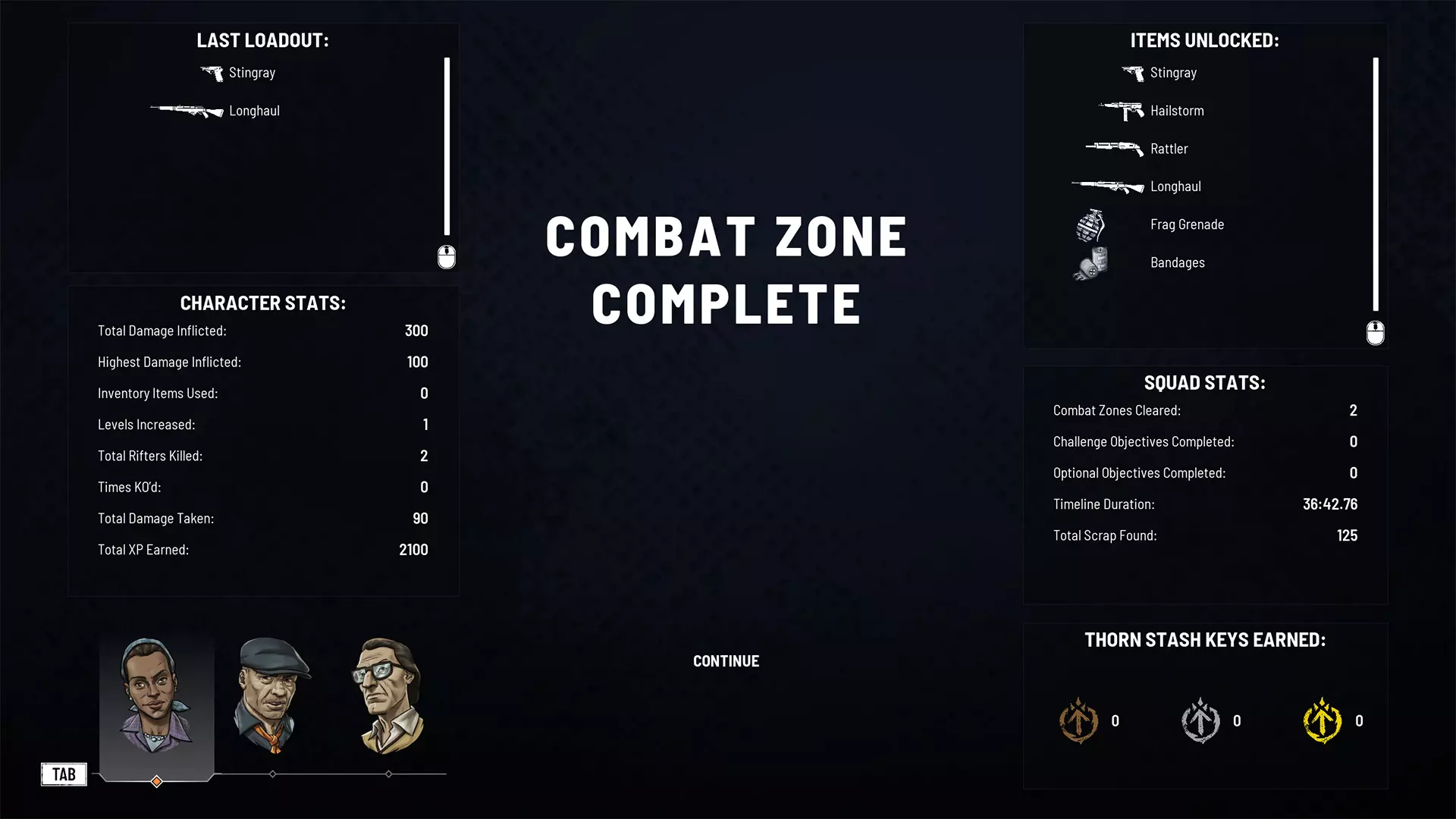 在战斗区域成功完成战斗后,会显示一系列统计数据,包括在战斗区域花费的时间、伤害统计、获得的经验值以及你的荆棘的最新装备配置。同时还会显示你解锁的任何物品,这些物品可能会在你的下一轮游戏中随机出现。