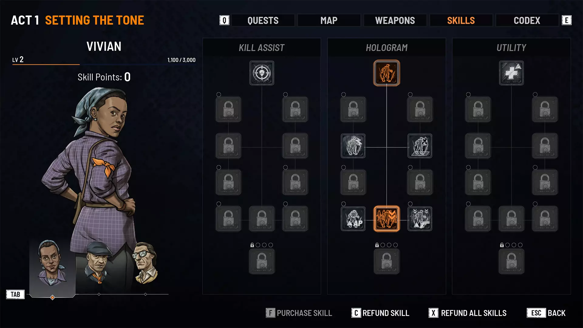 随着荆棘成员在城市探索、战斗以及完成任务的过程中获得经验,他们会升级并获得技能点。这些技能点可用于为每位荆棘成员解锁独特技能。每个技能都有其独立的解锁树,你可以根据自己的游玩风格选择不同的发展方向。 许多技能可以与其他成员协同作用,例如薇薇安的【击杀助攻】技能,当其他荆棘成员将敌人打到濒死状态时,她可以将其击杀。还有一些技能能以各种方式为其他荆棘成员提供增益,比如利奥的【能量捐赠】技能,他可以将10点行动值转移给另一位荆棘成员供其使用。 找到荆棘成员之间以及与你的游玩风格之间的最佳协同组合,将为你带来最大的成功机会。