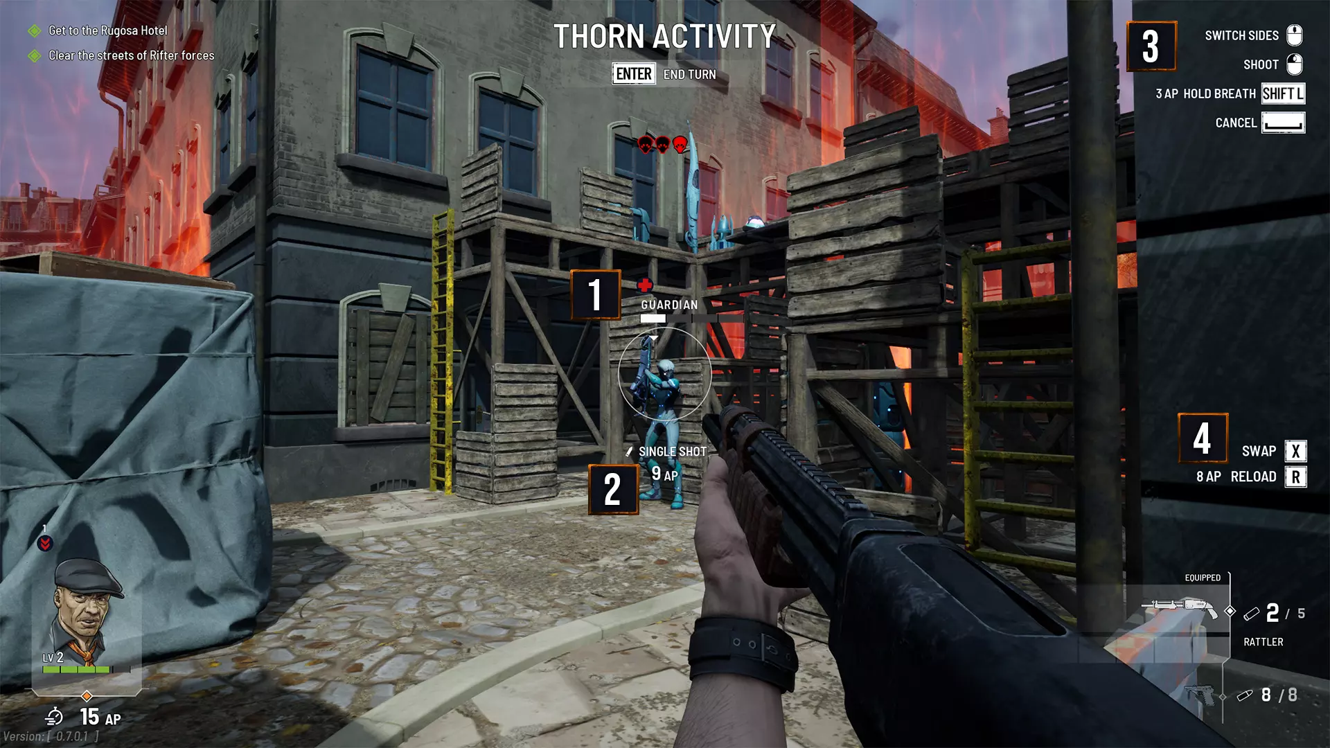 战斗中,你可以通过左键点击地面上的任意位置进行移动。圆圈内的数字是移动到该位置所需的行动点消耗,子弹图标表示剩余行动点可进行的射击次数。