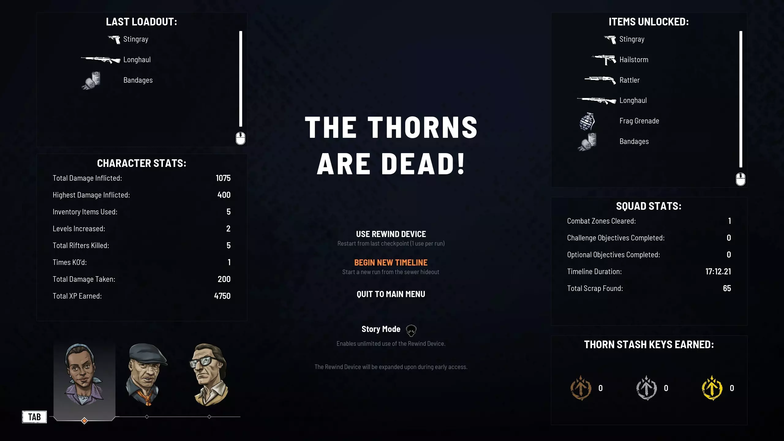 当所有荆棘成员牺牲后,你可以选择重新开始当前章节,或使用回溯装置从当前回合的最后一个检查点重新开始。每个章节你仅拥有一个回溯装置,请谨慎使用。 若你希望无限使用回溯装置,可切换至故事模式。 荆棘成员管理