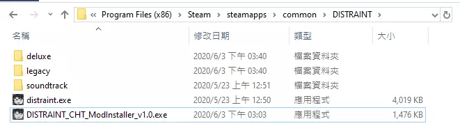 本模组由SEACUCU海餐翻译一人制作! 本模组诞生的契机 其实除了这真的是一个很棒的游戏以外 也刚好因为我这阵子手边比较没有其他译案要忙 使用说明 如何安装模组 在Steam客户端的收藏库中,对左侧列表的【DISTRAINT: Deluxe Edition】按右键,点选内容→本机档案→浏览本机档案。这会开启一个名为DISTRAINT的本机档案资料夹。 将压缩档内的DISTRAINT_CHT_ModInstaller.exe拖曳至刚才开启的DISTRAINT资料夹。