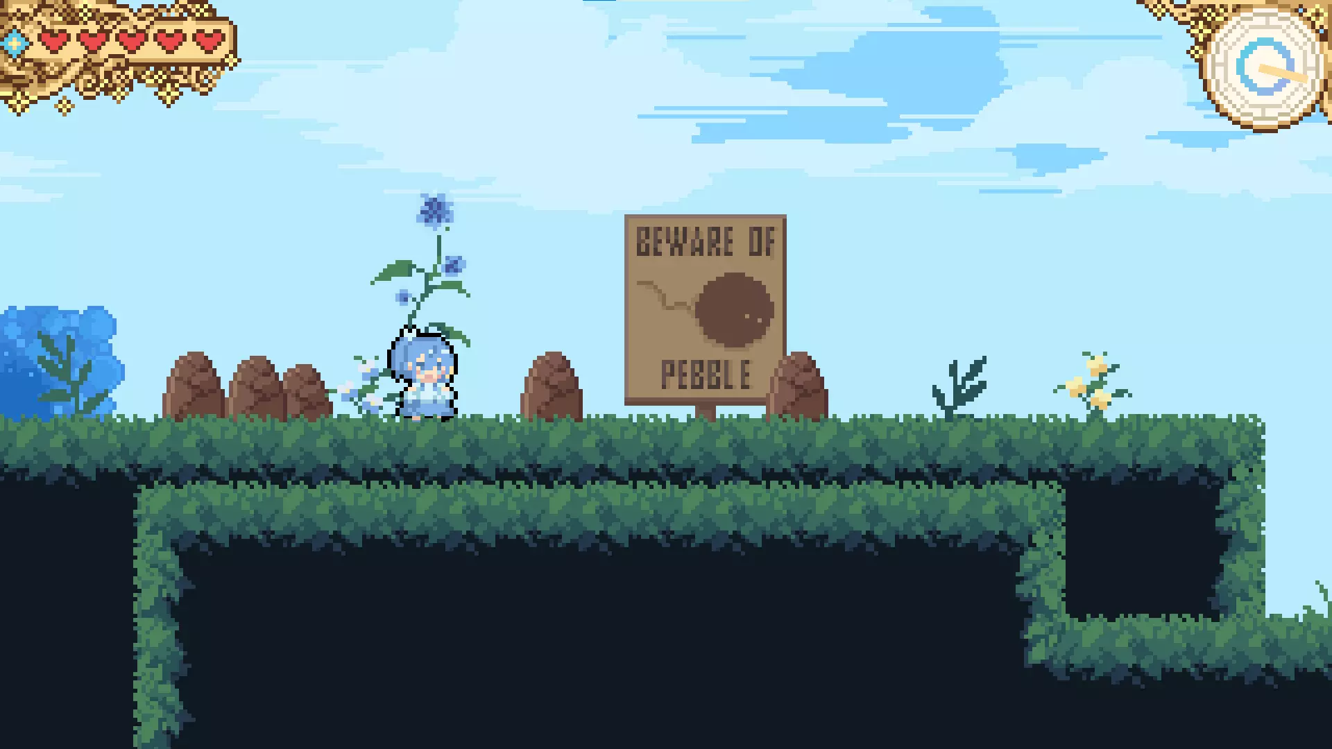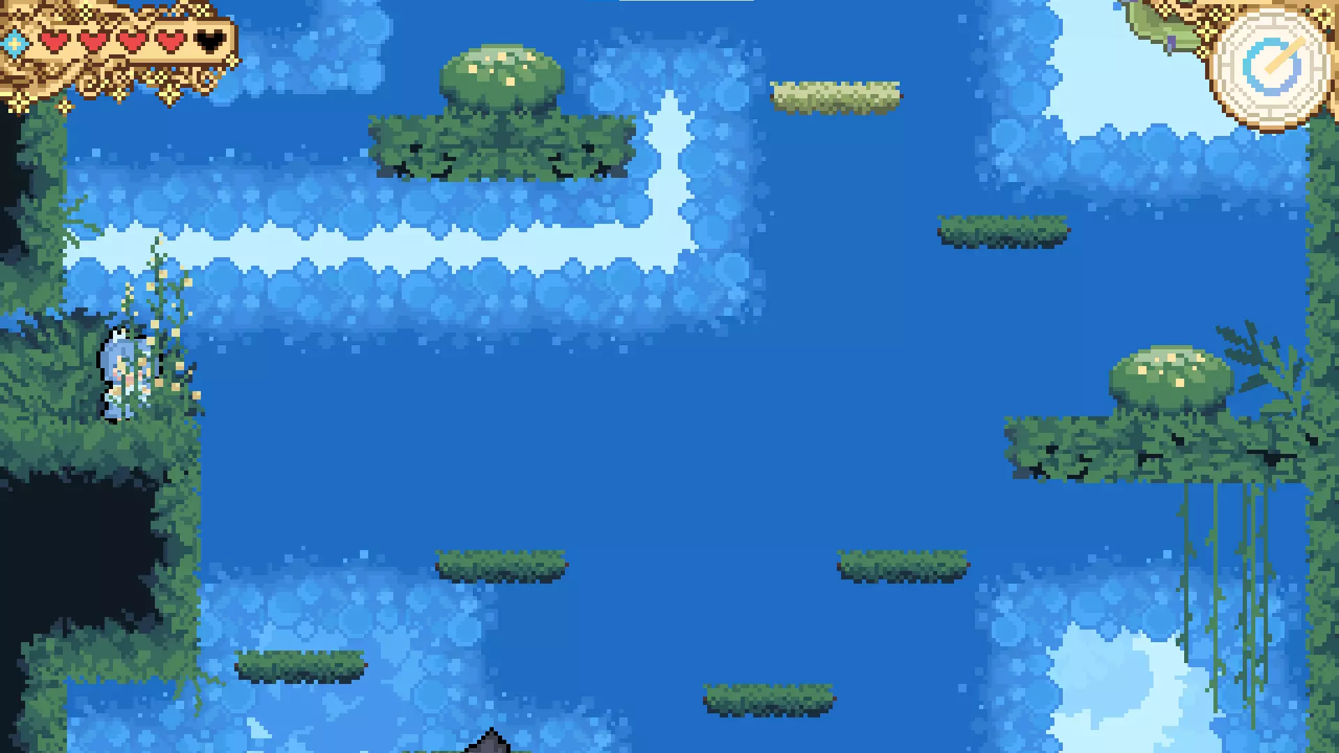 蓝色钻石代表某种计量条。你投掷的每个投射物都会消耗一部分计量条。如果计量条耗尽,你将退出“灰姑娘”状态(?),这会导致你的投射物射程大幅缩短,可能还会降低伤害?老实说,这部分我不太确定。计量条会随时间自动恢复。 右上角是时间。每个关卡都有时间限制;游戏中没有生命系统,但死亡会消耗时间。关卡中偶尔会有时钟道具,能为你恢复一些时间。我从未真正耗尽过时间,但我猜时间耗尽会导致关卡“游戏结束”。