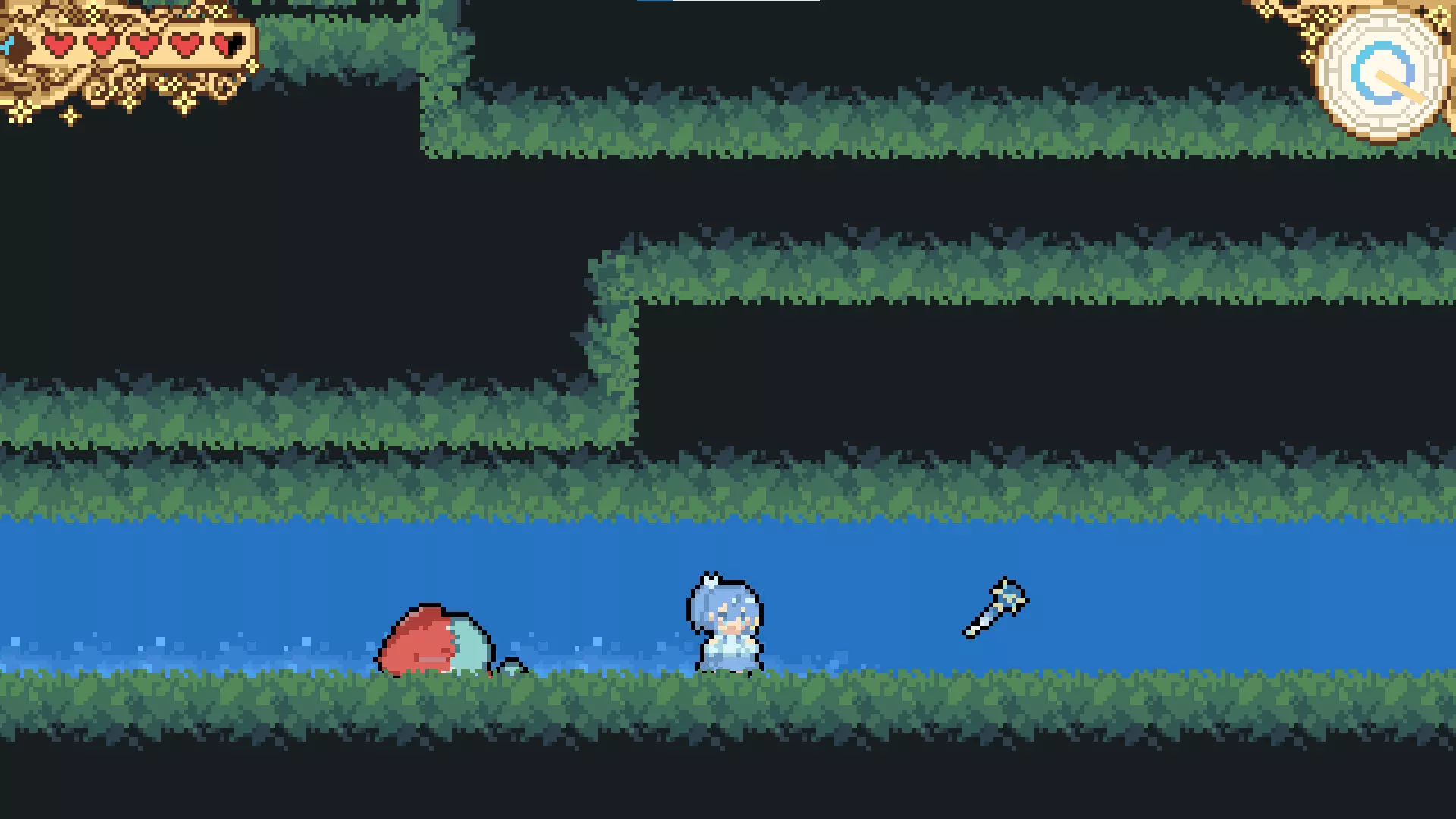 找到它们并完成关卡后,会在大地图解锁一个额外的门。 关卡1 在第2个检查点(就在你击败Ankimo之后),会有一个长有灌木丛的平台。从上方落到该平台上,然后向左走即可找到魔杖。