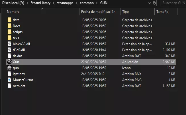 如何将游戏翻译成西班牙语 你们可以在以下链接获取翻译: 提取内容并粘贴到游戏根目录。如果不知道根目录在哪里,只需在Steam中右键点击游戏,选择属性 > 已安装文件 路径通常是“我们的磁盘 > Steamlibrary > Steamapps > common > GUN” 如何解锁游戏60 FPS 1) 首先,我们必须创建游戏可执行文件的备份。 为此,我们再次进入根目录。复制可执行文件“GUN”并将其安全地保存在其他位置。