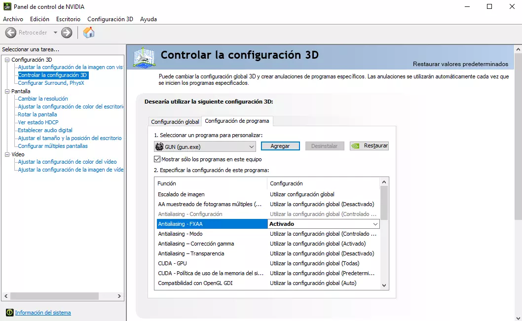 在显卡控制面板中启用FXAA。以我的NVIDIA显卡为例,操作步骤为:打开NVIDIA控制面板 > 管理3D设置 > 程序设置 > 添加程序 > 添加【GUN】的可执行文件,然后启用FXAA。