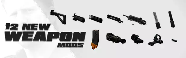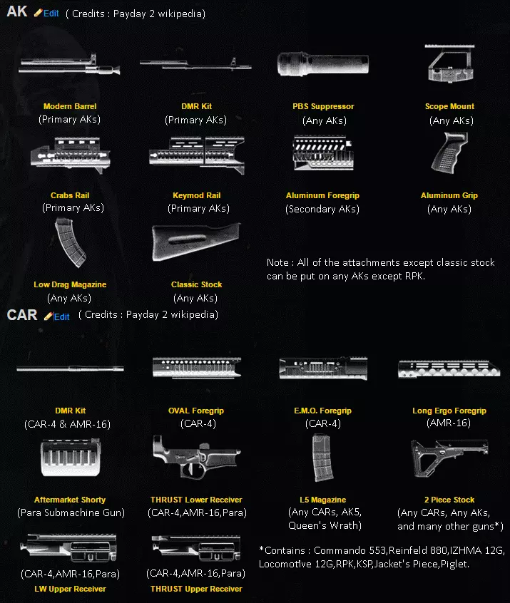 - 减少一半的换弹时间 - 仅可装备于CAR/AK及少数其他武器系列(注:UAR步枪 - JP36步枪 - AMCAR步枪 - AMR-16步枪 - AK5步枪 - 女王之怒步枪 - AK步枪 - AK.762步枪 - 黄金AK)762步枪 - 科布斯90冲锋枪 - PARA冲锋枪 - CR 805B冲锋枪 - 马克10冲锋枪 - 克林科夫冲锋枪 - 希瑟冲锋枪 - 双持希瑟冲锋枪 - 双持克林科夫冲锋枪) 斯巴达枪托(紧凑型5)+ 唯一提升稳定性的枪托 启蒙握把(紧凑型5)+ 唯一提升精准度的握把 + 集成手电筒 45度红点瞄准镜 + 比斜置机械瞄具更易用 + 可装配于非狙击步枪 - 红点不可更换,仿佛不被视为瞄准镜 箱型伙伴瞄准镜(狙击步枪)+ 最高倍率(与西奥亚瞄准镜搭配)+ 瞄准时有自动标记特殊单位/守卫功能 + 箱型镜体而非圆形 - 由于《收获日2》的设定,瞄准镜会偏离中心晃动屏幕。这使得精准瞄准变得更加困难 侦察瞄准镜 + 附带测距仪 - 不会标记特殊敌人 唐纳德的水平校准器(霰弹枪) + 使霰弹枪弹道水平扩散(基本类似于《战地4》中的鸭嘴枪口) 【33】疤面煞星角色包
