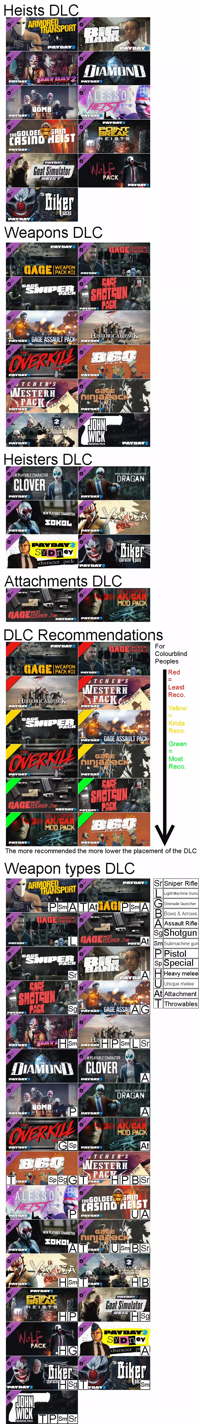 我对旧版DLC(可下载内容)指南进行了更新,但在Overkill将所有先前的DLC整合进本体游戏后,他们又开始推出更多DLC了。 legacy部分 大多数DLC已合并到遗产包中 各位仍在阅读本指南的玩家,大家好。 如果你正在阅读本文,且尚未购买所有DLC,那么我向你介绍【遗产包】,其中包含所有你尚未拥有的DLC。 由于Overkill决定推出更多独立于遗产合集的DLC,本指南可能仍将发挥其作用。但经过多次更新后,大多数武器的属性可能已完全改变。我需要一些时间来编辑本指南中的大部分属性数据或推荐内容,因此才有了“翻新中版本”。 简介 欢迎来到DLC指南2.0:重制版 之所以创建本指南,是因为Overkill推出了数量庞大的DLC(确切地说,有36个DLC,并且还在增加中,不包括免费DLC),如果你想在基础游戏中获得更多内容,这些DLC可供选择。 本指南主要介绍每个DLC的优点和缺点,是否购买由你自行决定。 你可能听说过本指南的第一版,它大致在第90号更新时停止更新,当时2015年“犯罪盛宴”活动取代了之前的内容,改变了一切。第二个版本只是对第一个版本的重制,简化了优缺点和评价内容。 本指南的格式如下: 【DLC名称】 【价格】 【DLC内容】