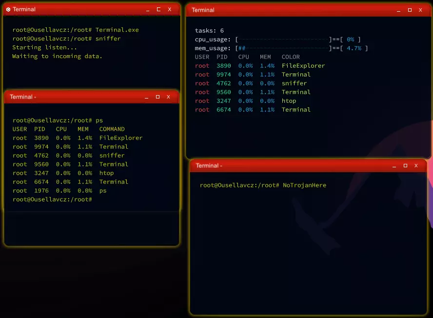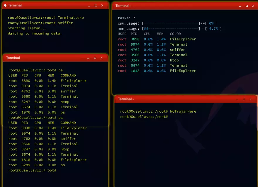 这显然是一个进程试图伪装成另一个进程的情况,目的是进行一些恶意活动。 终止该进程并从你的所有设备中删除该软件。 这就是为什么你必须留意细节,因为重命名进程只是人们用来隐藏恶意软件的众多混淆手段之一。你必须注意任何意外的不一致之处。 另一件需要注意的事情是,当你启动程序时,程序启动了不止一个进程,因为某个程序可能会同时启动一个合法进程和一个恶意进程来分散你的注意力。 再次强调,仔细监控htop或ps命令对于发现这些情况至关重要。 在这个案例中,我们处理的是一个非常基础的远程shell命令,因此嗅探器没有检测到任何异常。需要记住的是,一个程序通过了你的某项测试,并不意味着它没有恶意。这只说明它通过了你所测试的那一项特定内容。最好的建议仍然是:不要运行任何你不信任的软件。但如果你无论如何都要运行,一定要小心操作,并且远离你的“家”(指个人重要系统或网络)。 额外内容 - 嗅探器的实际应用 嗅探器软件是检测特定位置异常流量的好工具。假设某个程序传输了其运行位置的IP和SSH详细信息,那么我们的嗅探器就能捕捉到与该位置之间的任何异常流量。下面简单展示一下它的工作情况,让你知道需要留意什么。