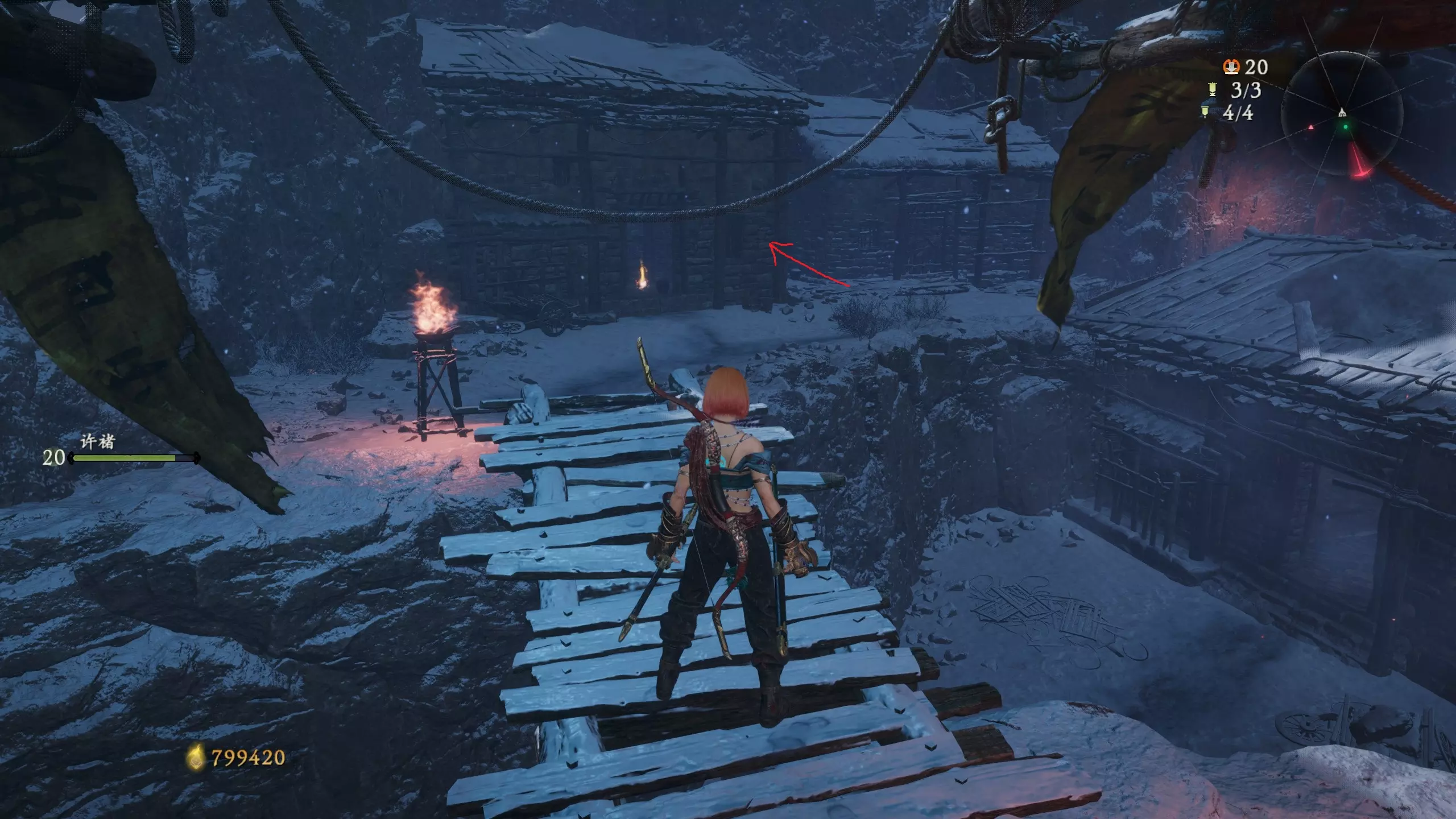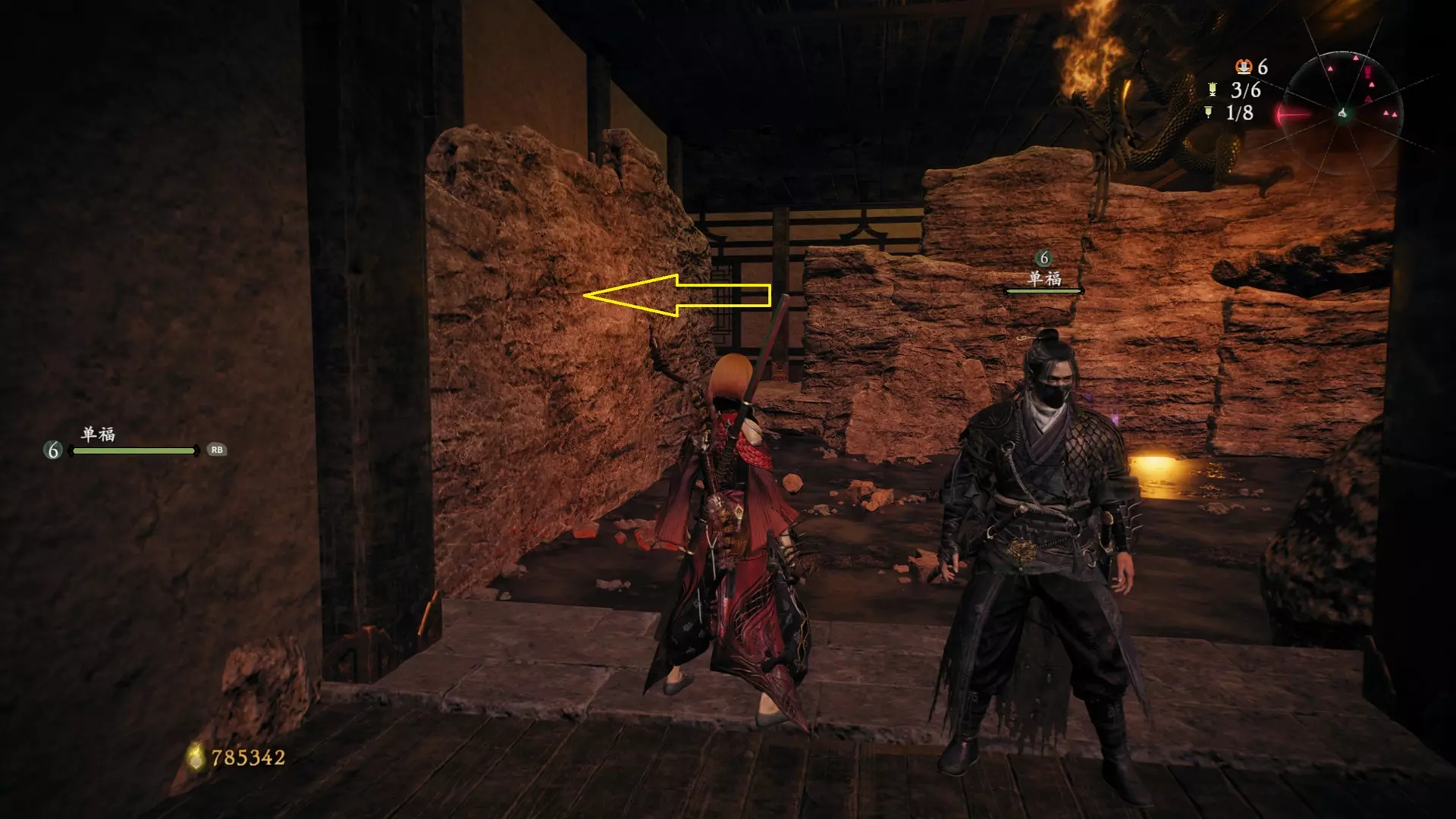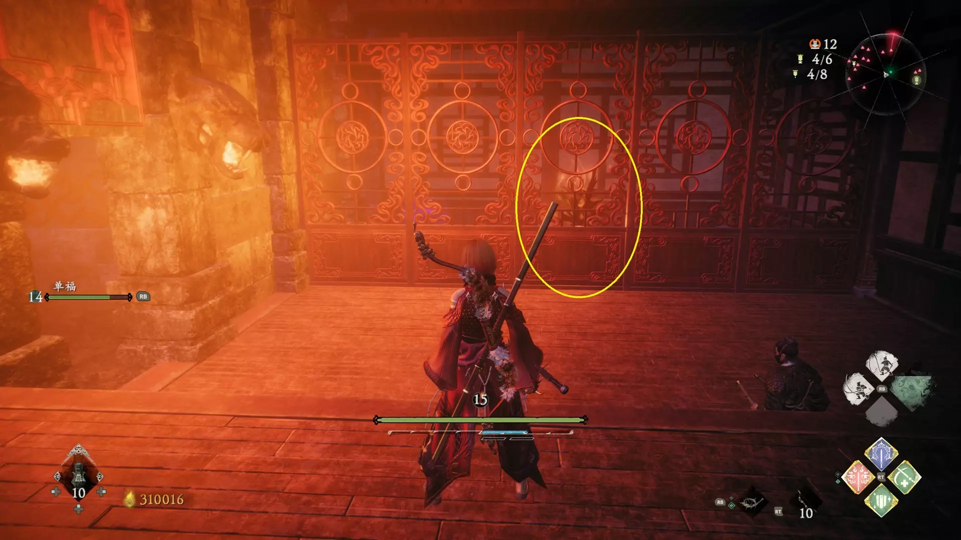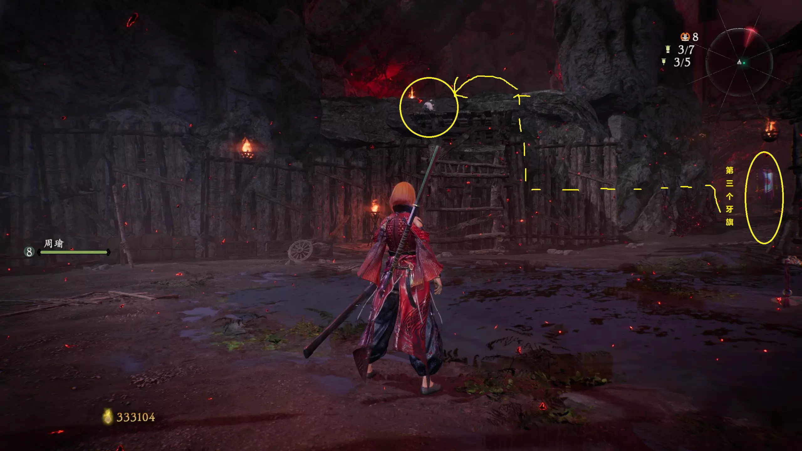 返回第三个牙旗处,这次从左侧门进入,到达火焰区域。前方木质镂花墙后方,需要从火区或上方平台通过。