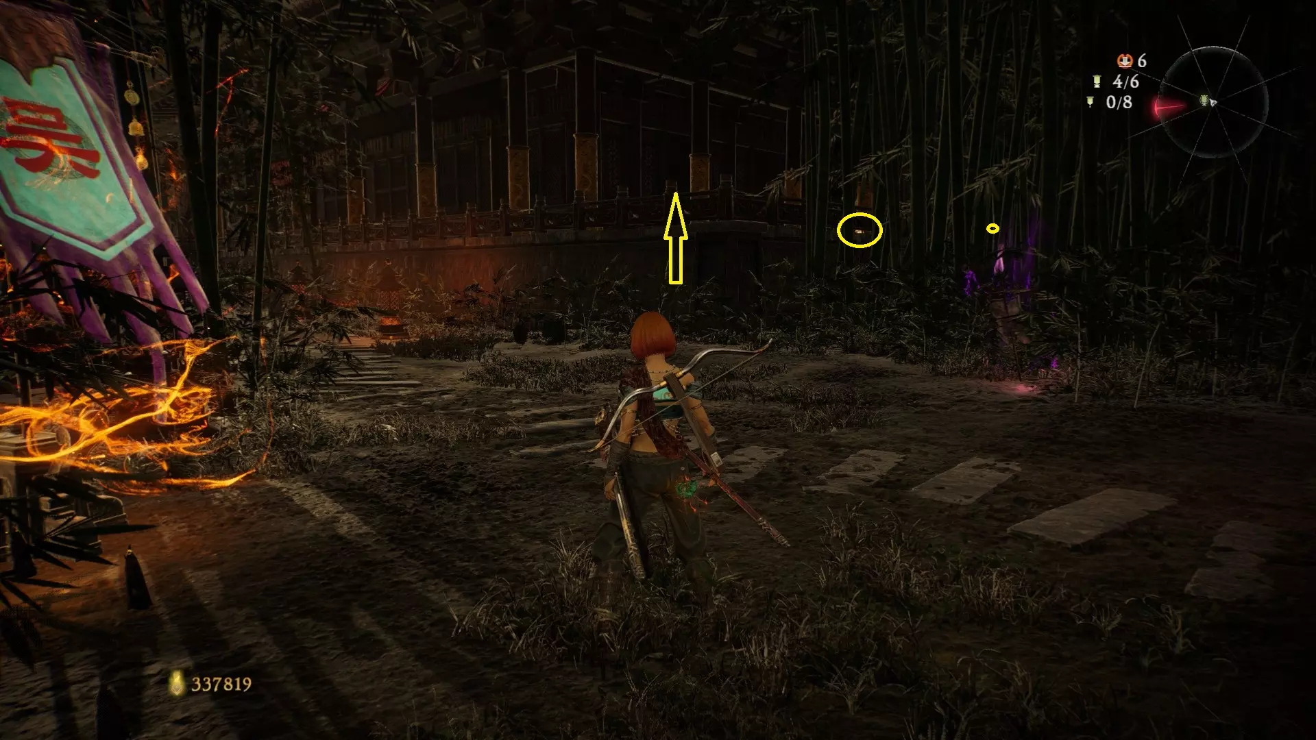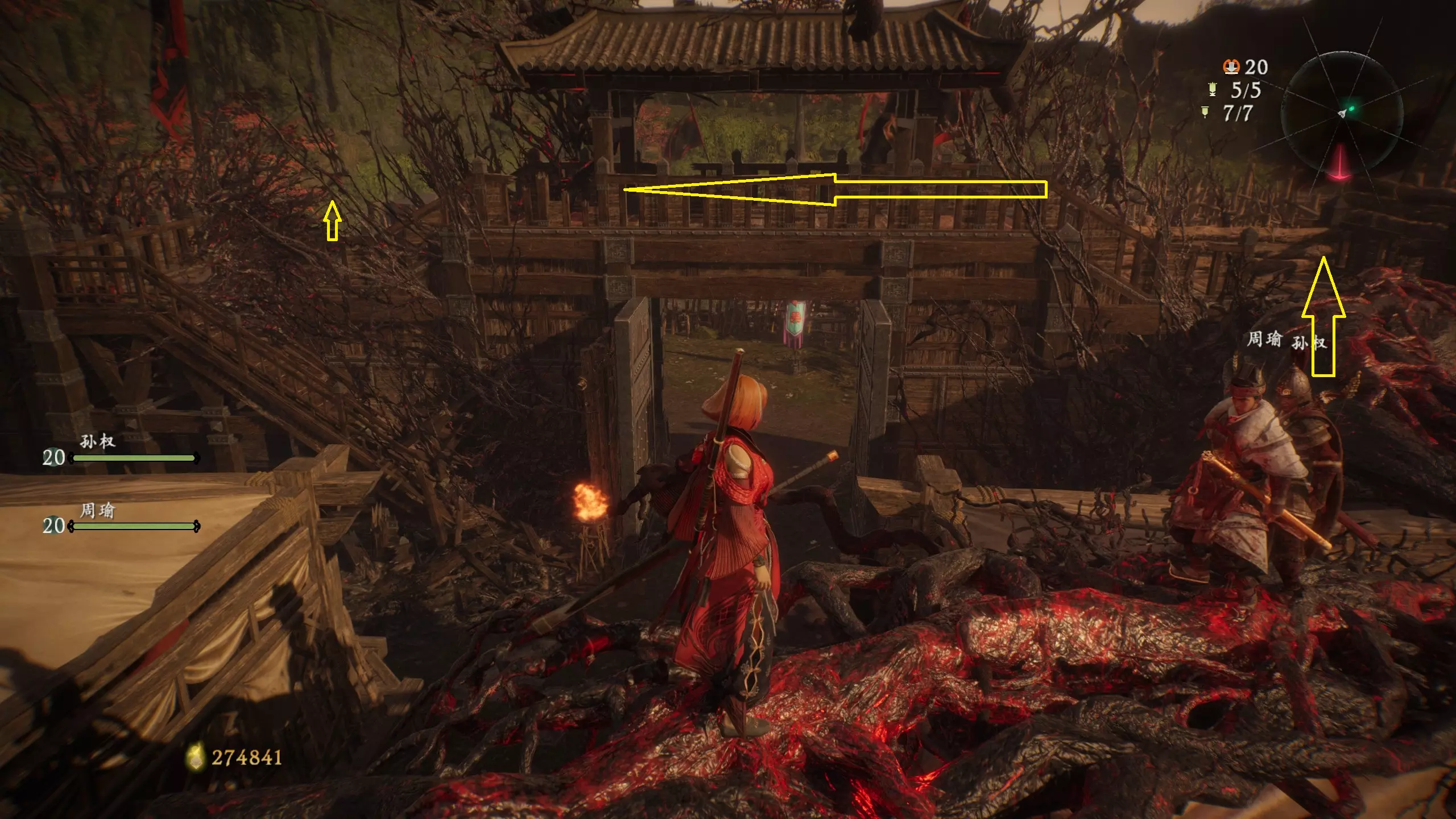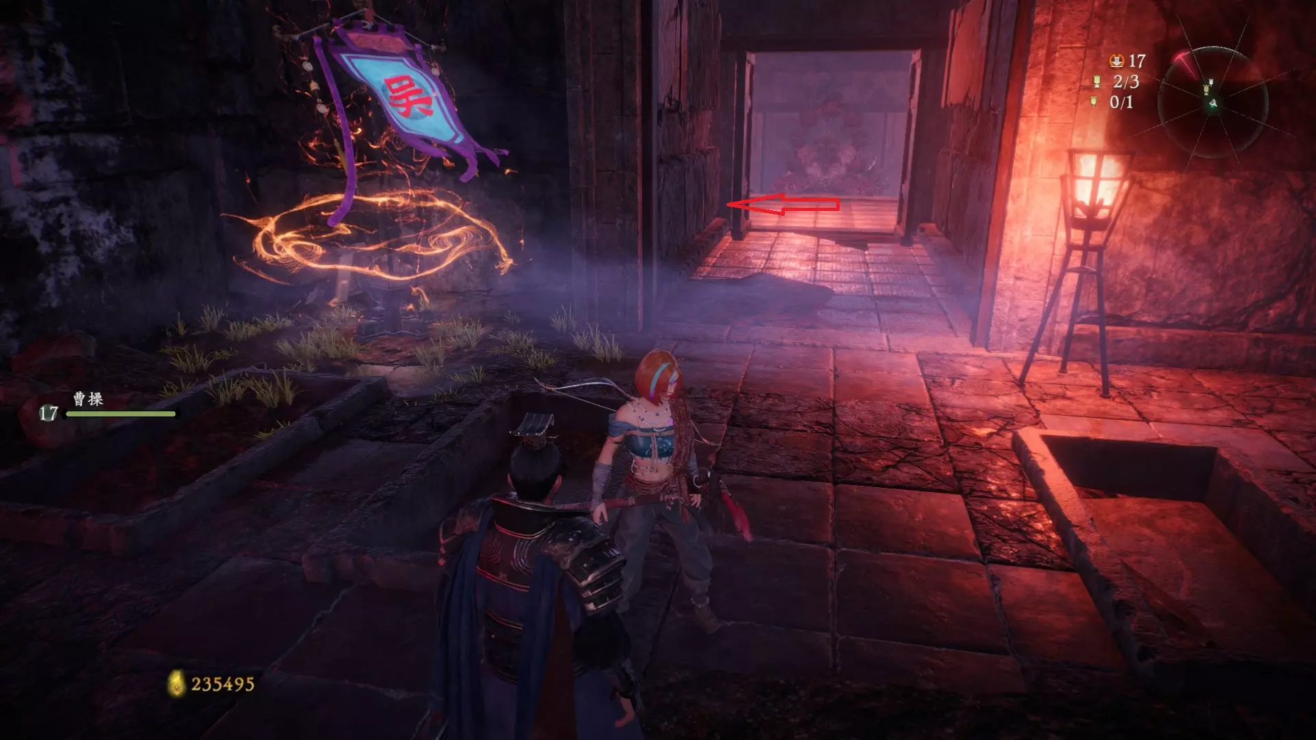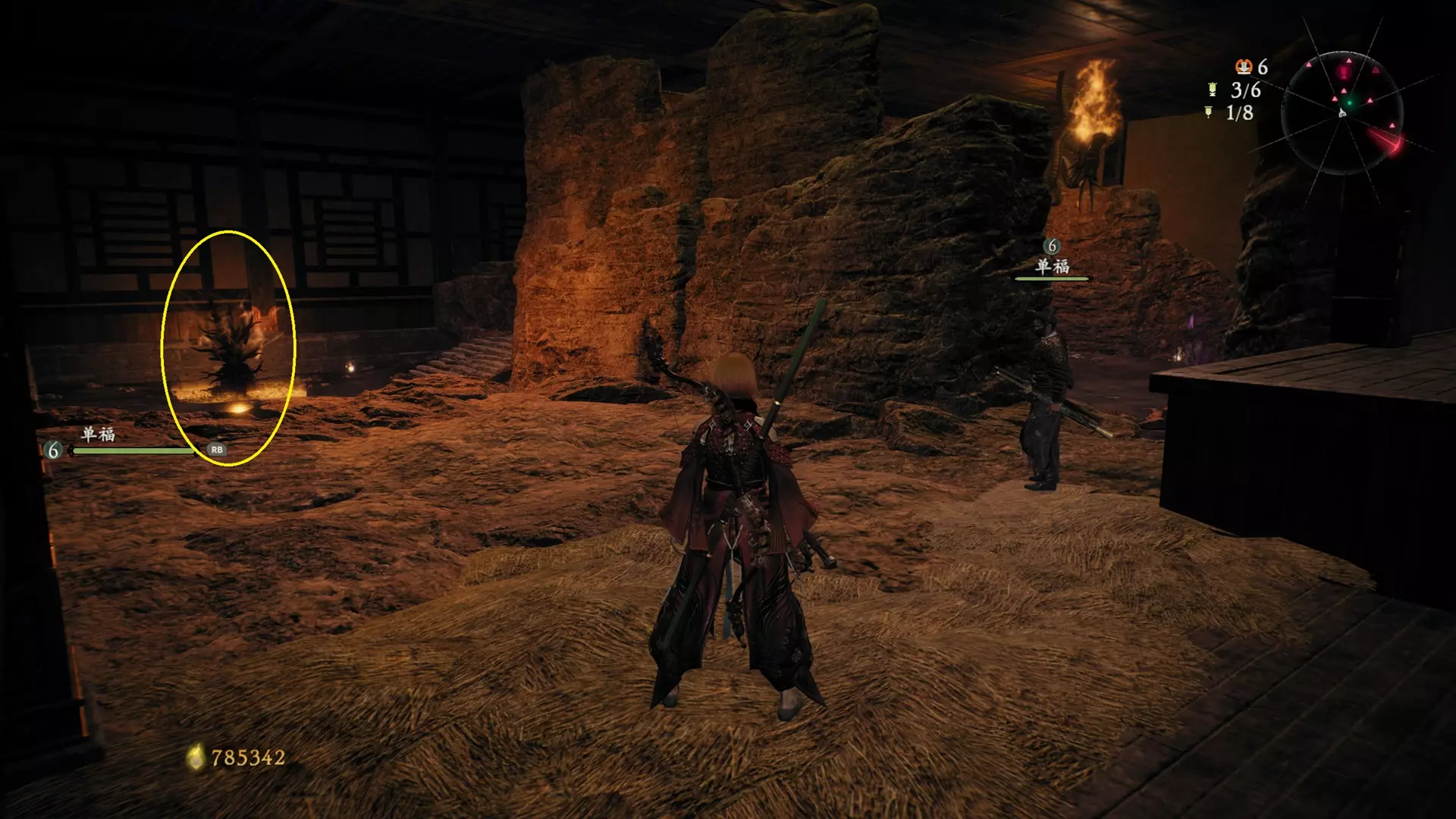返回第三个牙旗处,这次从左侧门进入,到达火焰区域。前方木质镂花墙后方,需要从火区或上方平台通过。