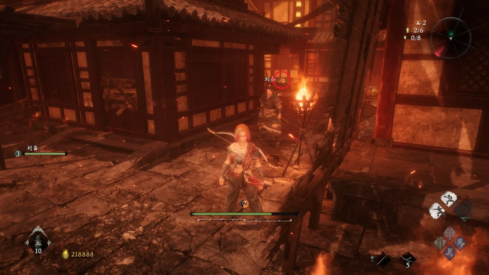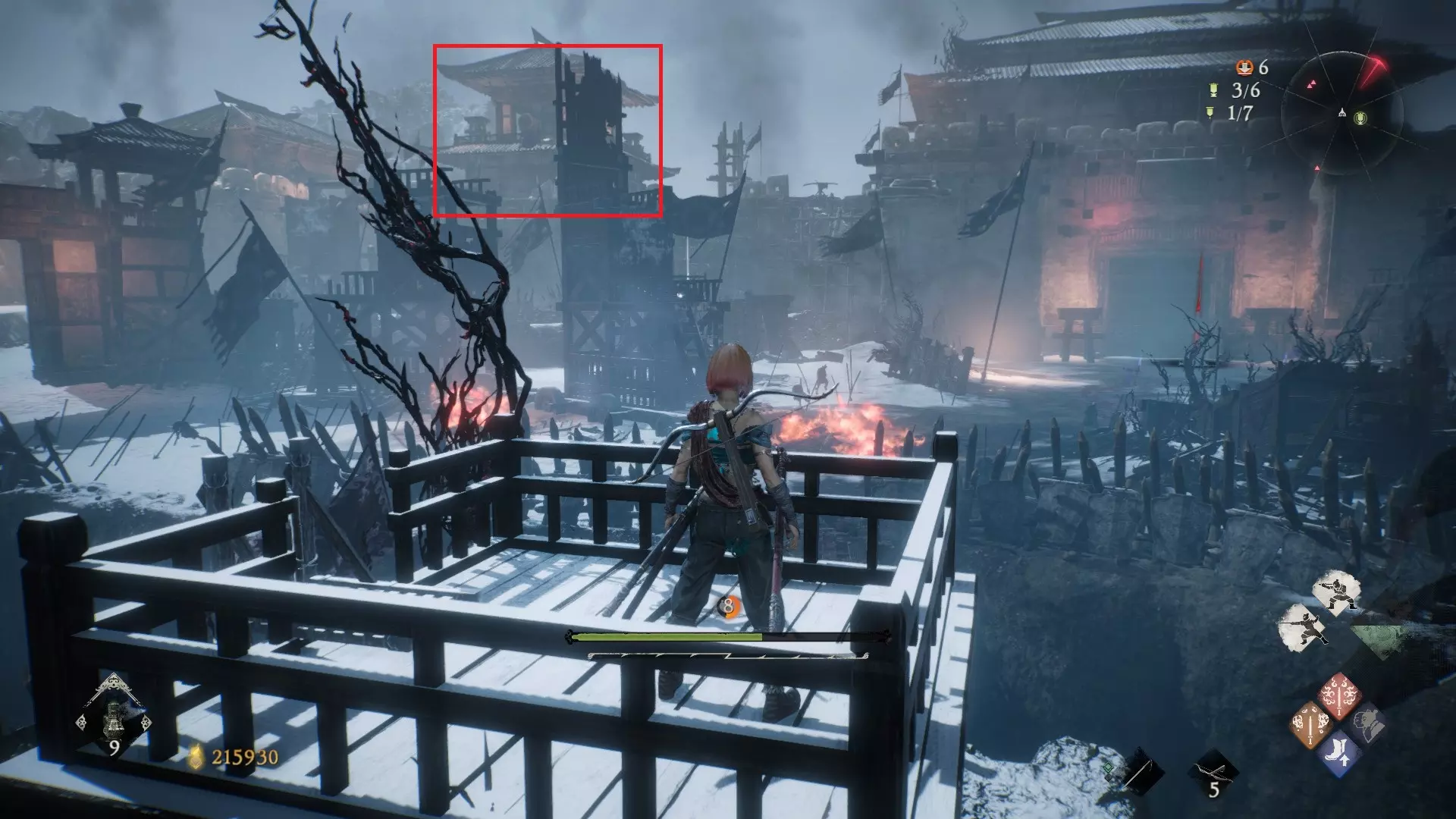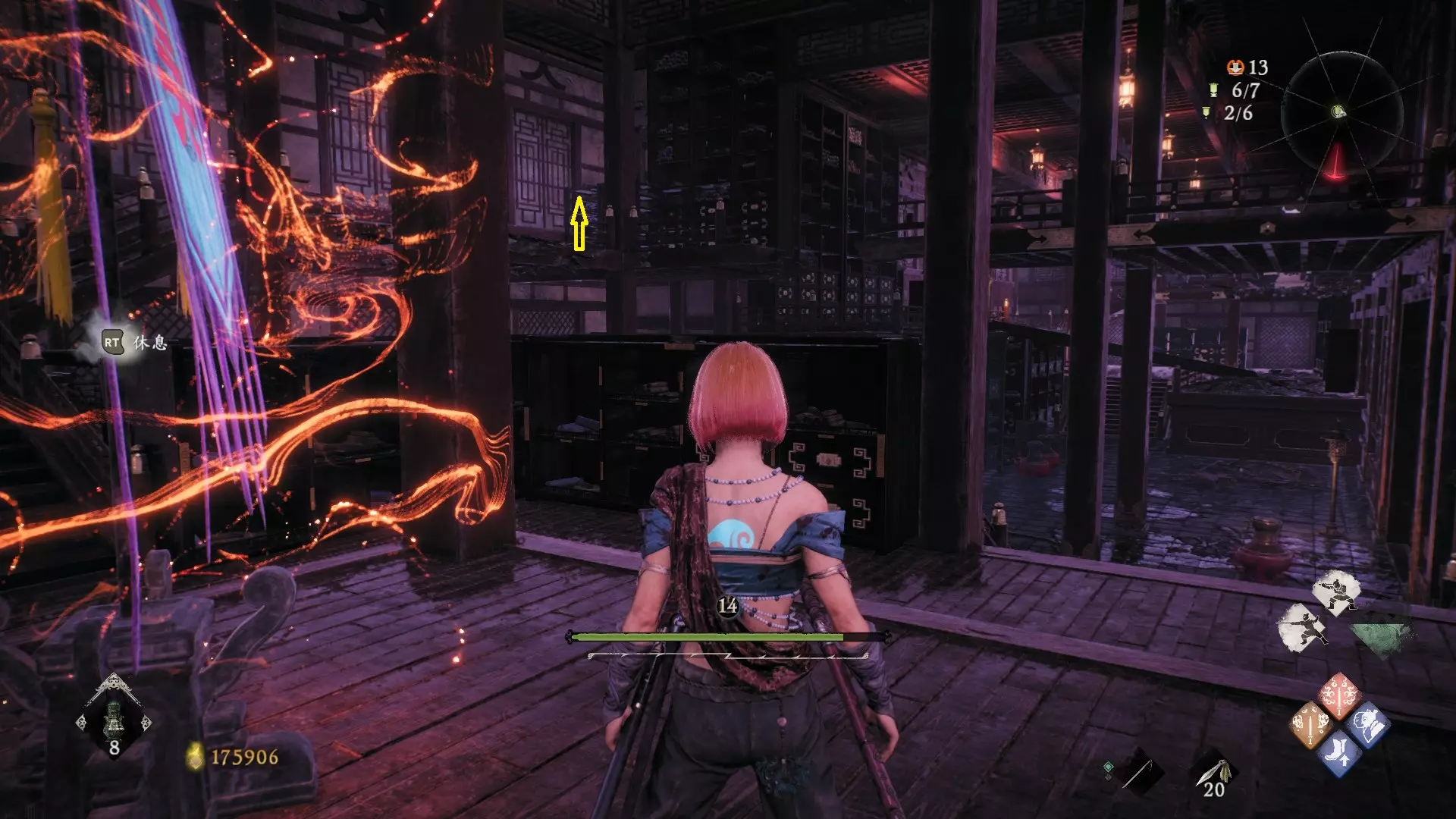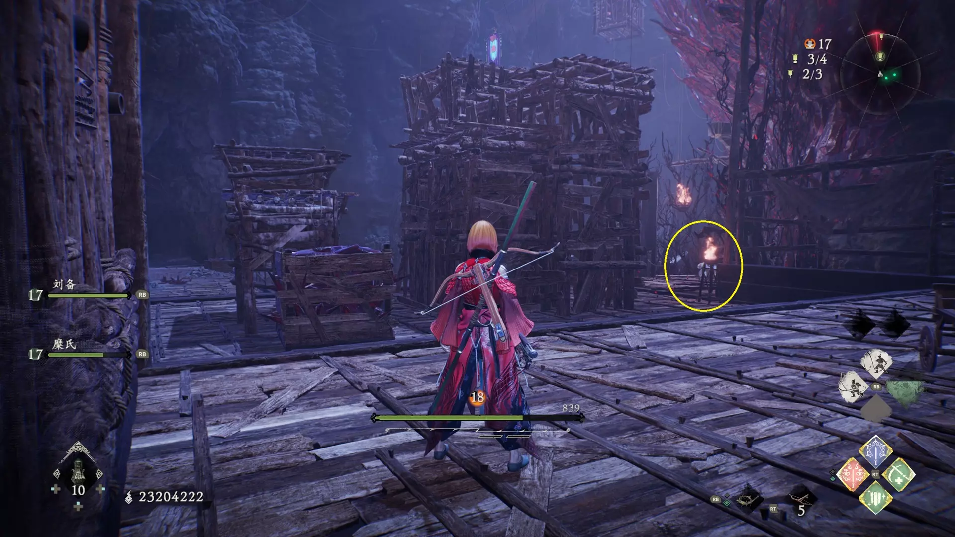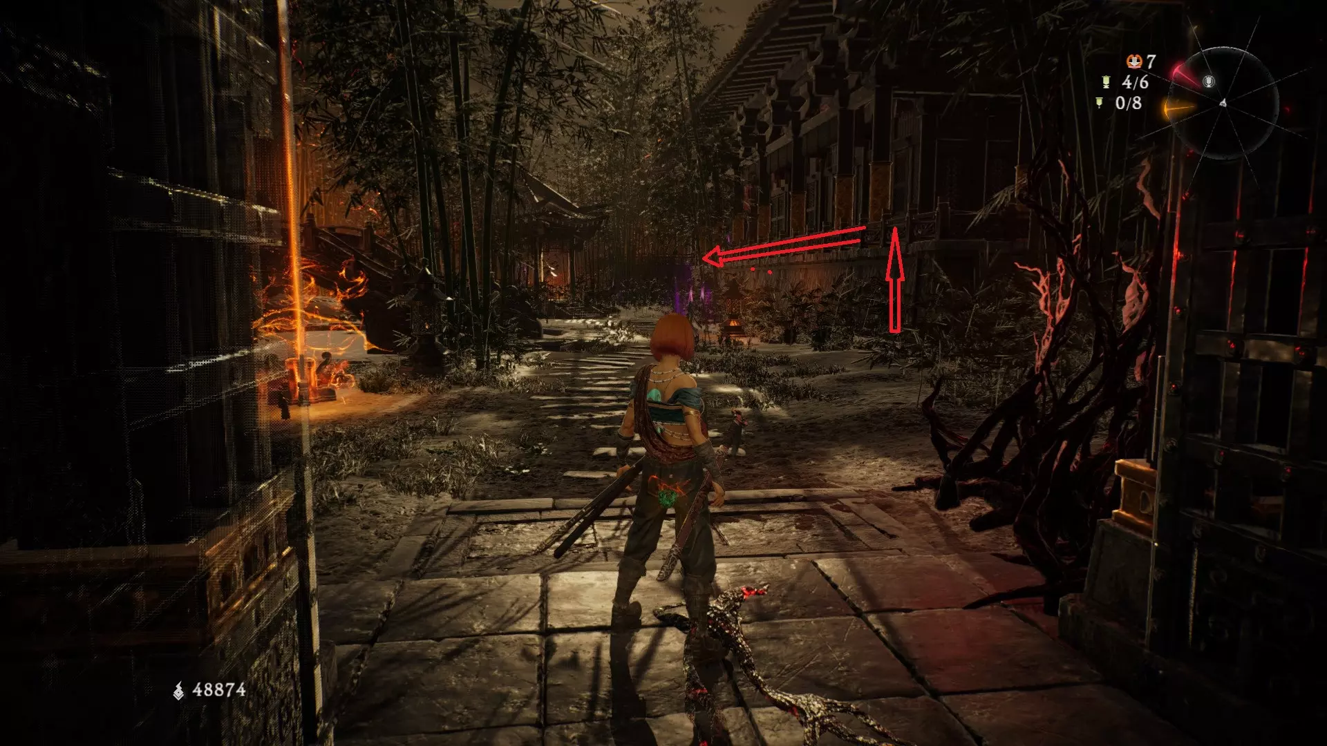 返回第三个牙旗处,这次从左侧门进入,到达火焰区域。前方木质镂花墙后方,需要从火区或上方平台通过。