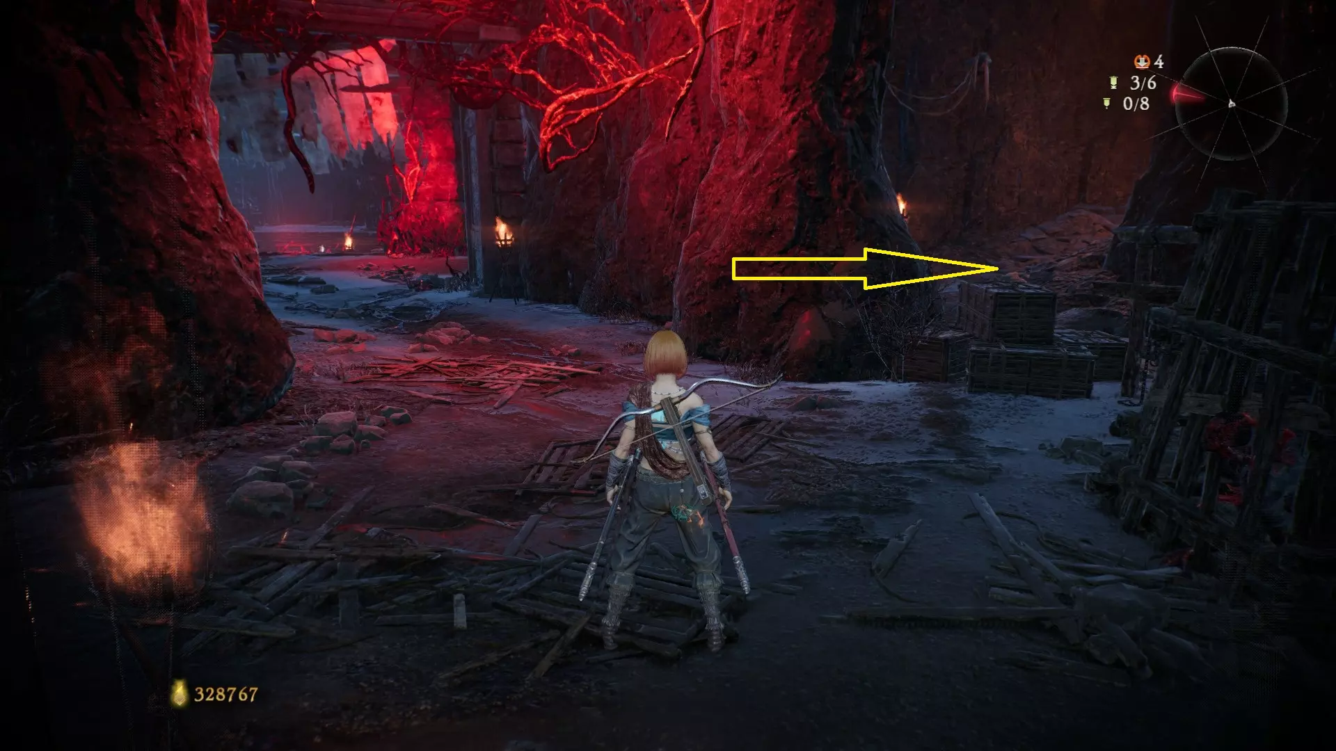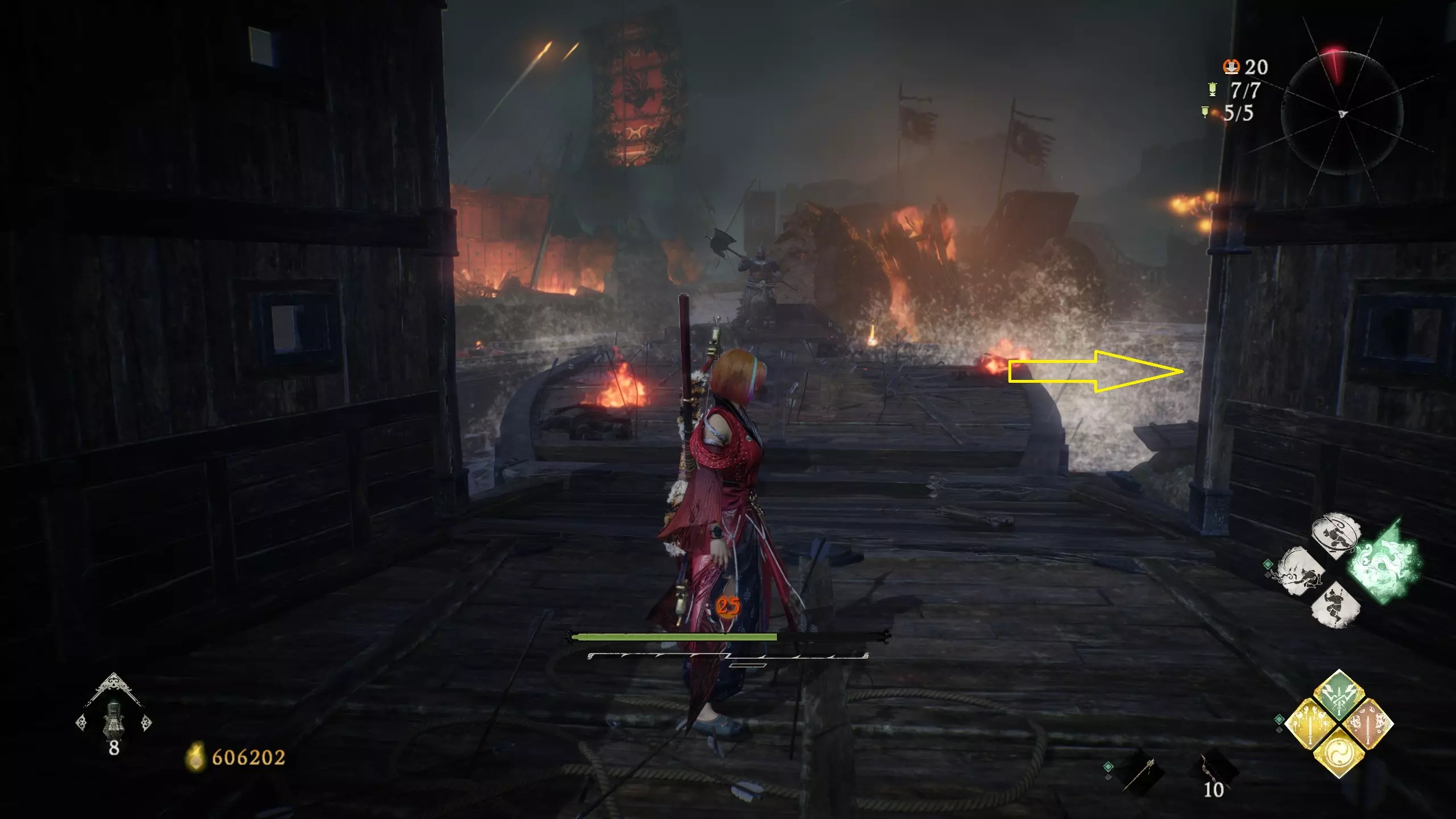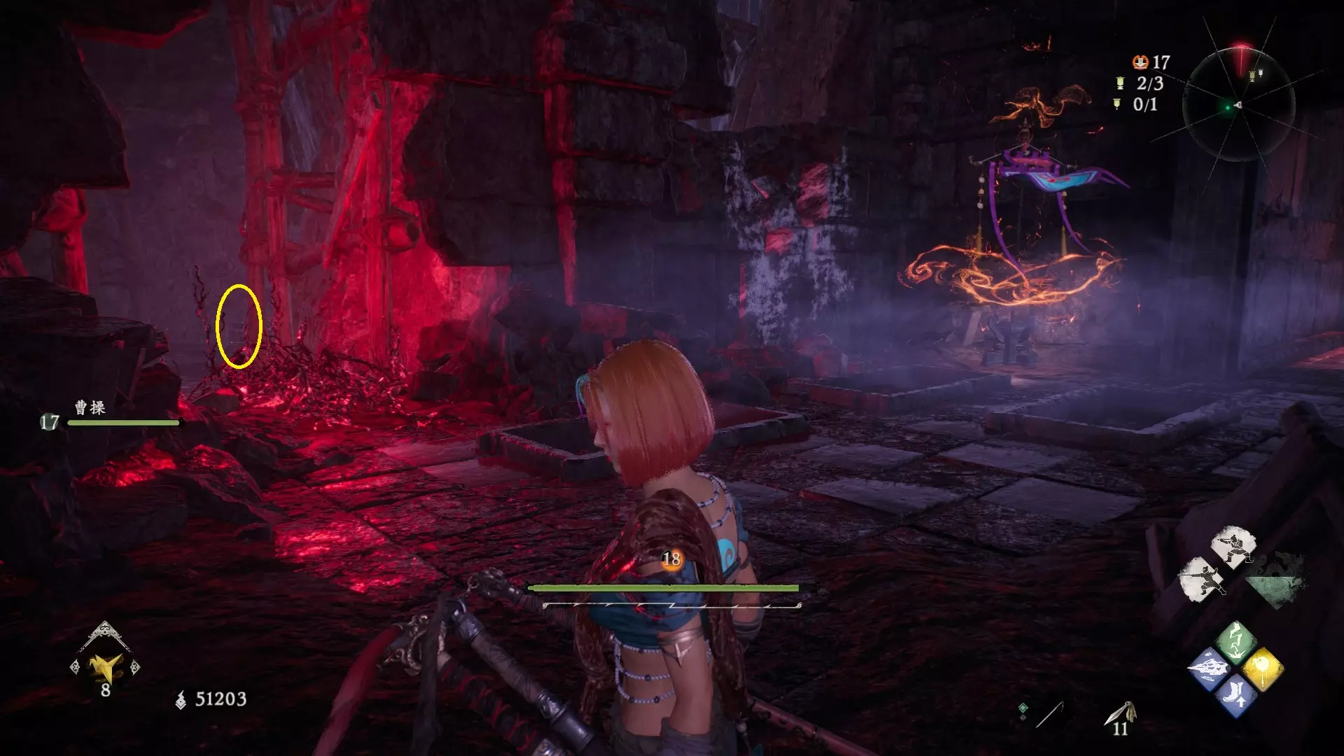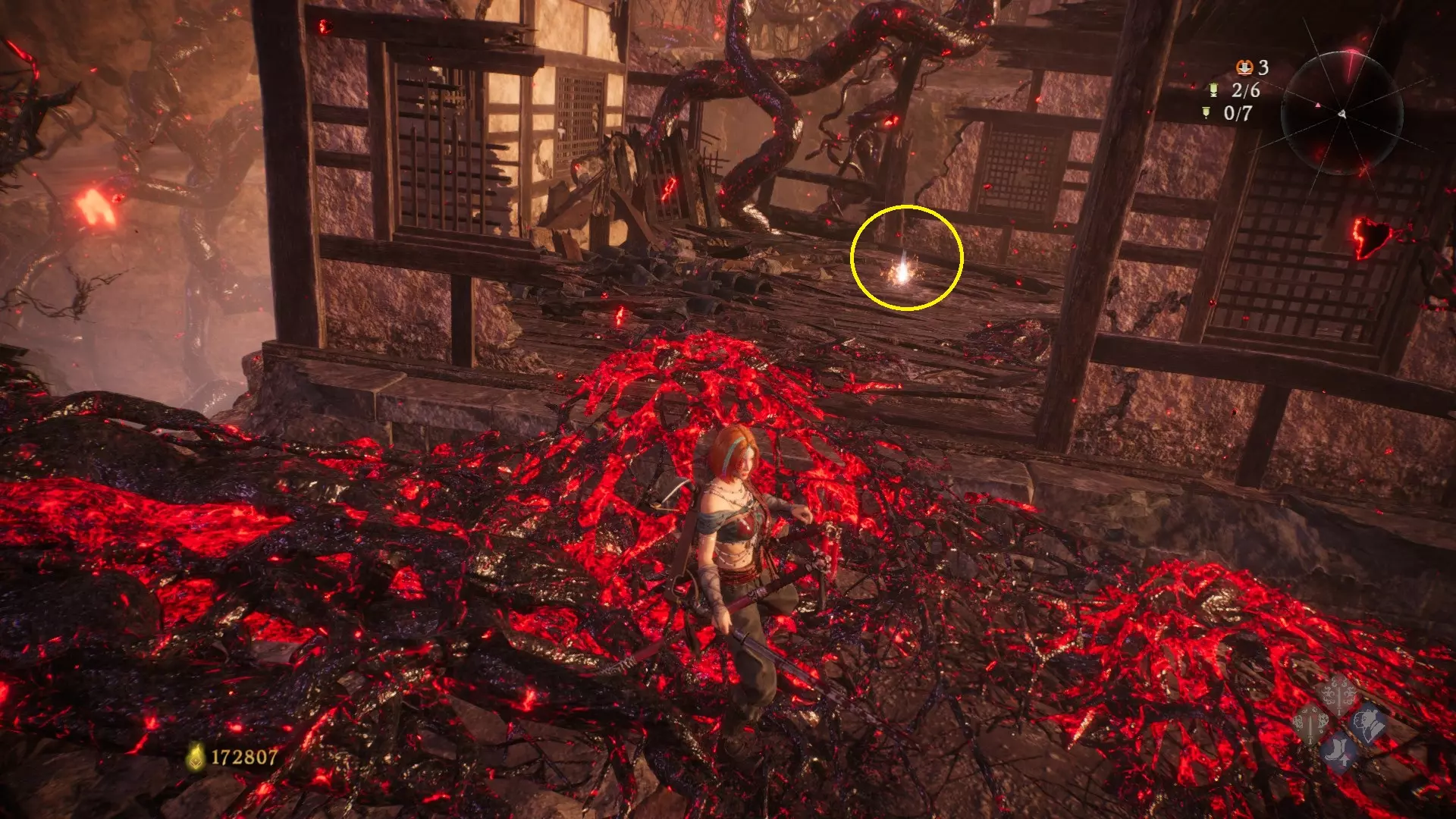 返回第三个牙旗处,这次从左侧门进入,到达火焰区域。前方木质镂花墙后方,需要从火区或上方平台通过。