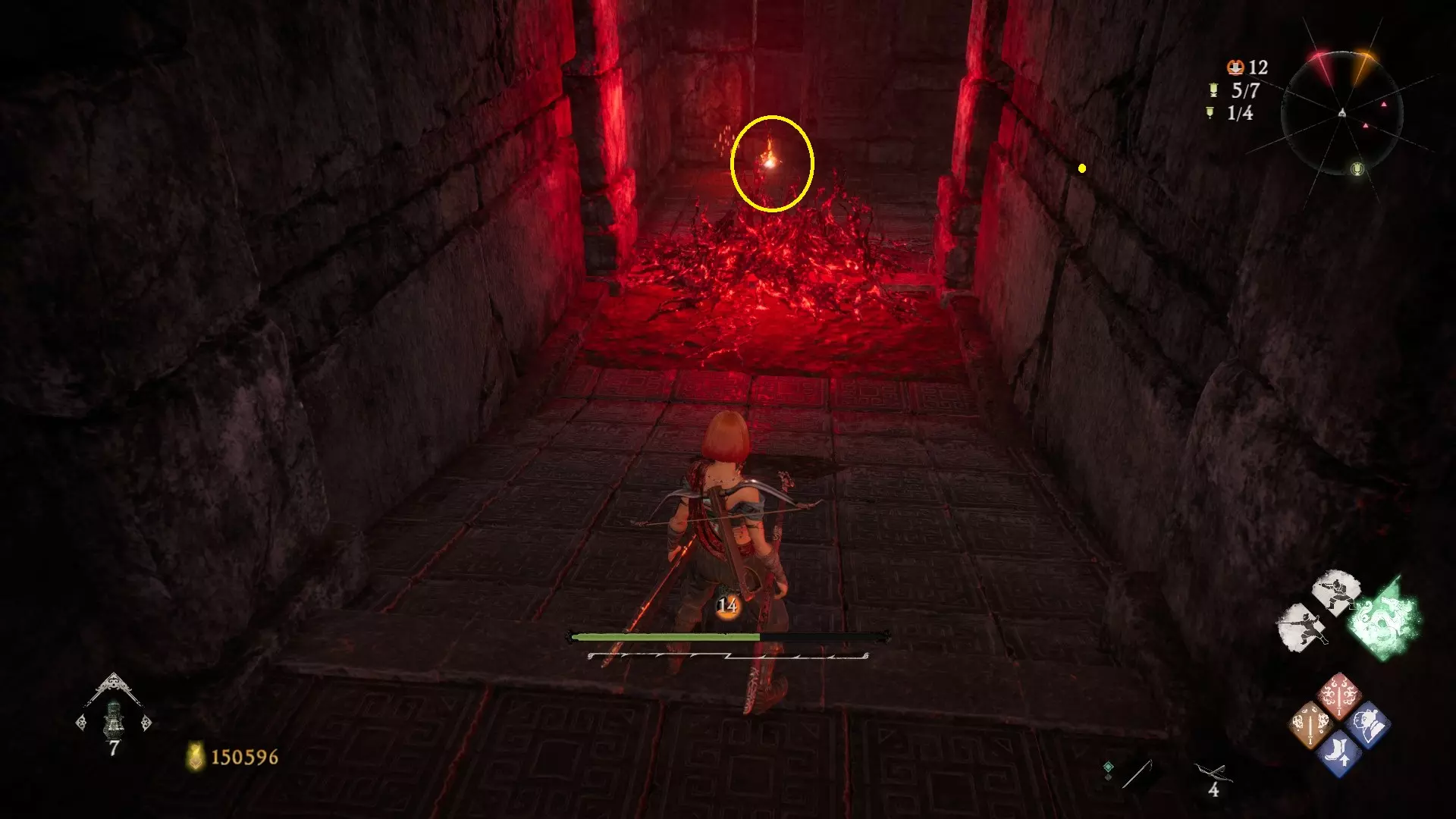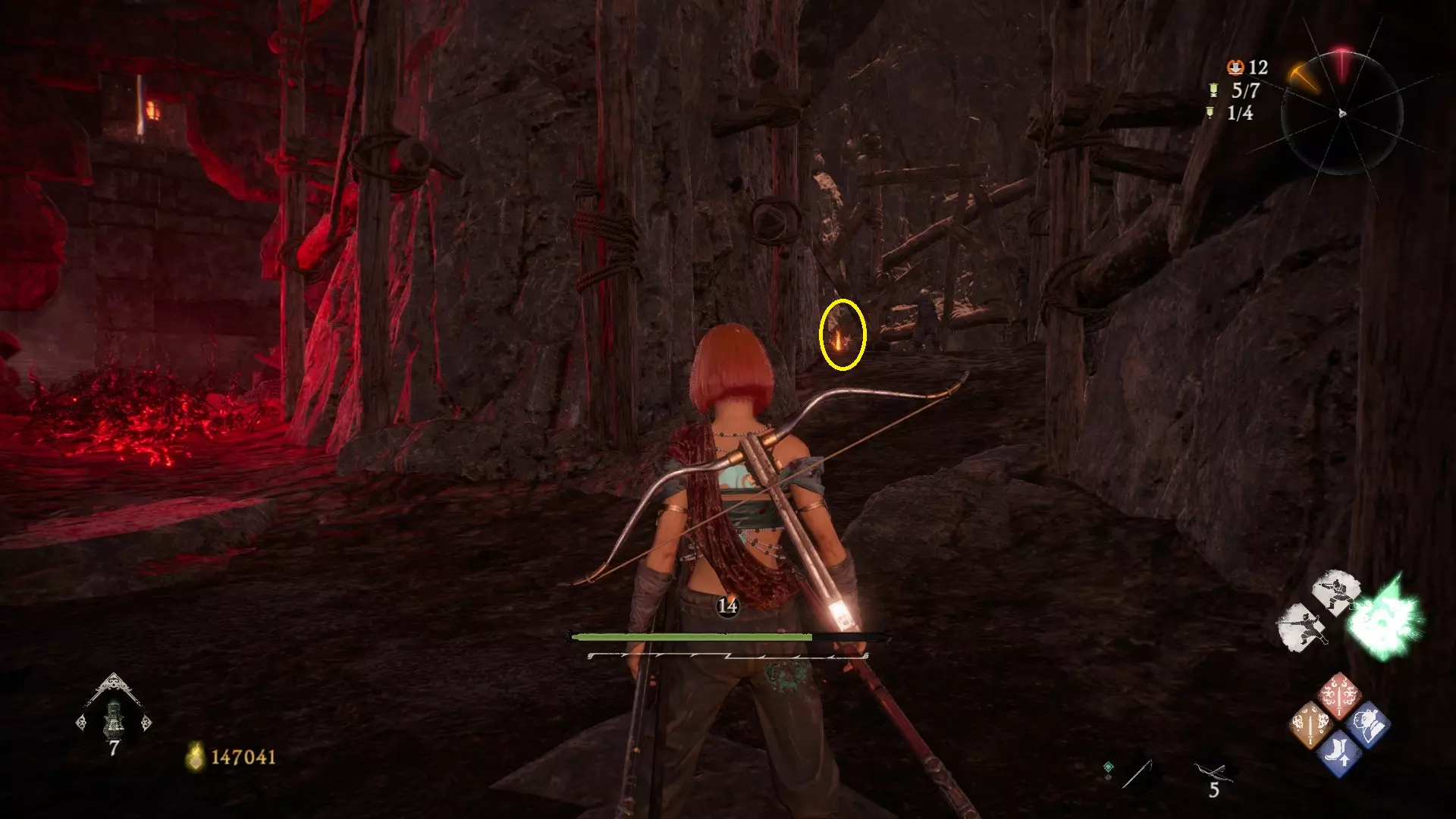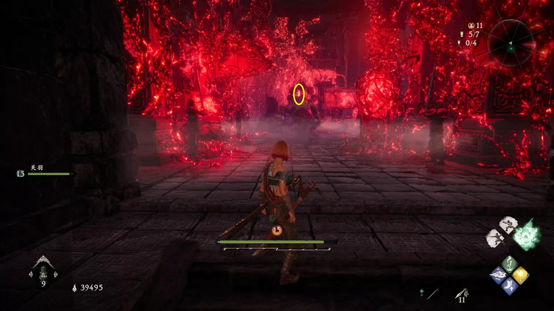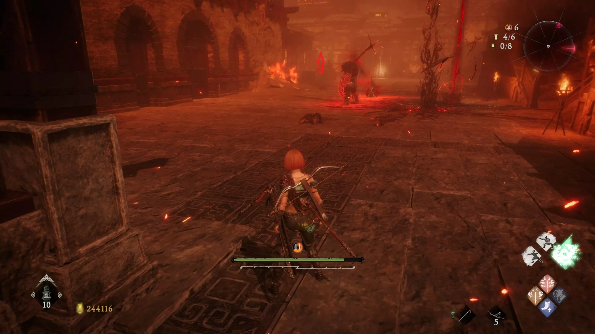 返回第三个牙旗处,这次从左侧门进入,到达火焰区域。前方木质镂花墙后方,需要从火区或上方平台通过。