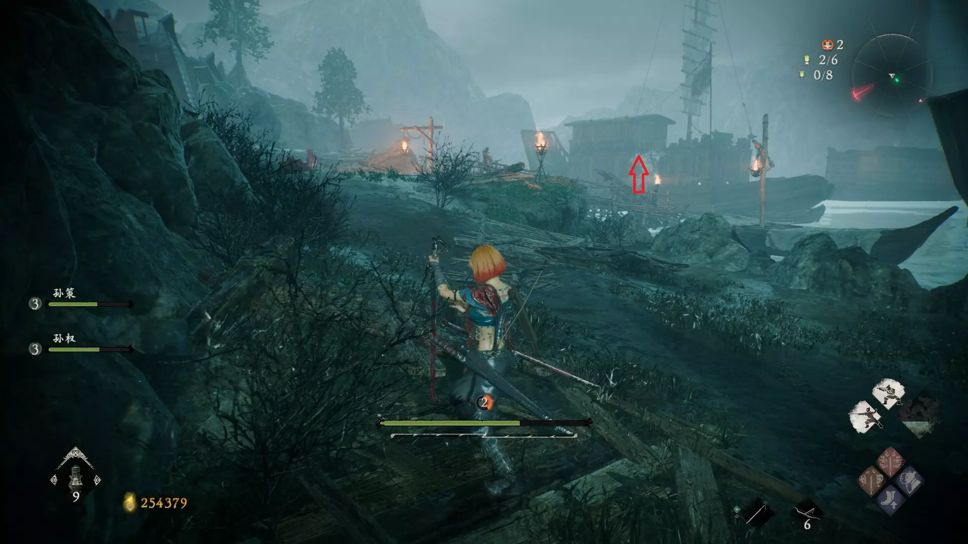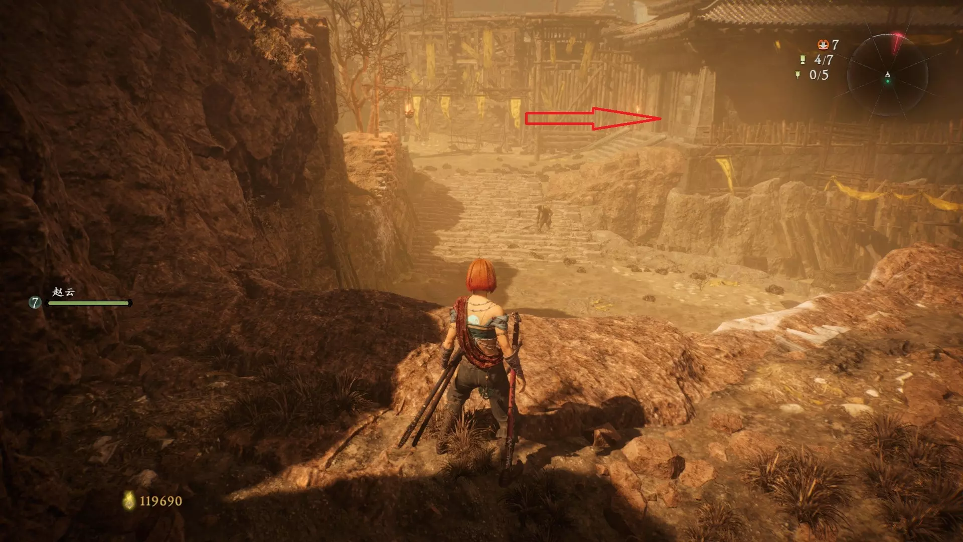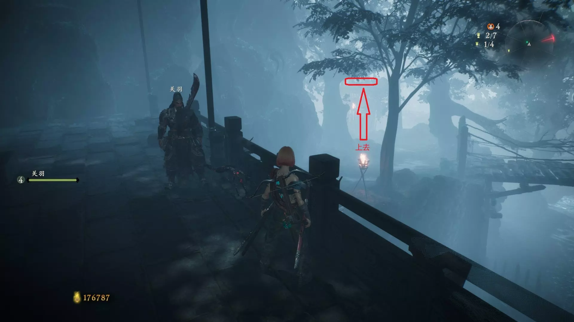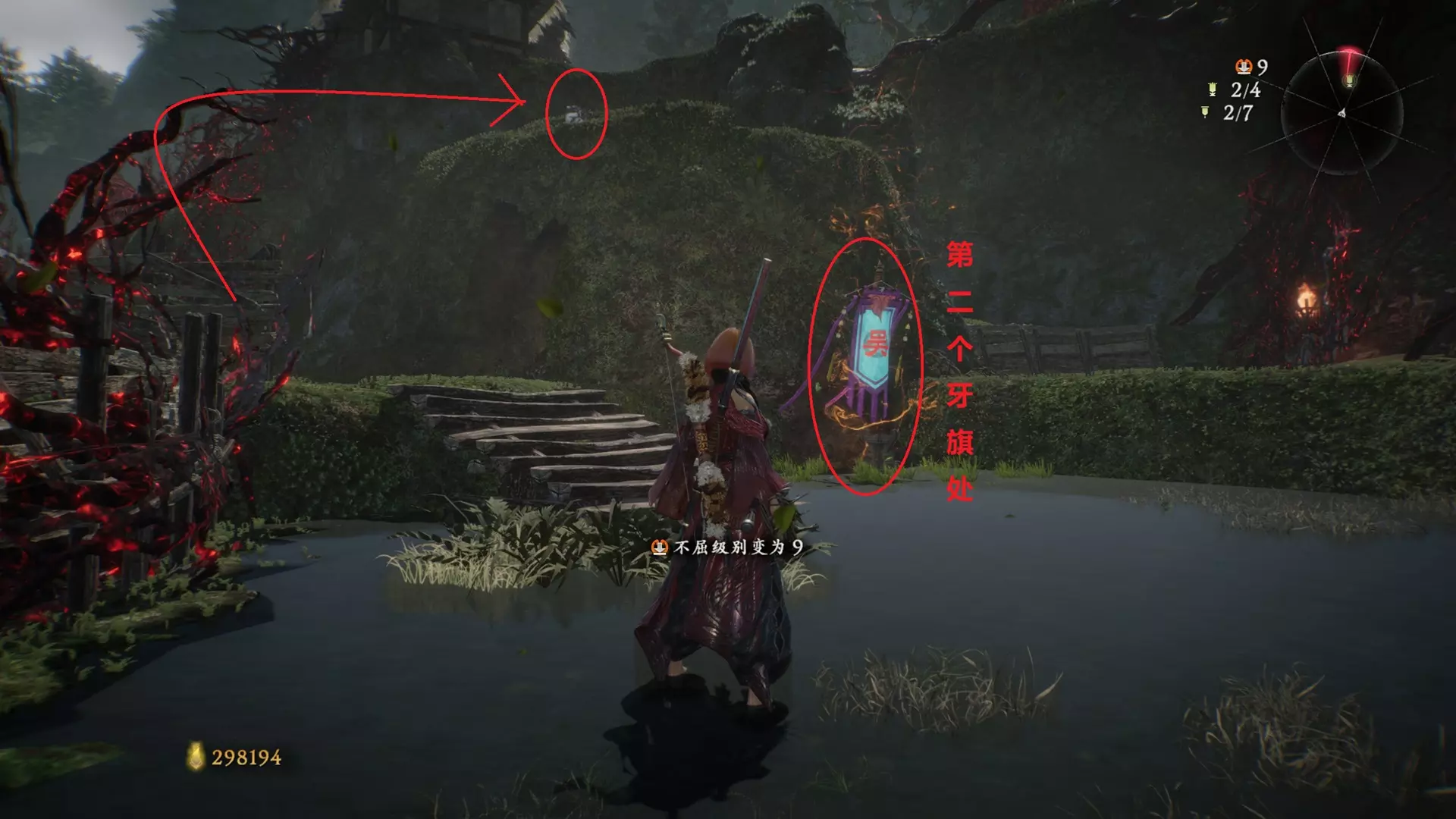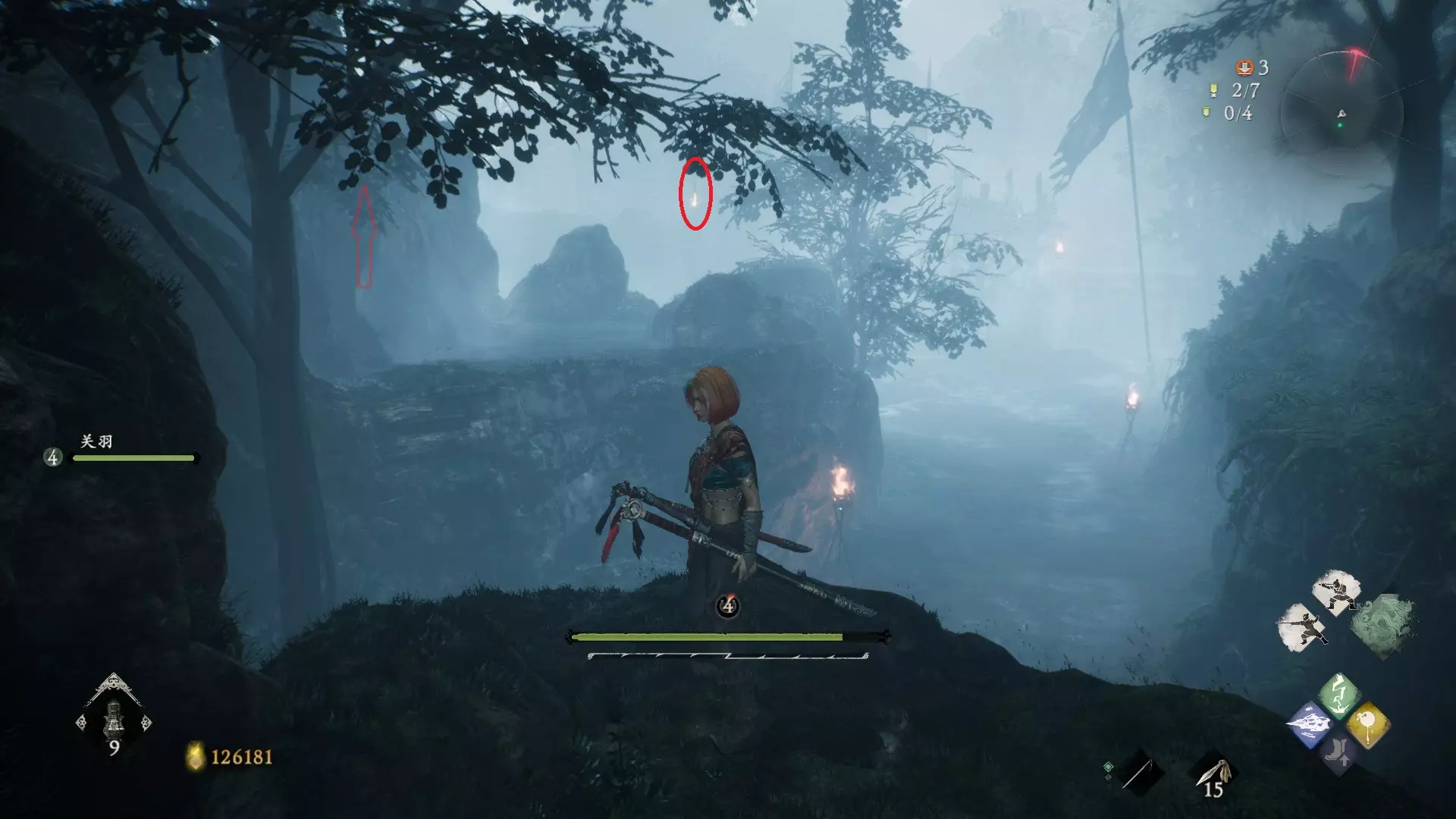 12 第六章 横刀望白马 解锁第二个牙旗后,刚进入雾区下第一个台阶就能看到,从箭头所指方向可以上去