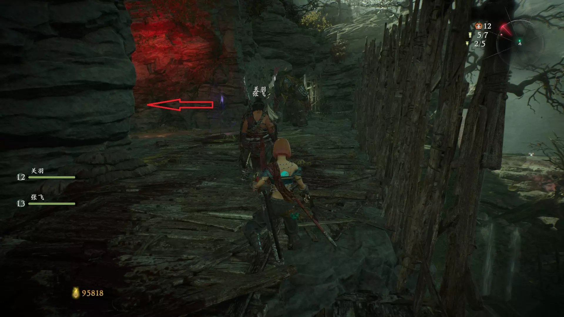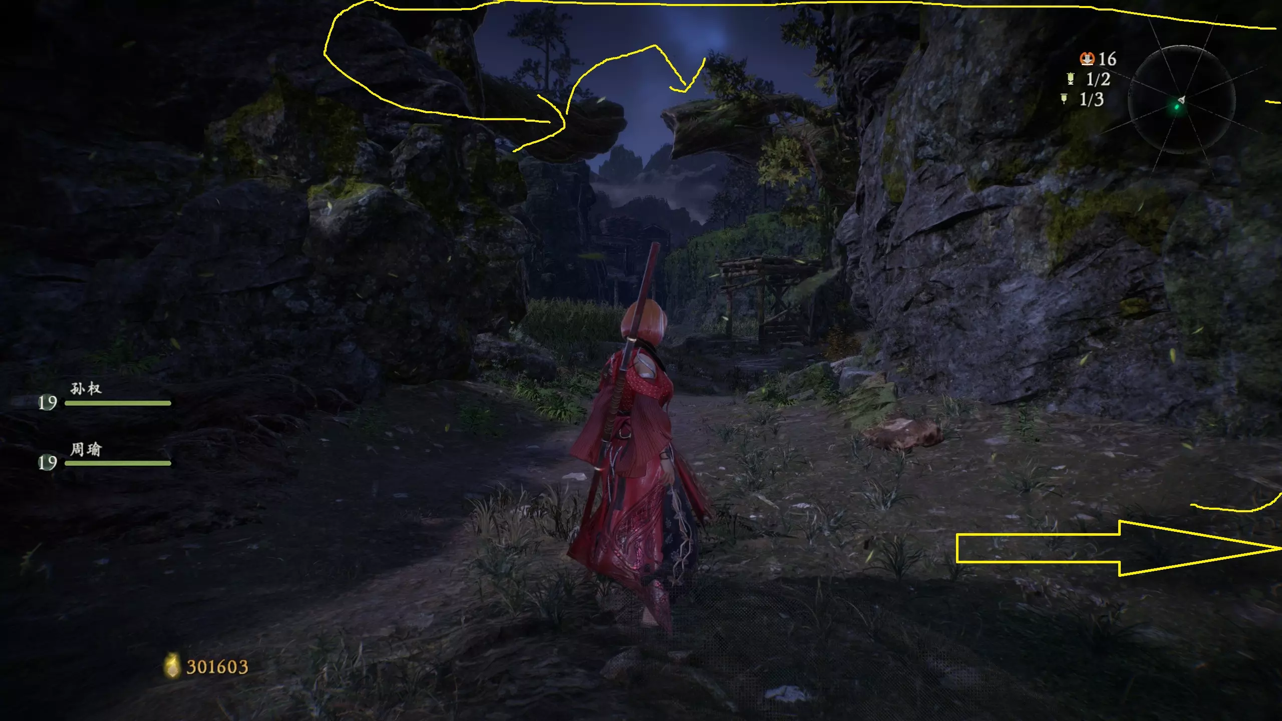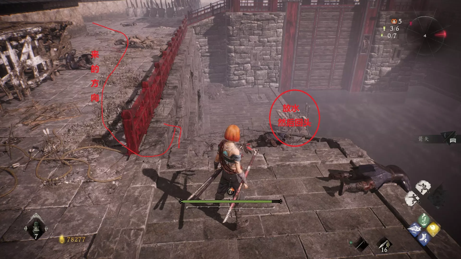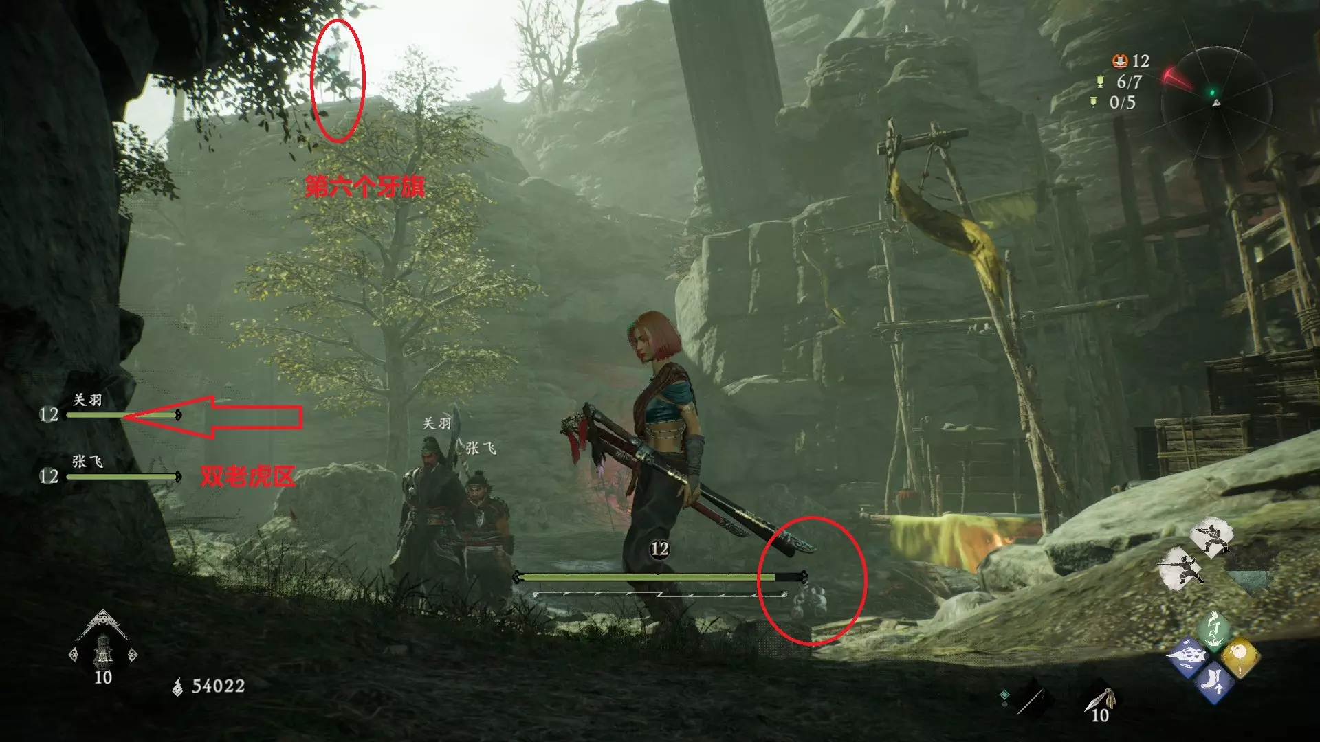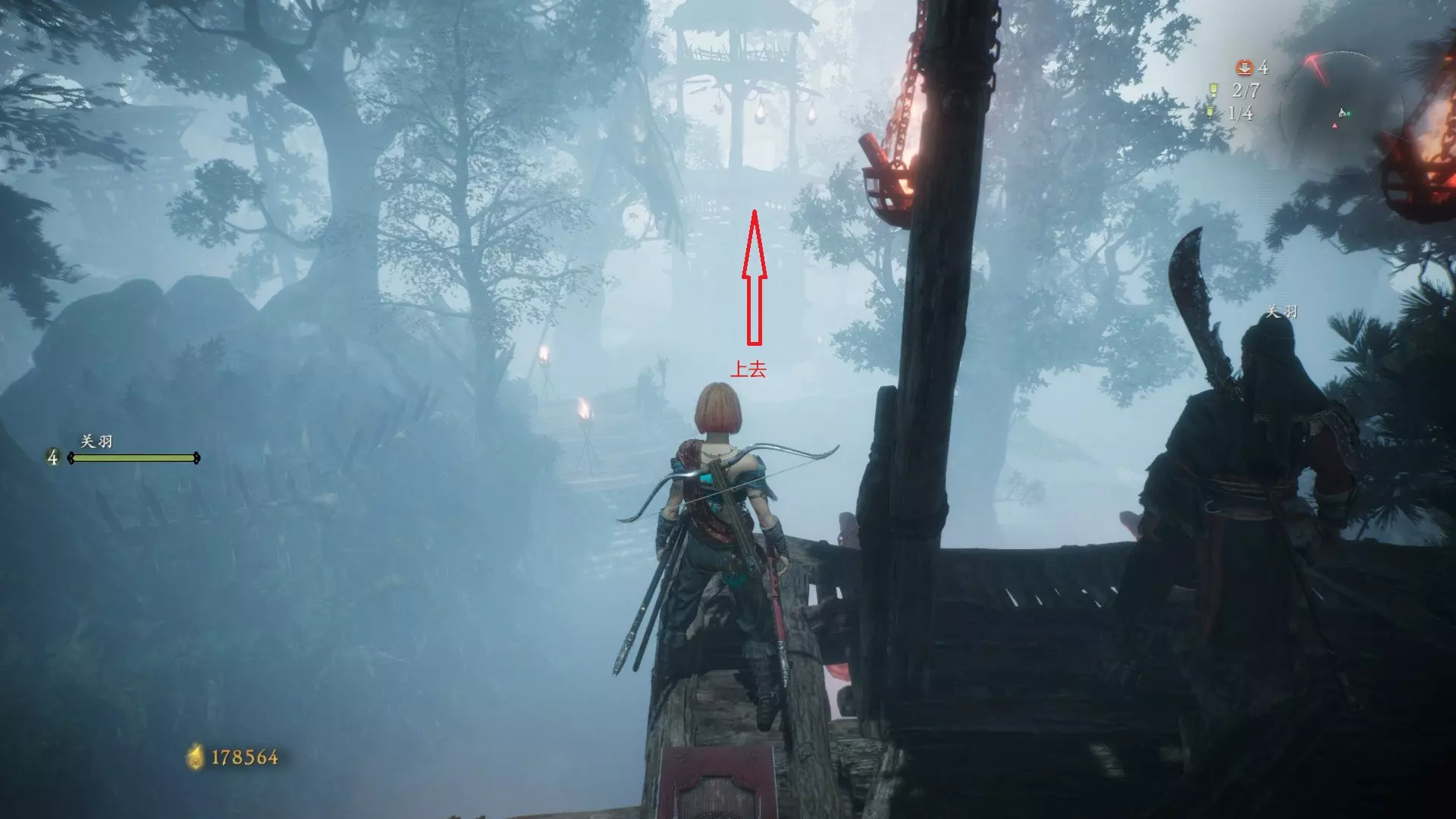 12 第六章 横刀望白马 解锁第二个牙旗后,刚进入雾区下第一个台阶就能看到,从箭头所指方向可以上去