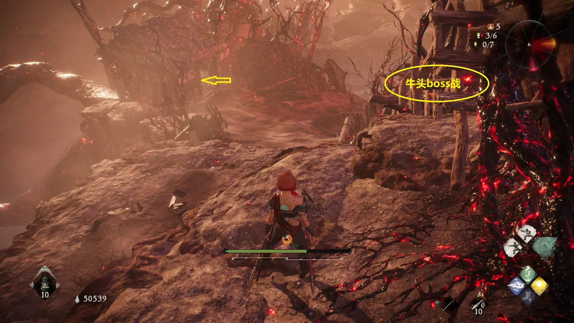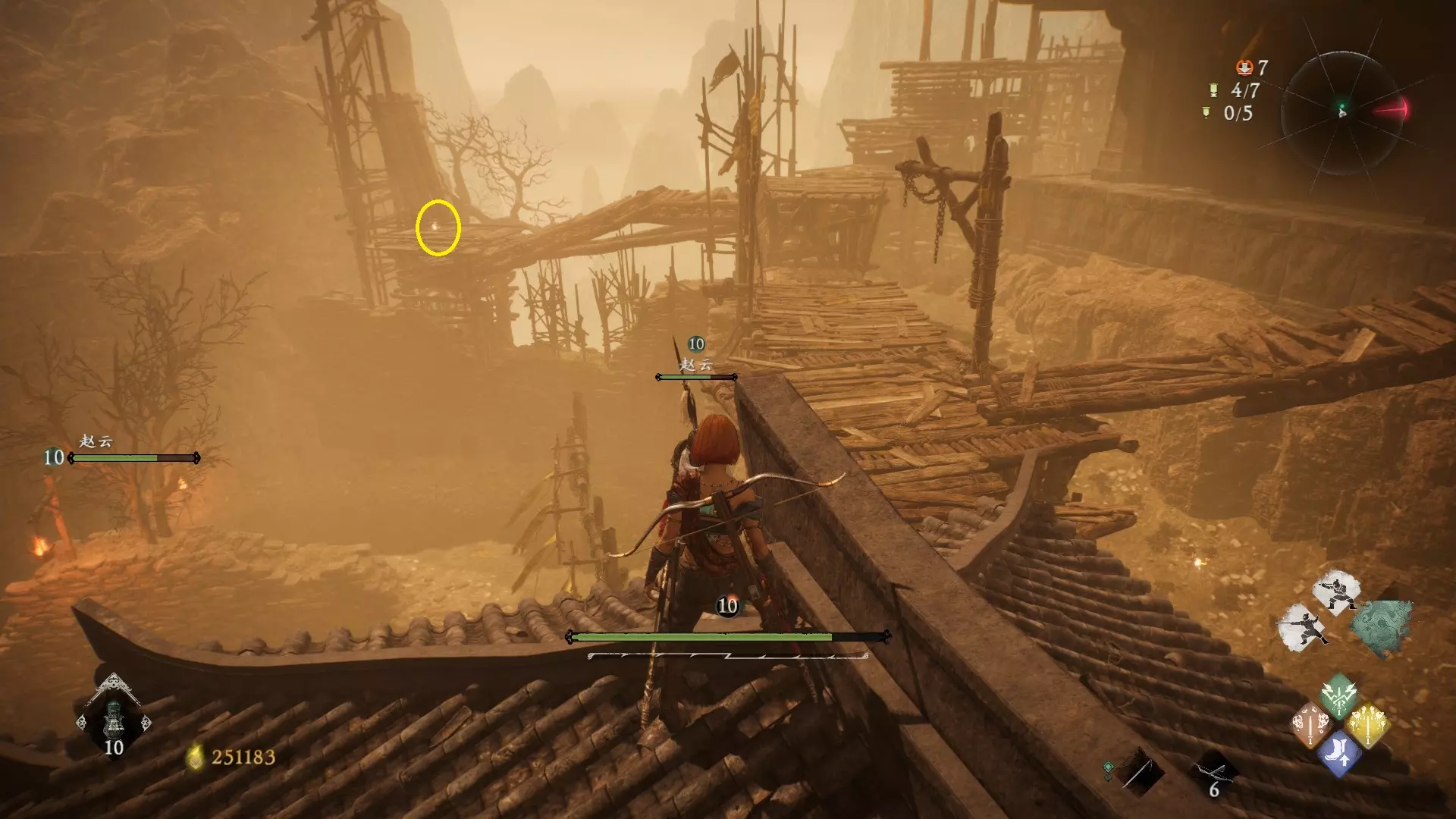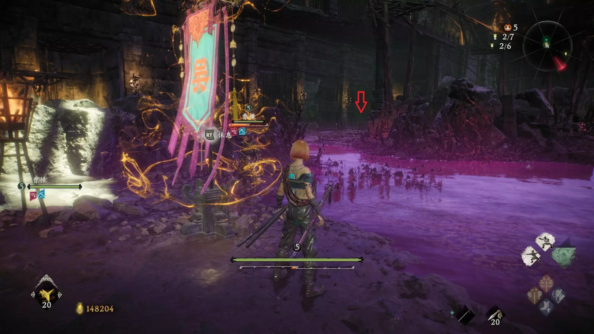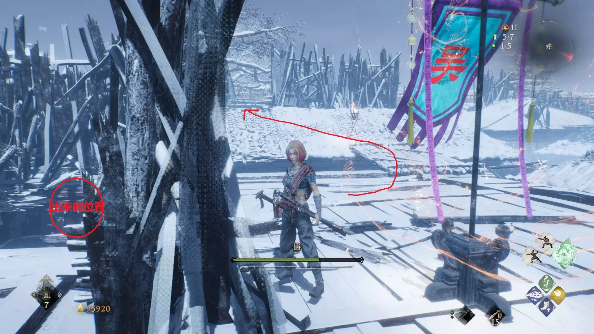 12 第六章 横刀望白马 解锁第二个牙旗后,刚进入雾区下第一个台阶就能看到,从箭头所指方向可以上去