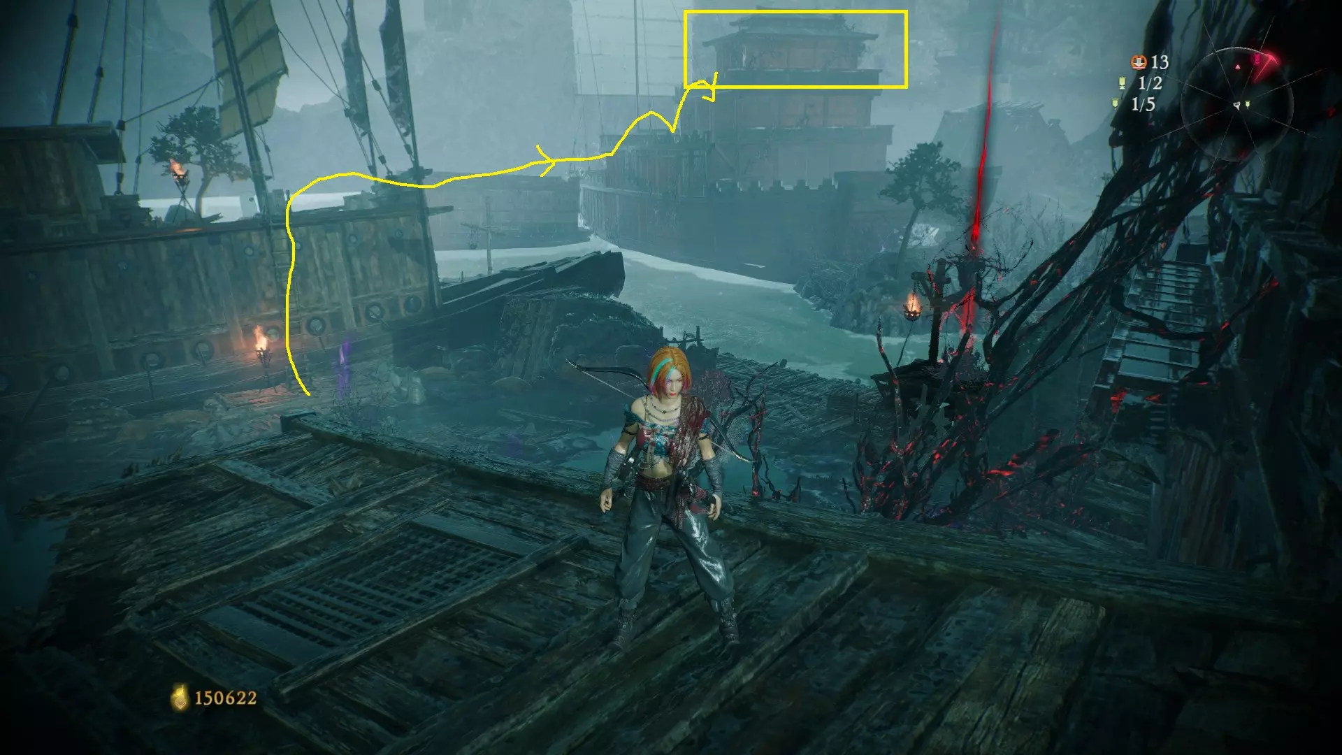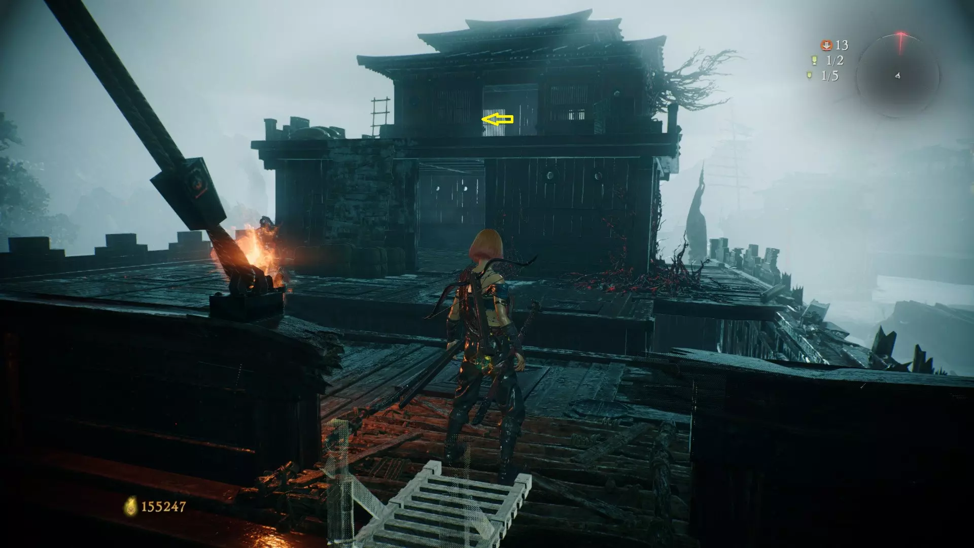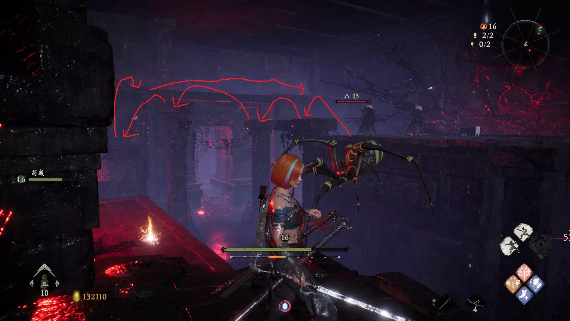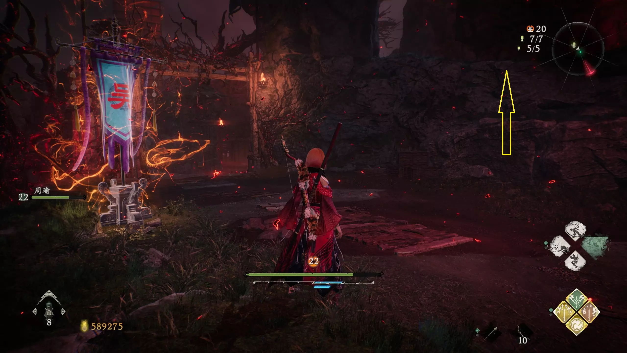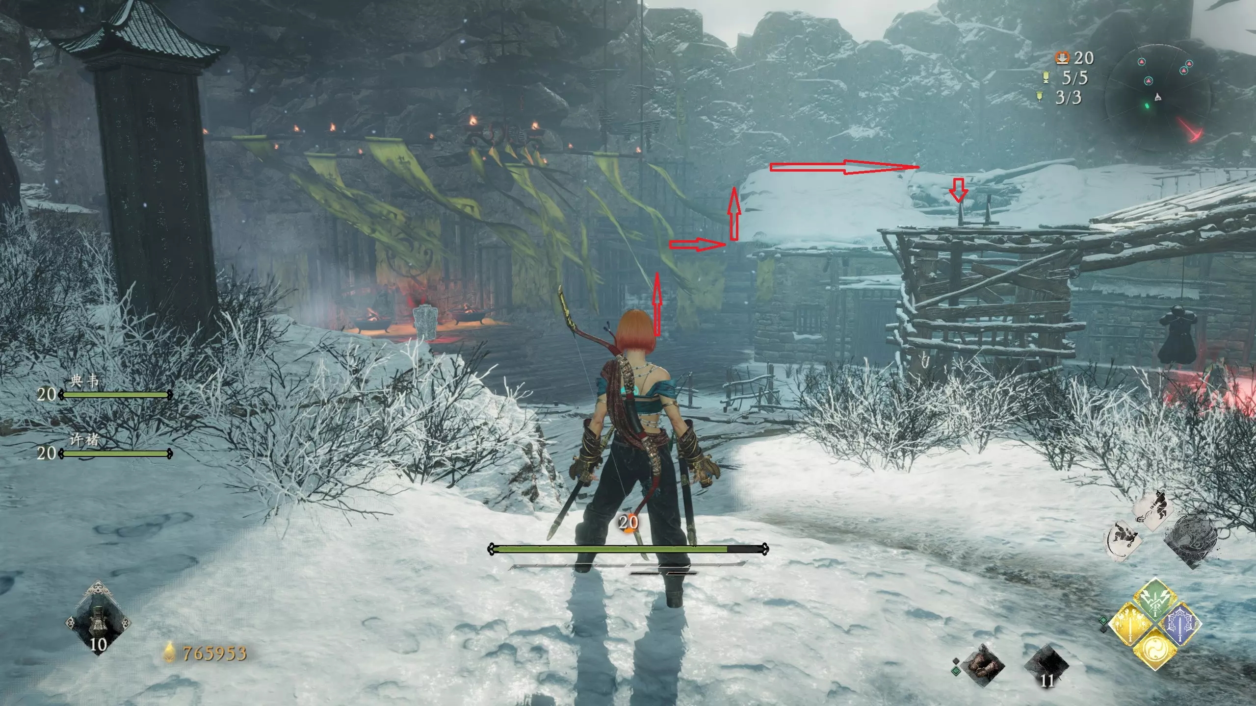 12 第六章 横刀望白马 解锁第二个牙旗后,刚进入雾区下第一个台阶就能看到,从箭头所指方向可以上去