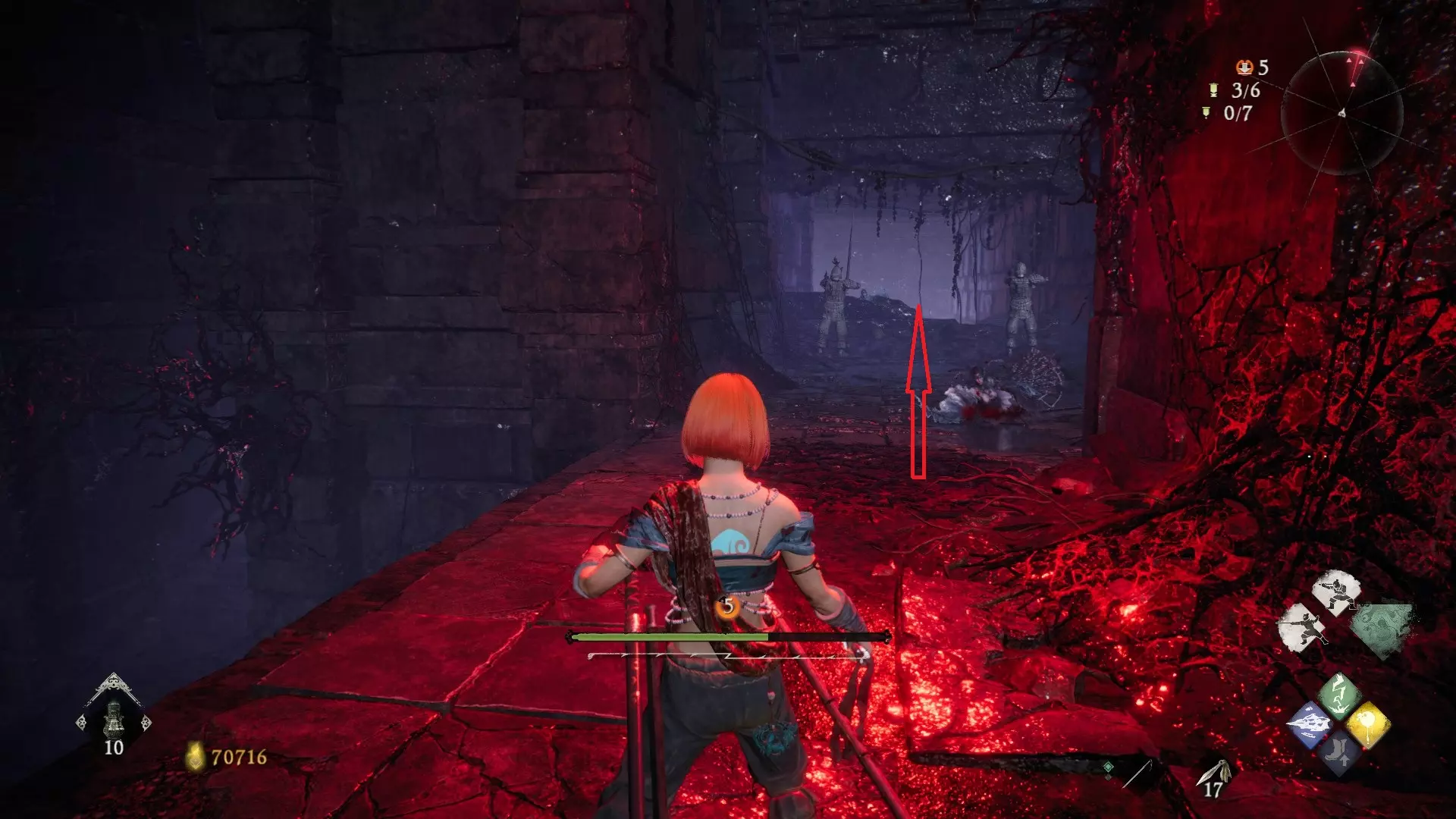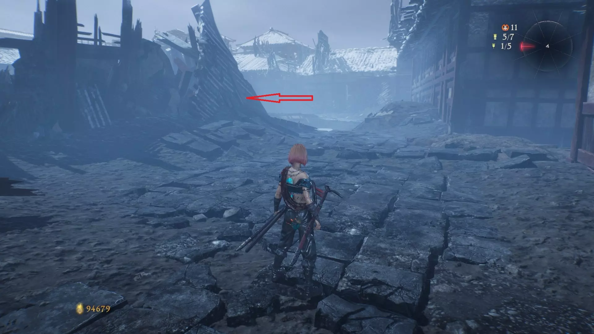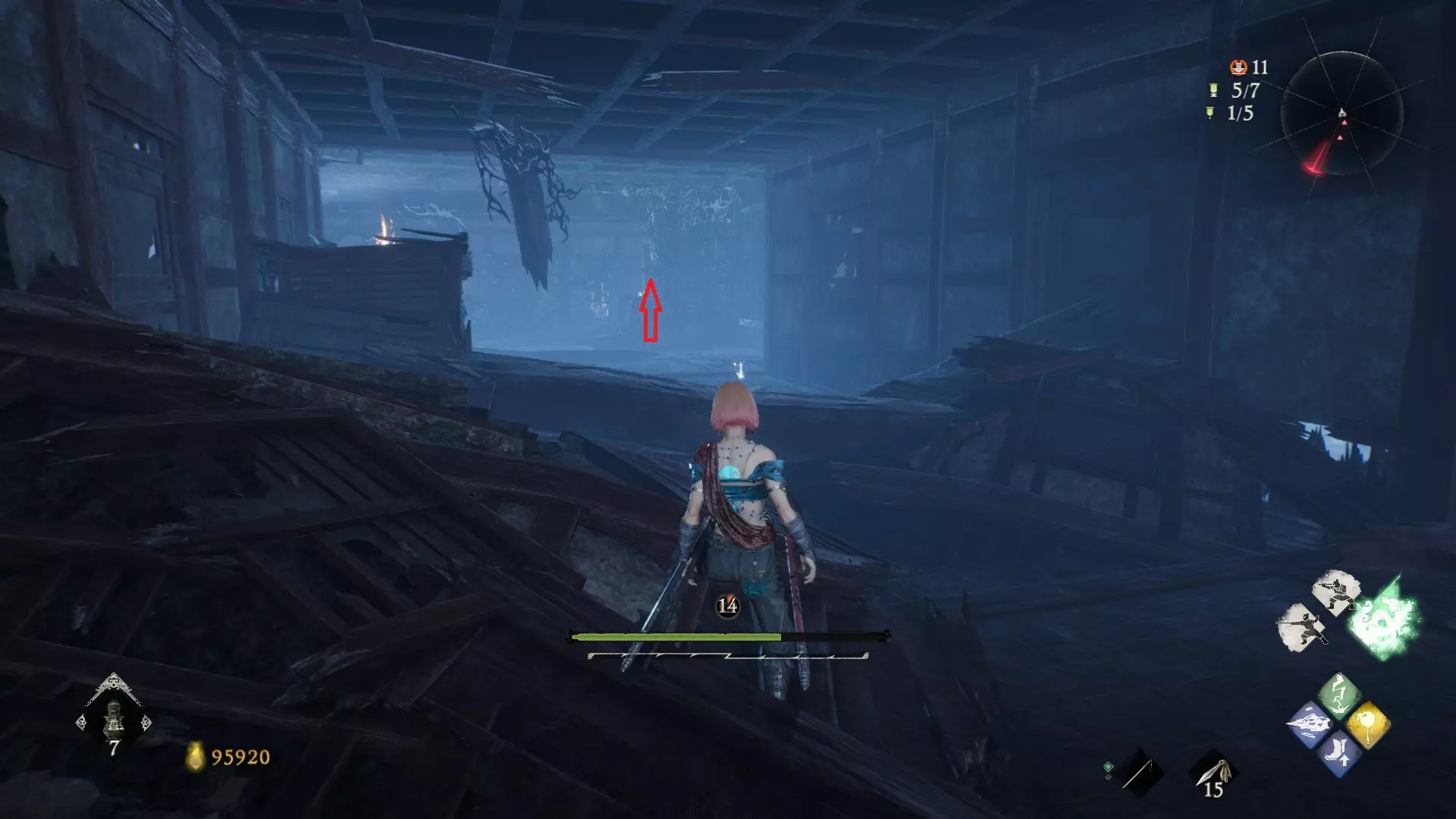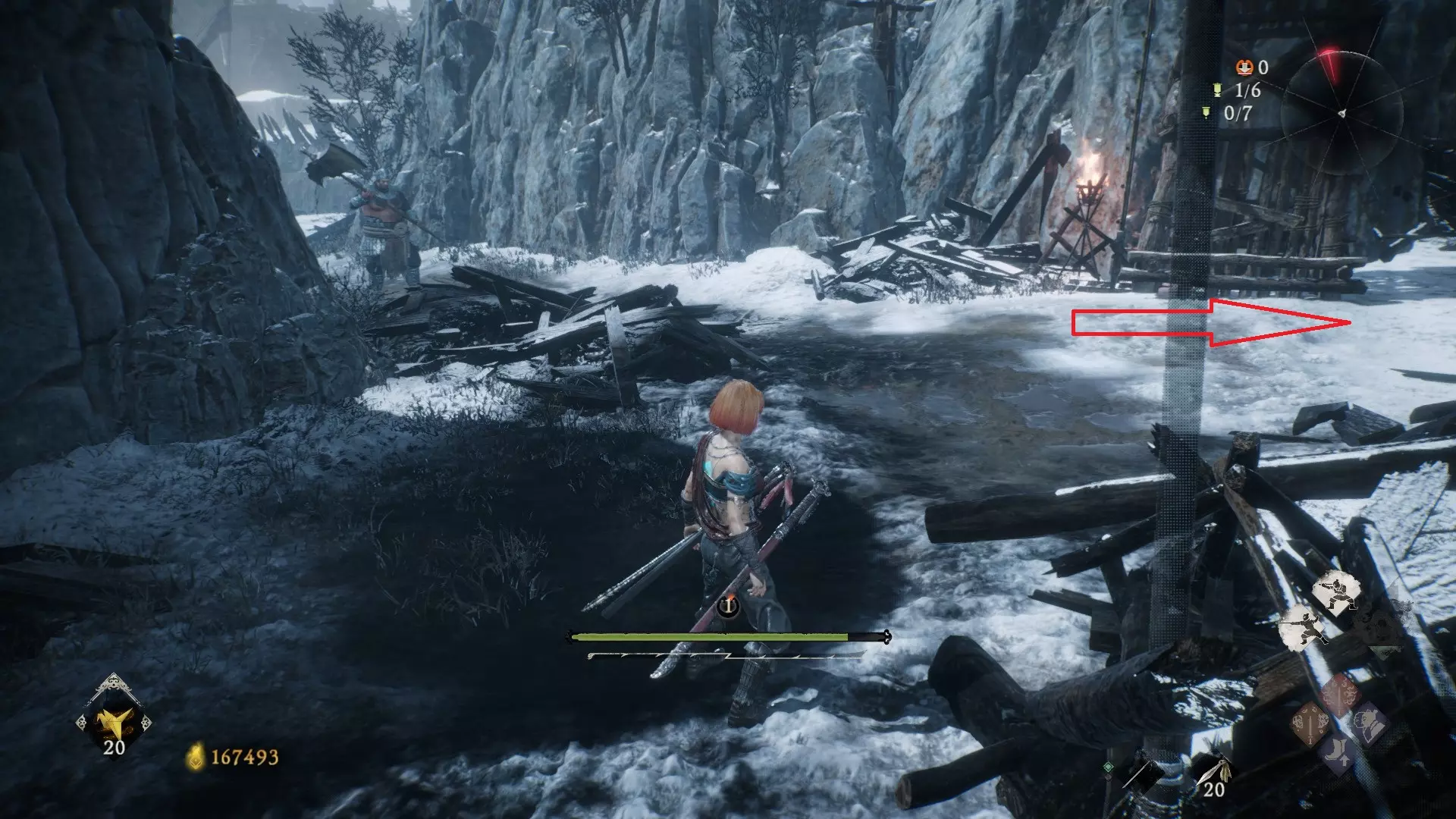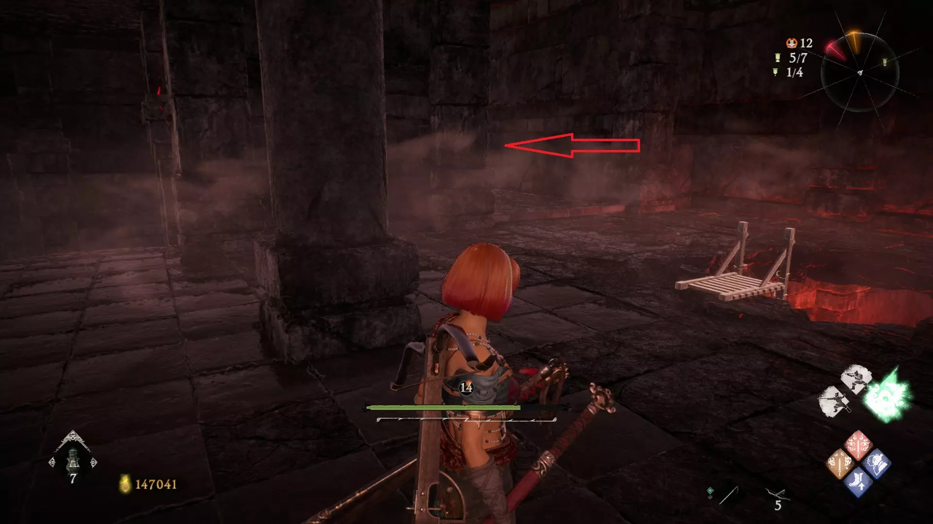 12 第六章 横刀望白马 解锁第二个牙旗后,刚进入雾区下第一个台阶就能看到,从箭头所指方向可以上去