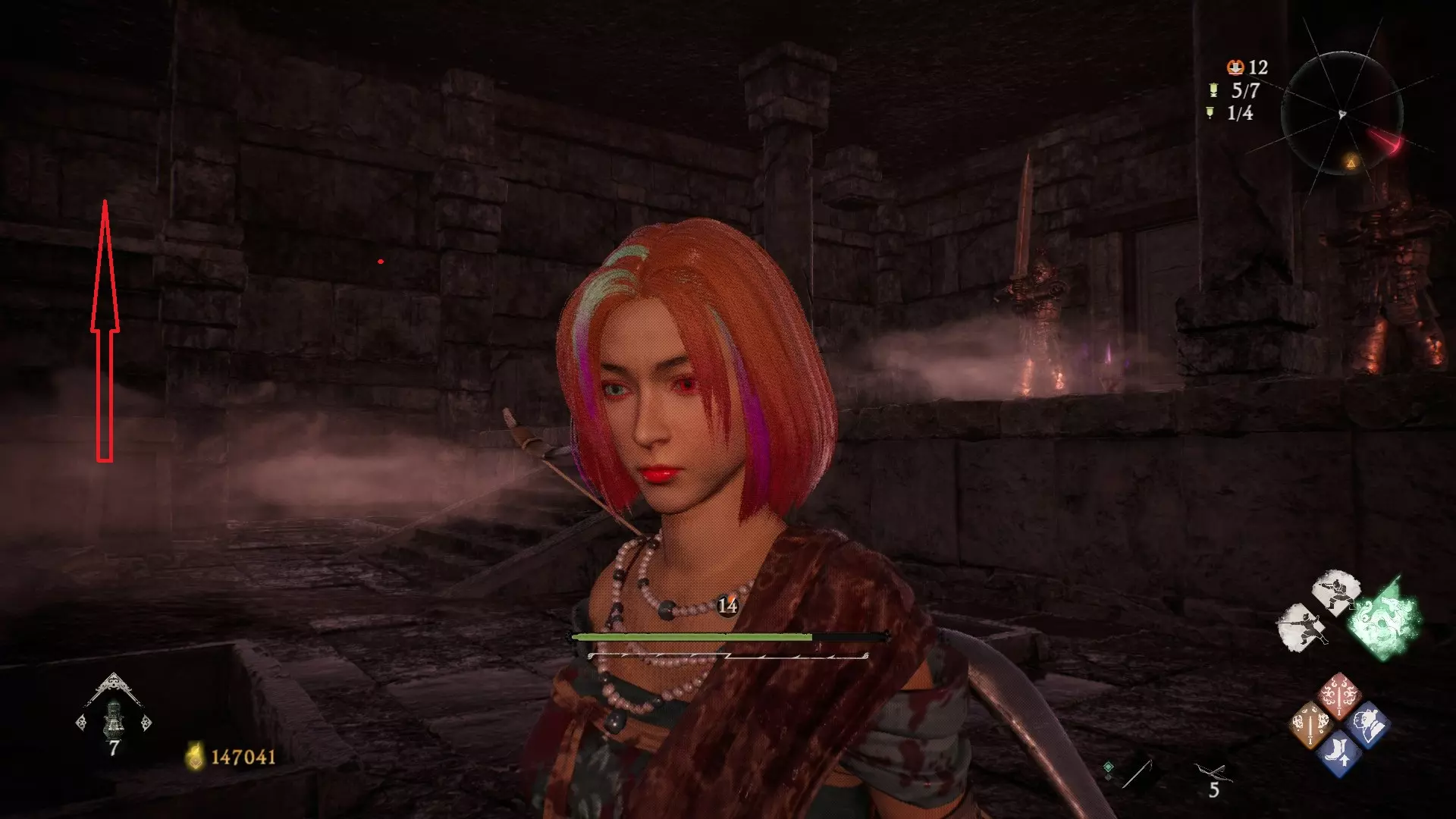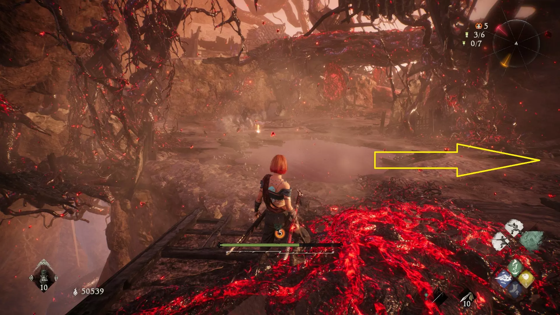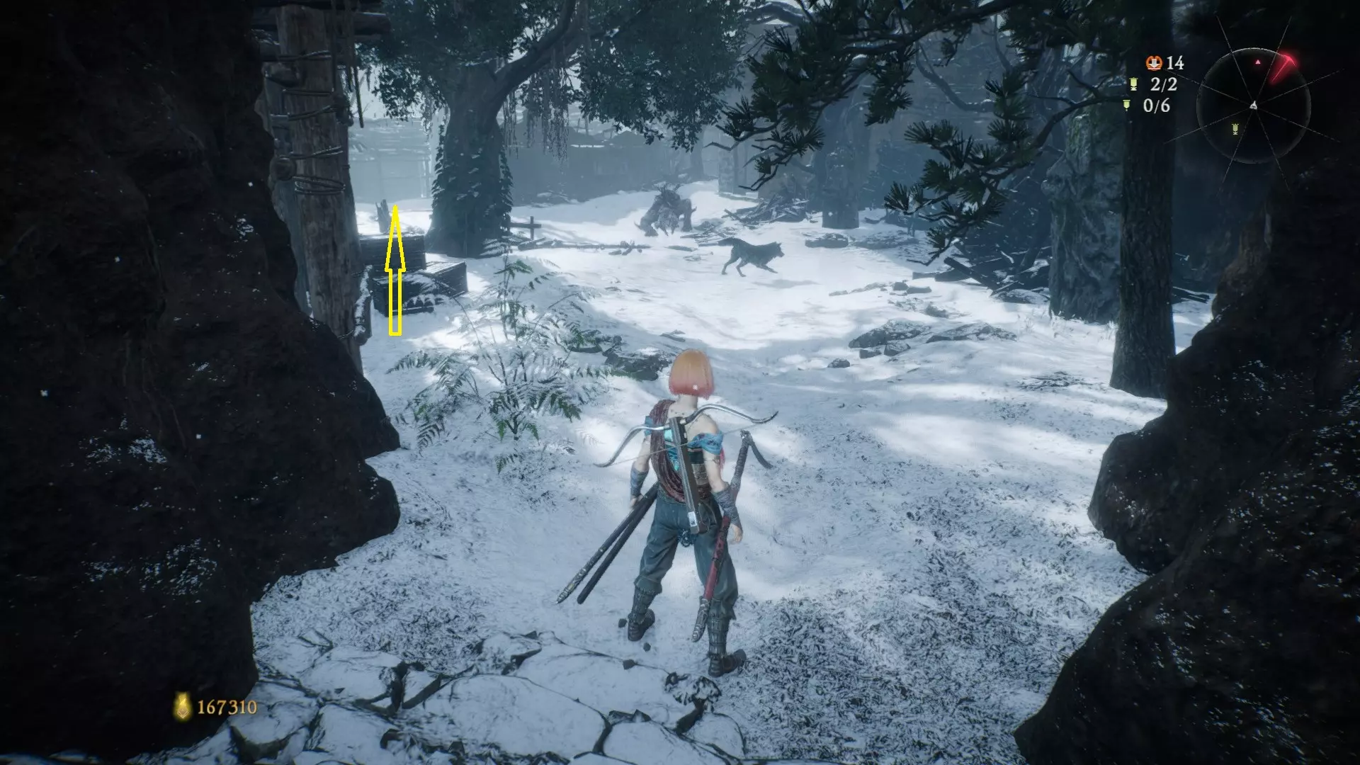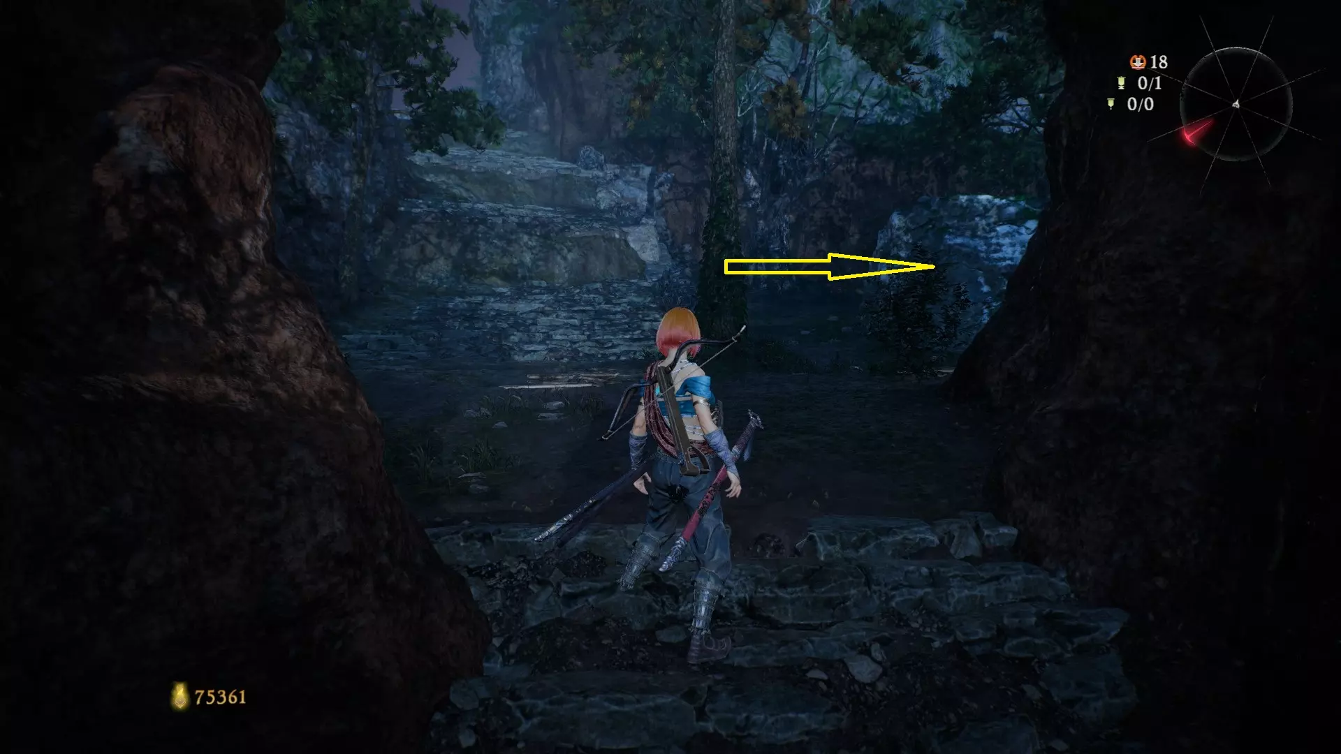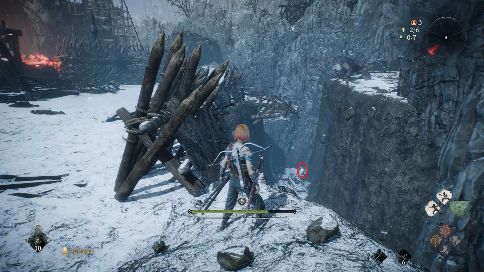 12 第六章 横刀望白马 解锁第二个牙旗后,刚进入雾区下第一个台阶就能看到,从箭头所指方向可以上去