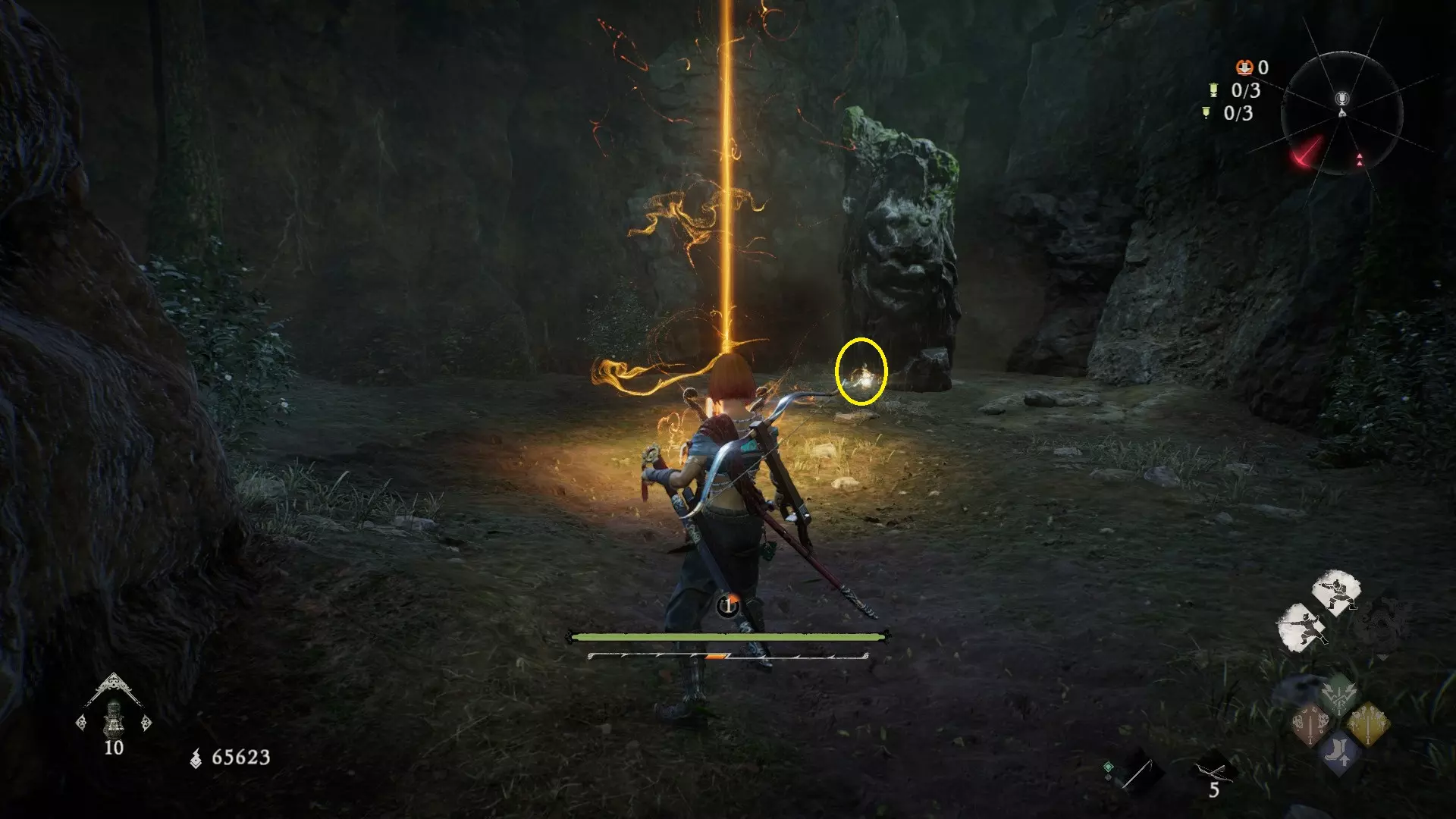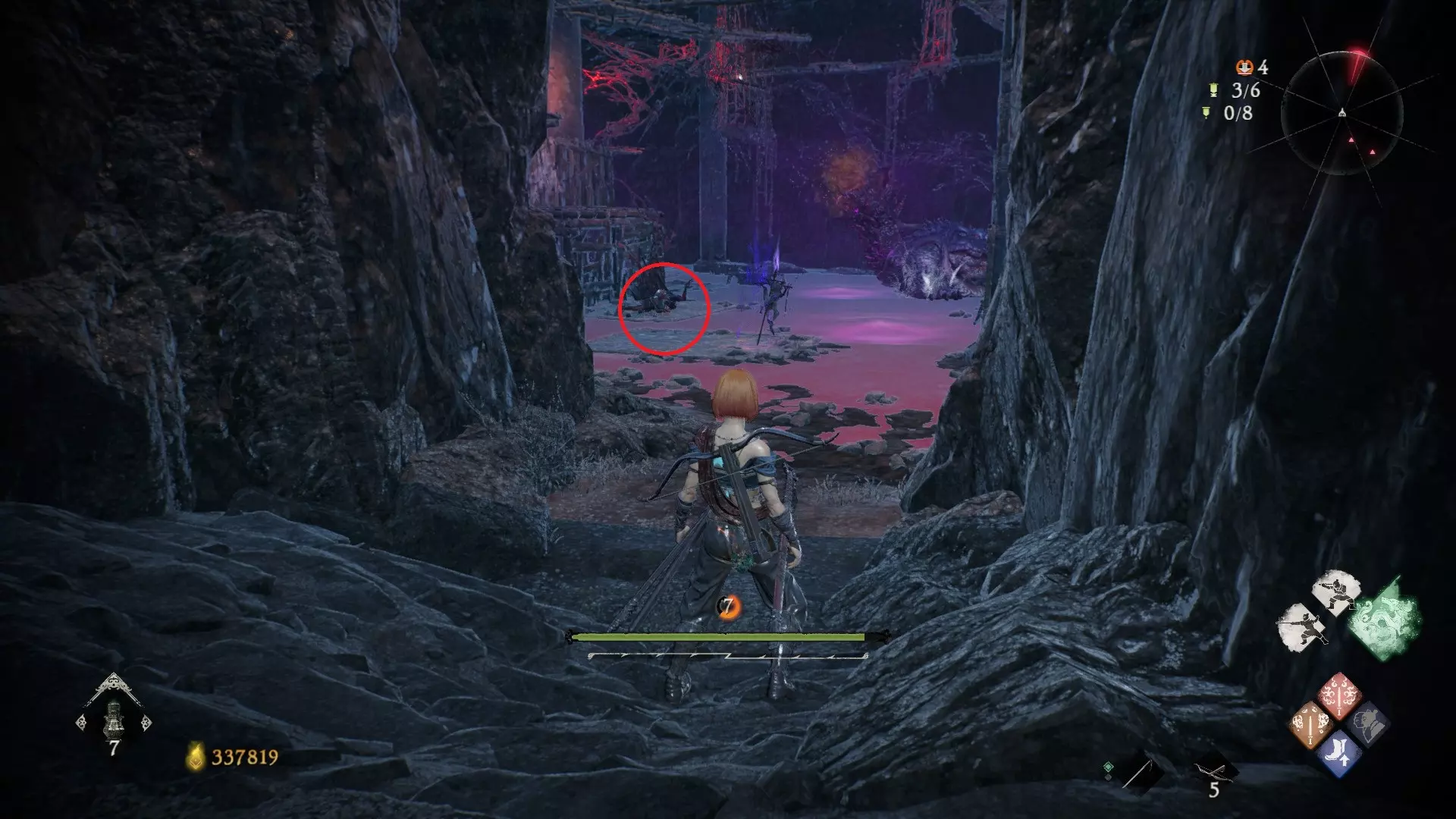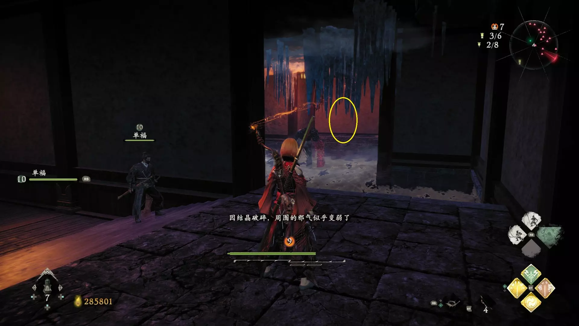 拨云见日 已在【魔殿悍鬼狂】摧毁所有共鸣的结晶。 共五处 鉴定方法:结晶会强化周围的怪物,怪物泛着紫色的气就说明周围有结晶。 解锁第二个牙旗,刚进入大殿一层后,从左侧门进去(当时用弓箭打掉了,黄圈位置)