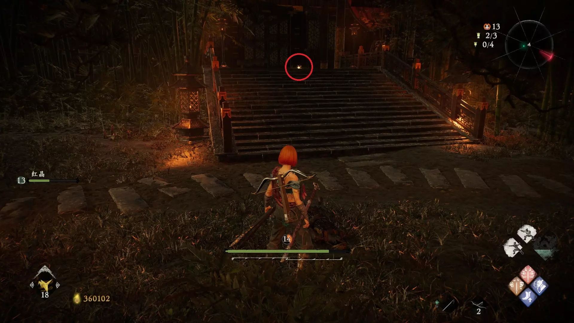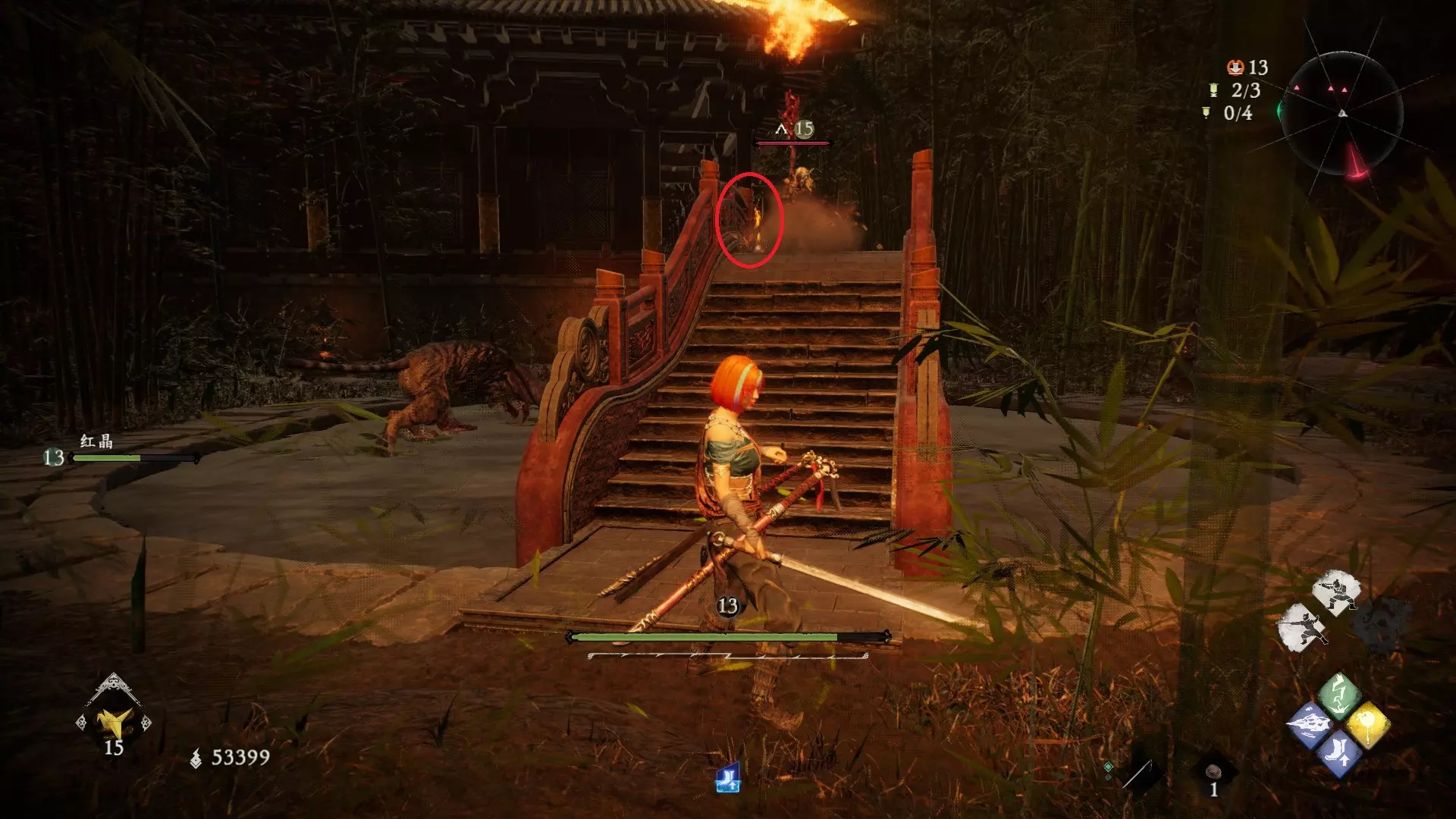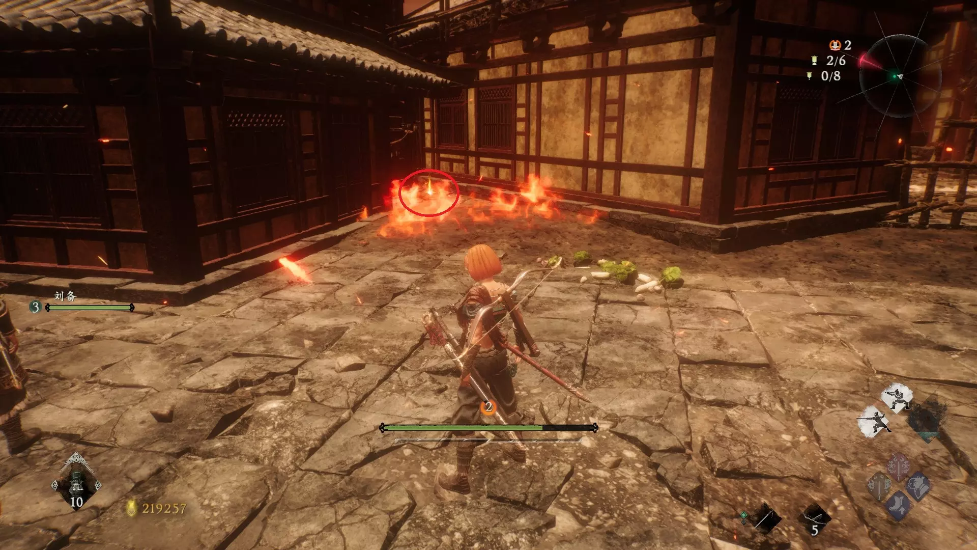 从火焰区域继续前进,到达庭院后,前往亭子的左侧。