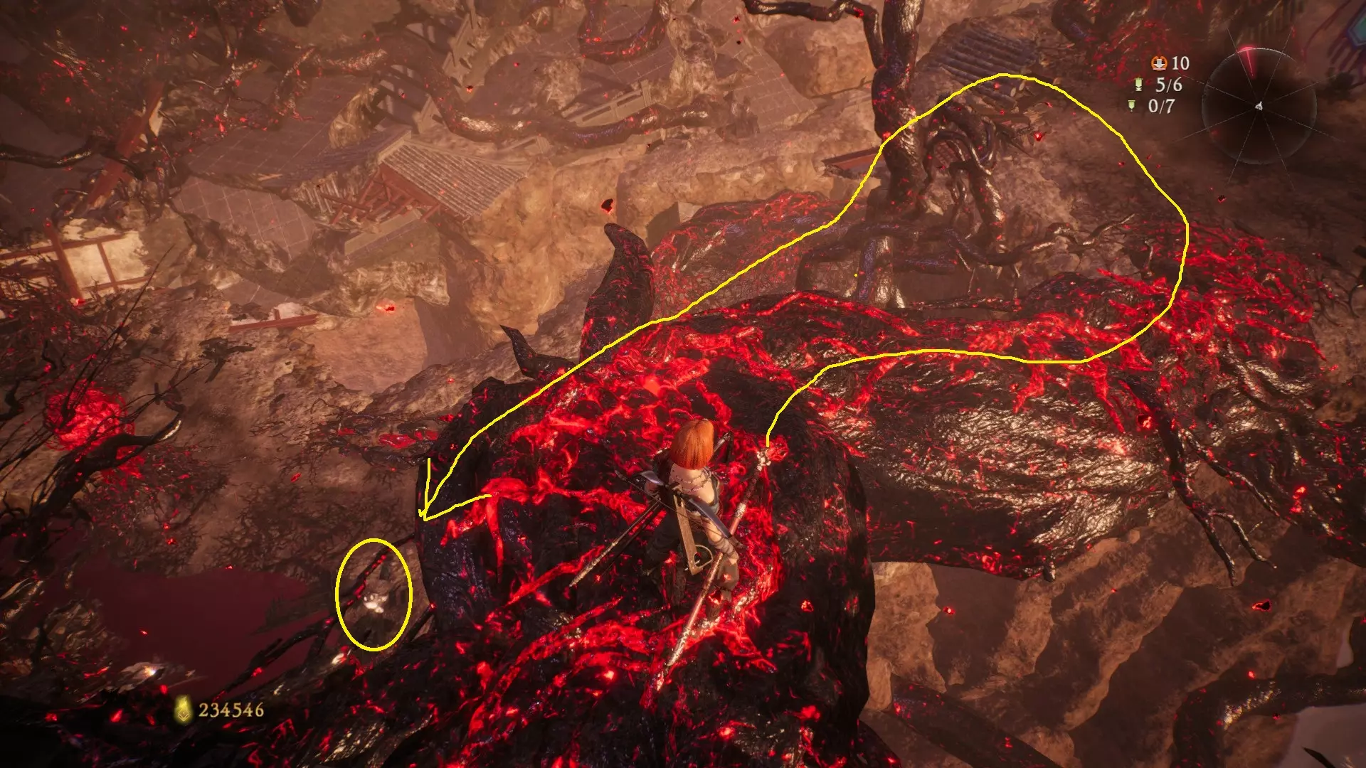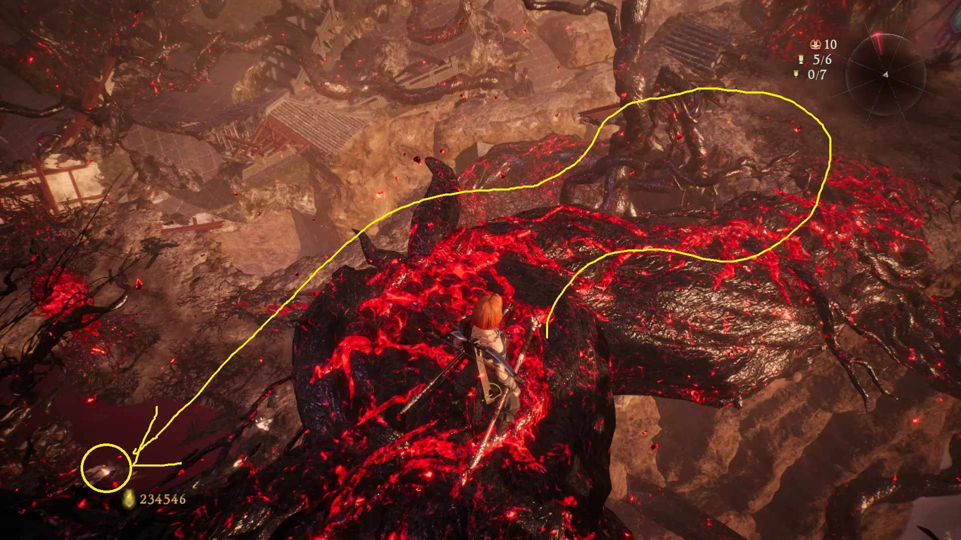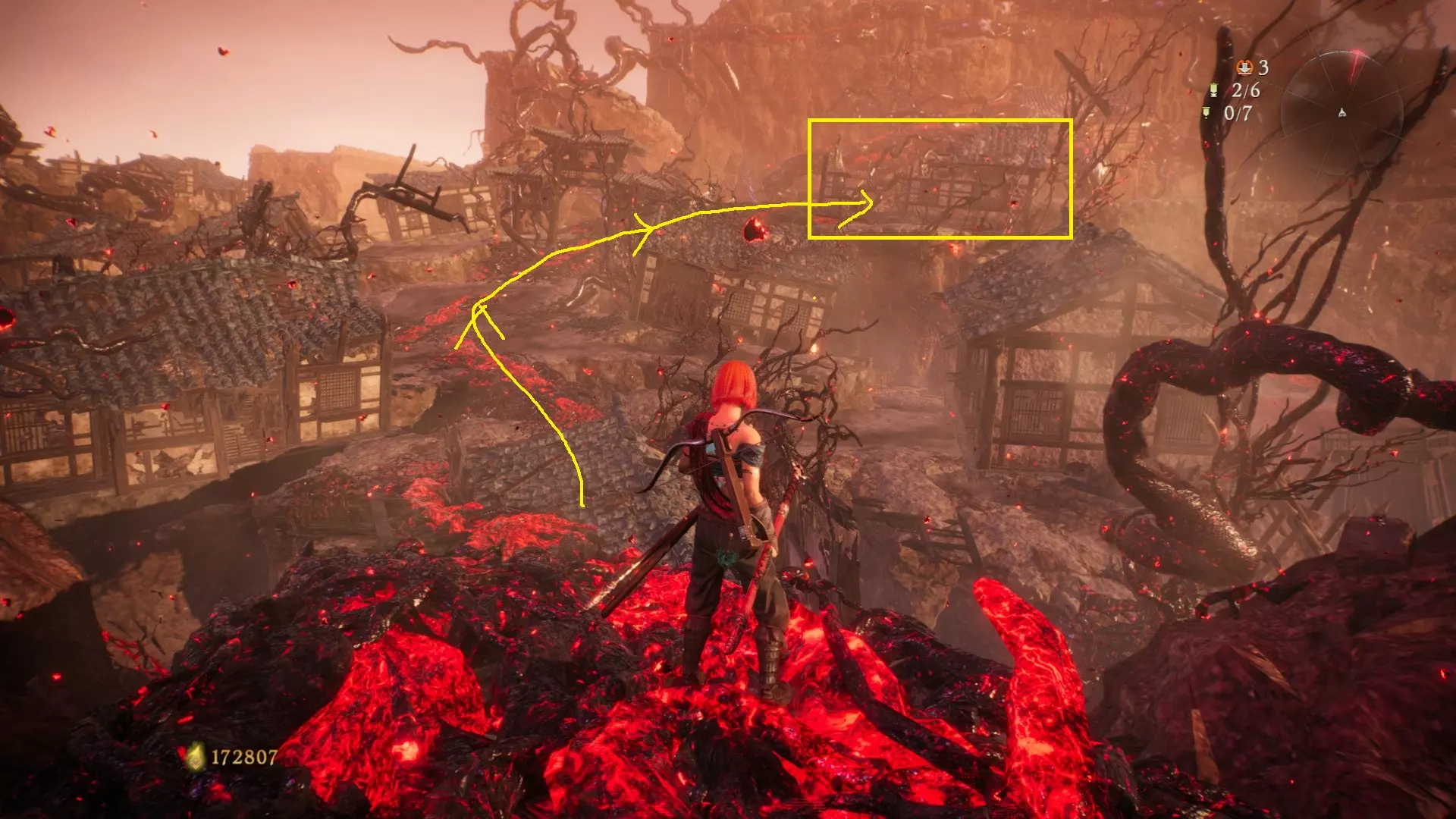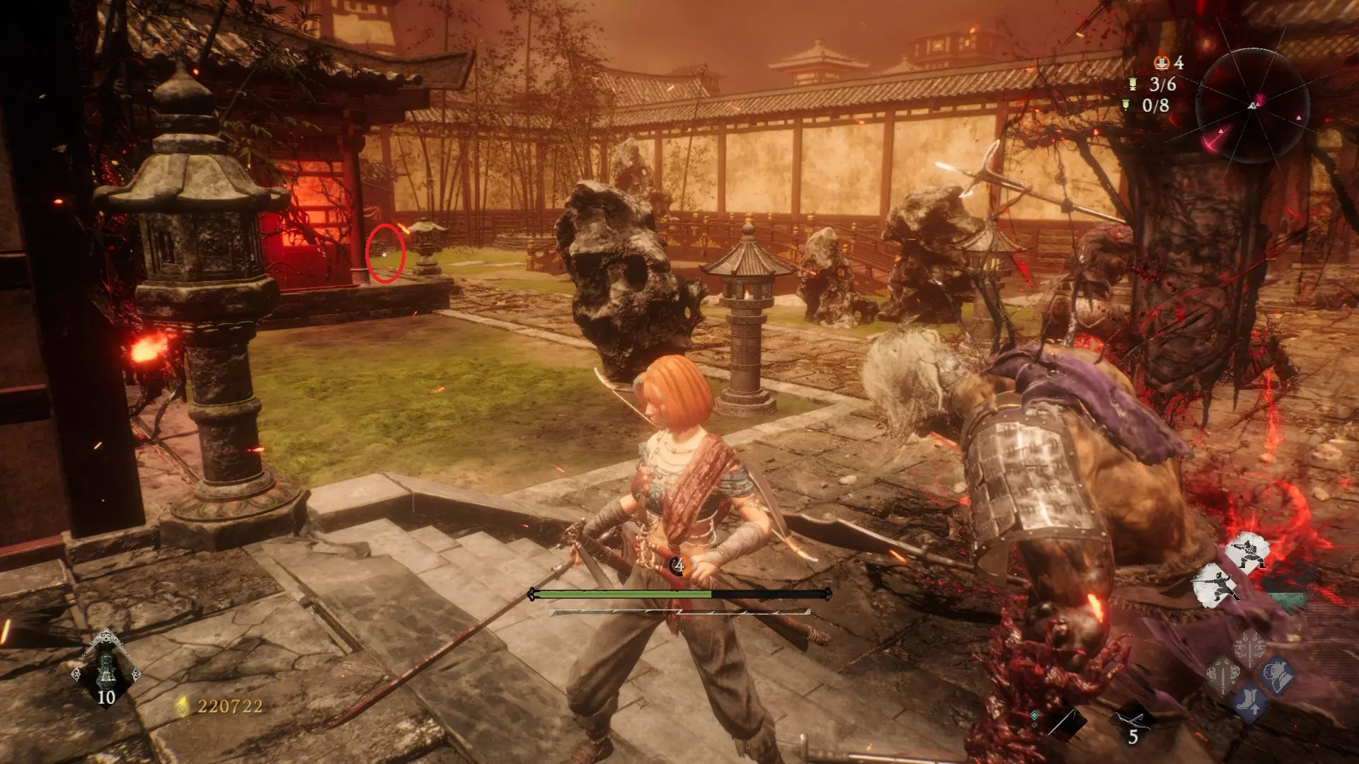 从火焰区域继续前进,到达庭院后,前往亭子的左侧。