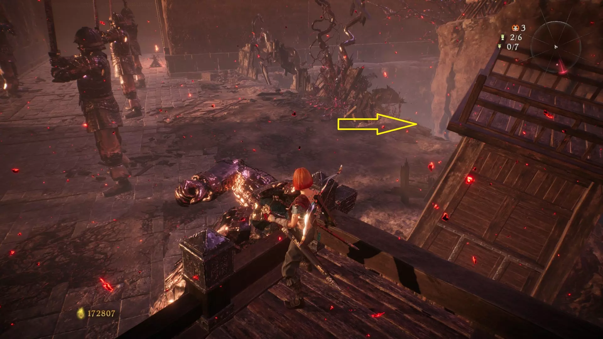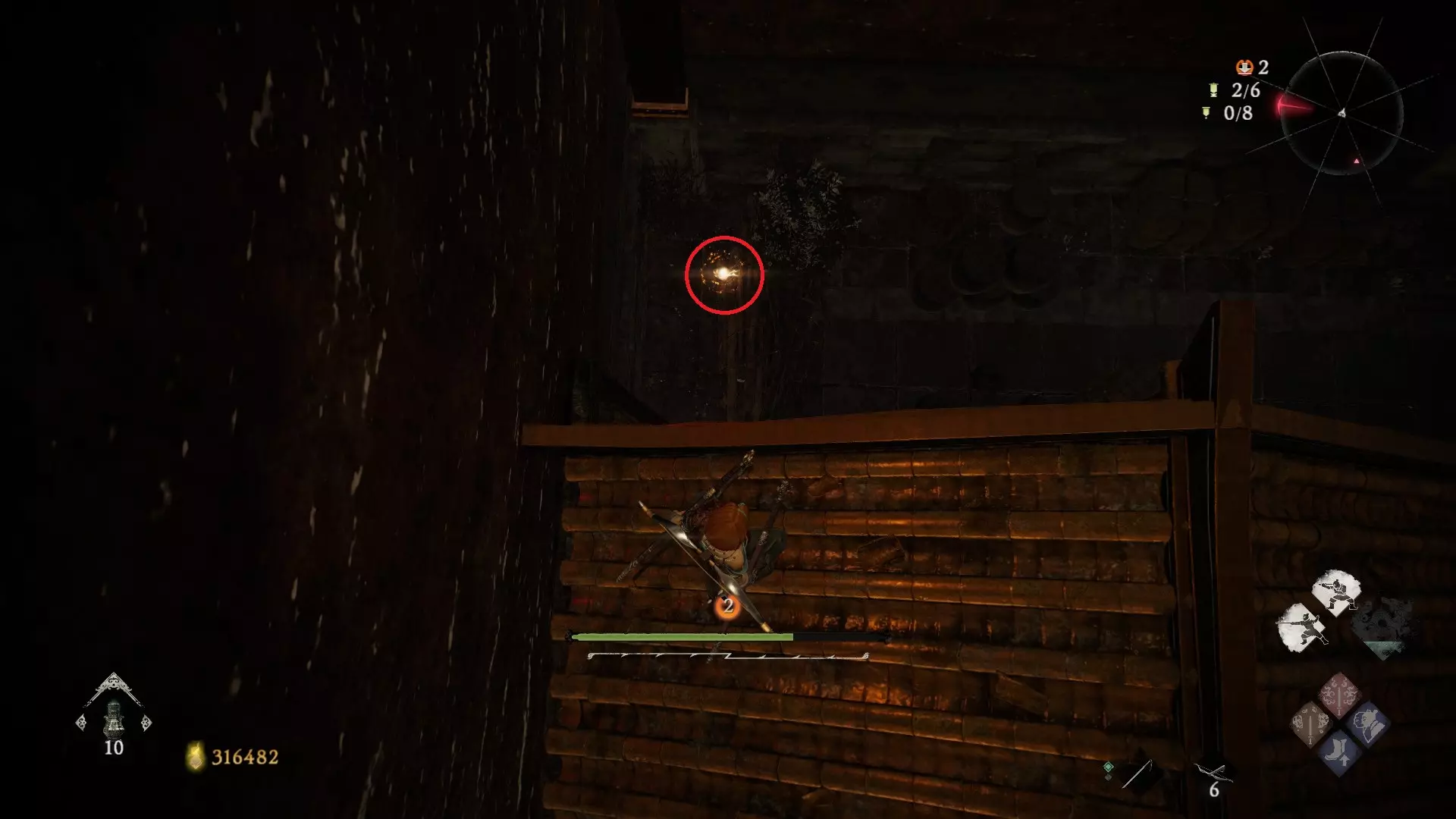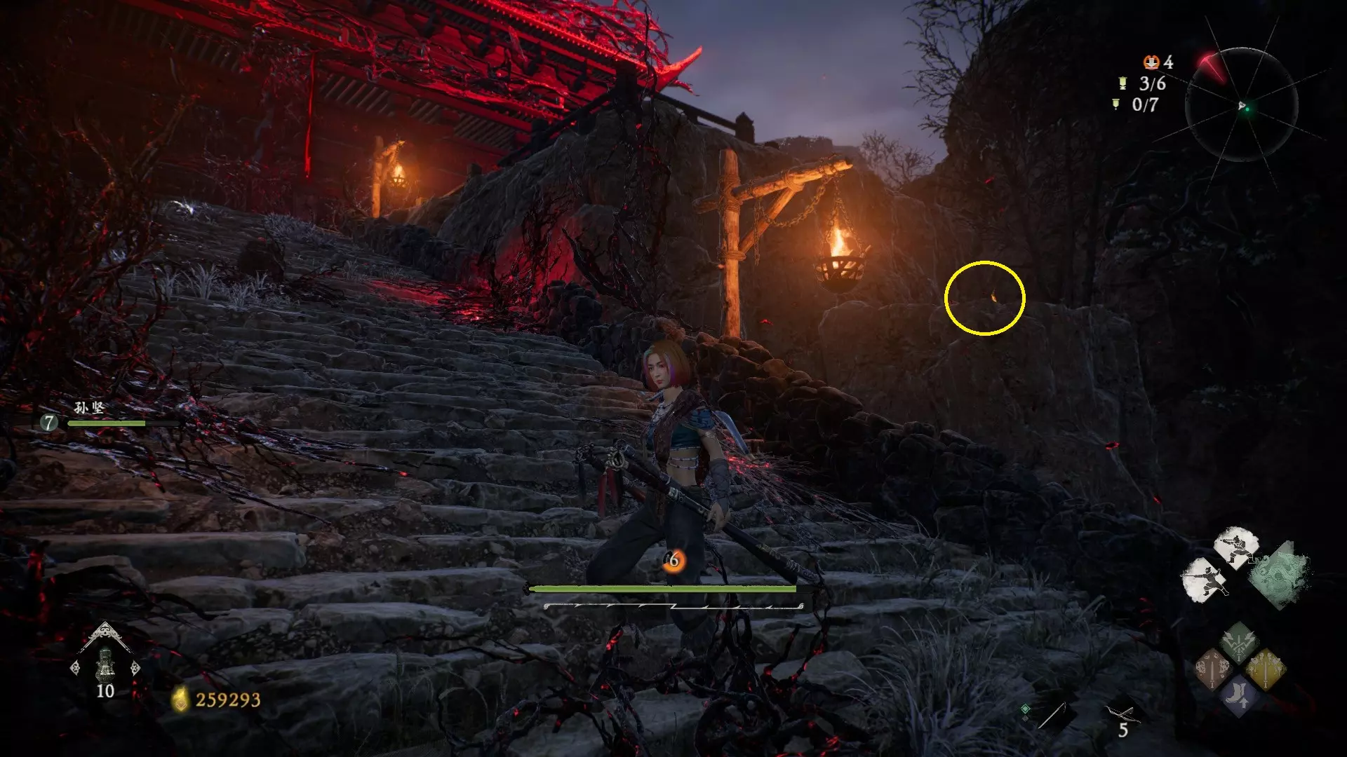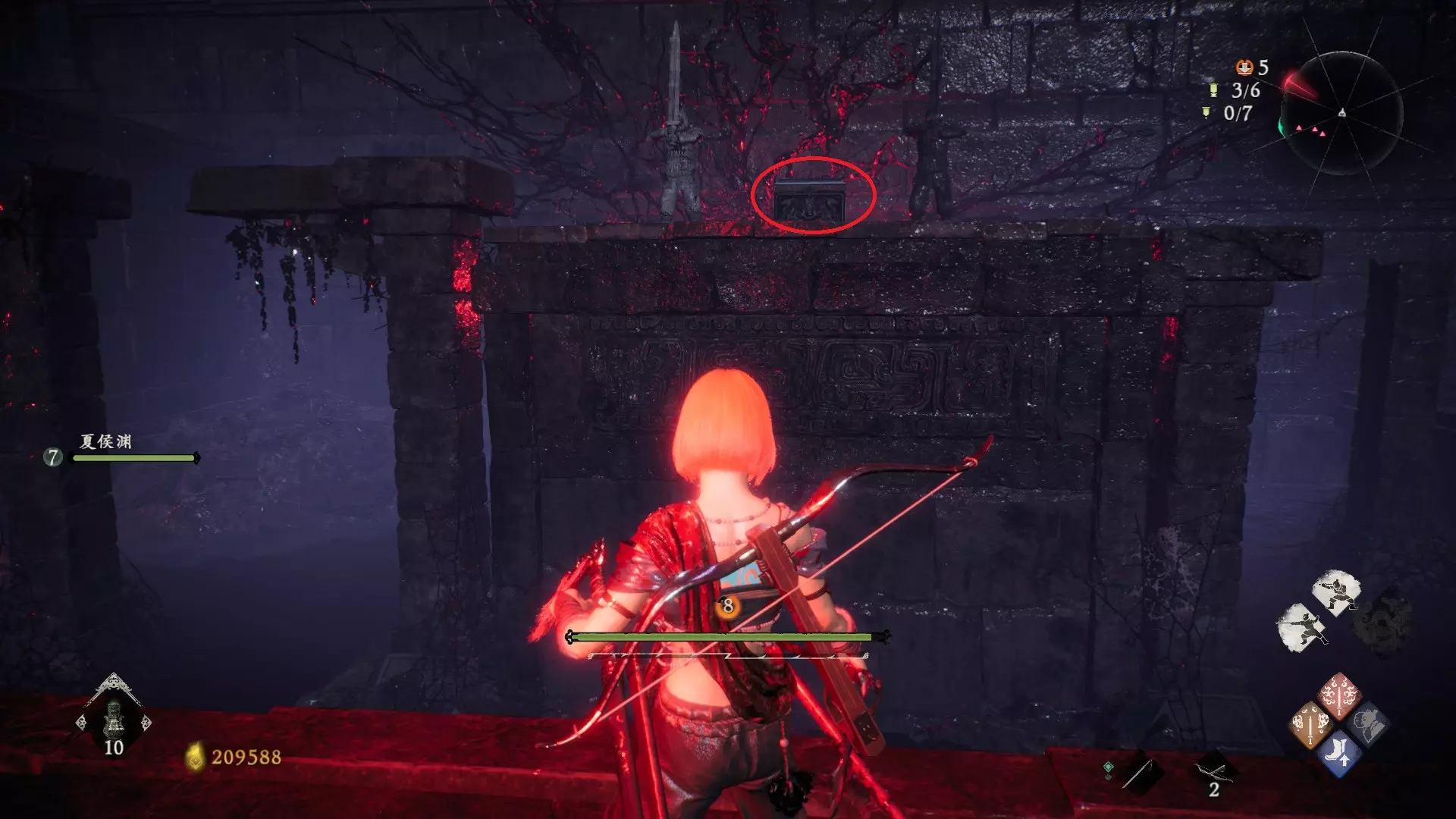 6 外章三魔殿悍鬼狂(3/3) 回到第三个牙旗处,这次从左侧门进去。穿过火焰区到达庭院,从庭院斜对角的石头跳上去即可看到。