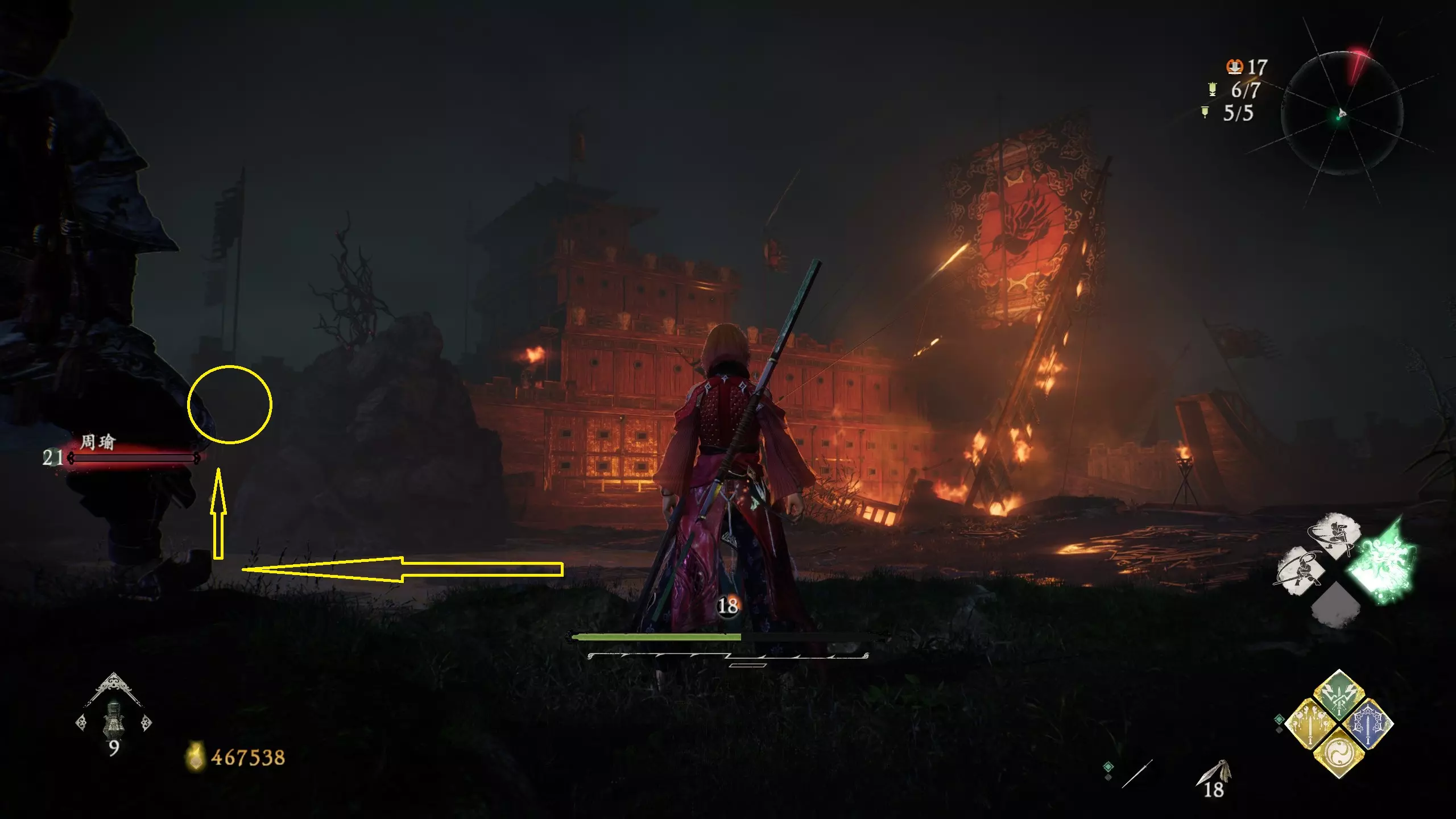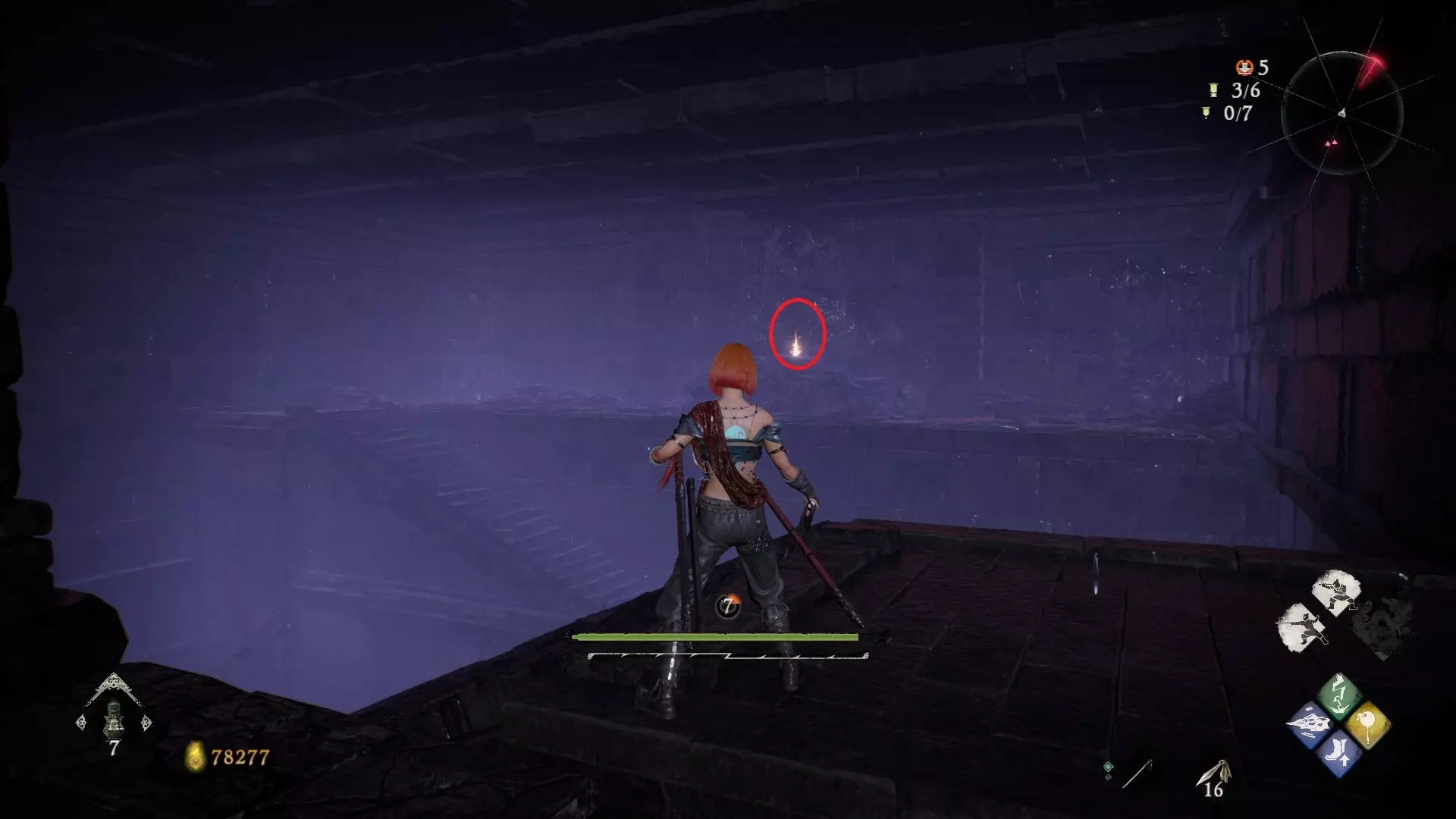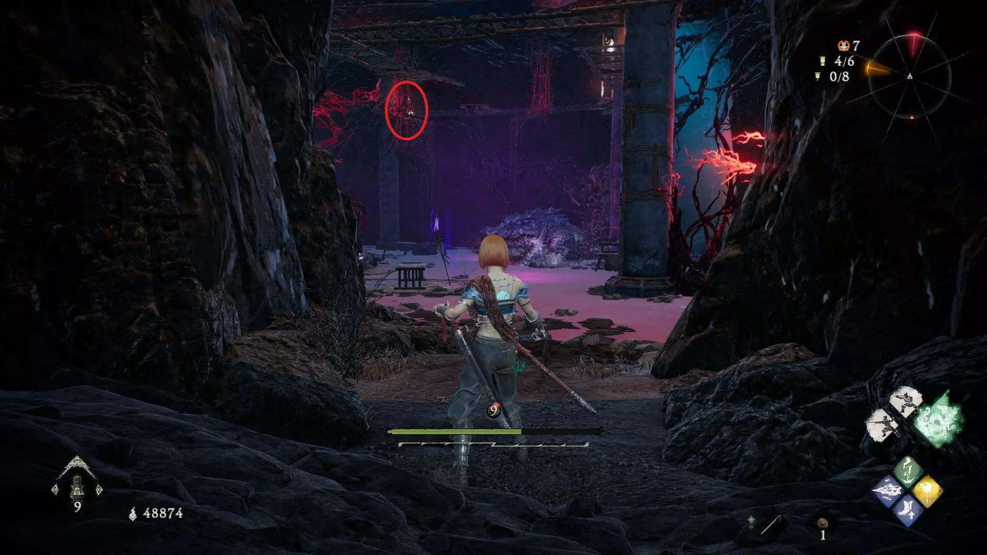 6 外章三魔殿悍鬼狂(3/3) 回到第三个牙旗处,这次从左侧门进去。穿过火焰区到达庭院,从庭院斜对角的石头跳上去即可看到。