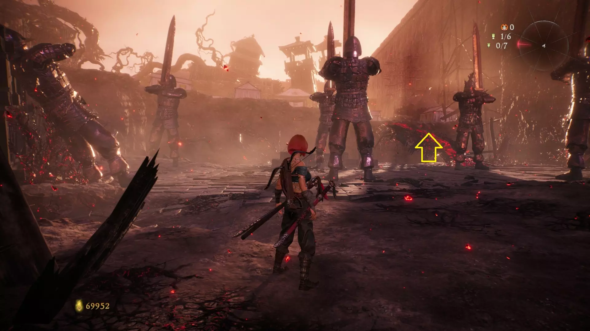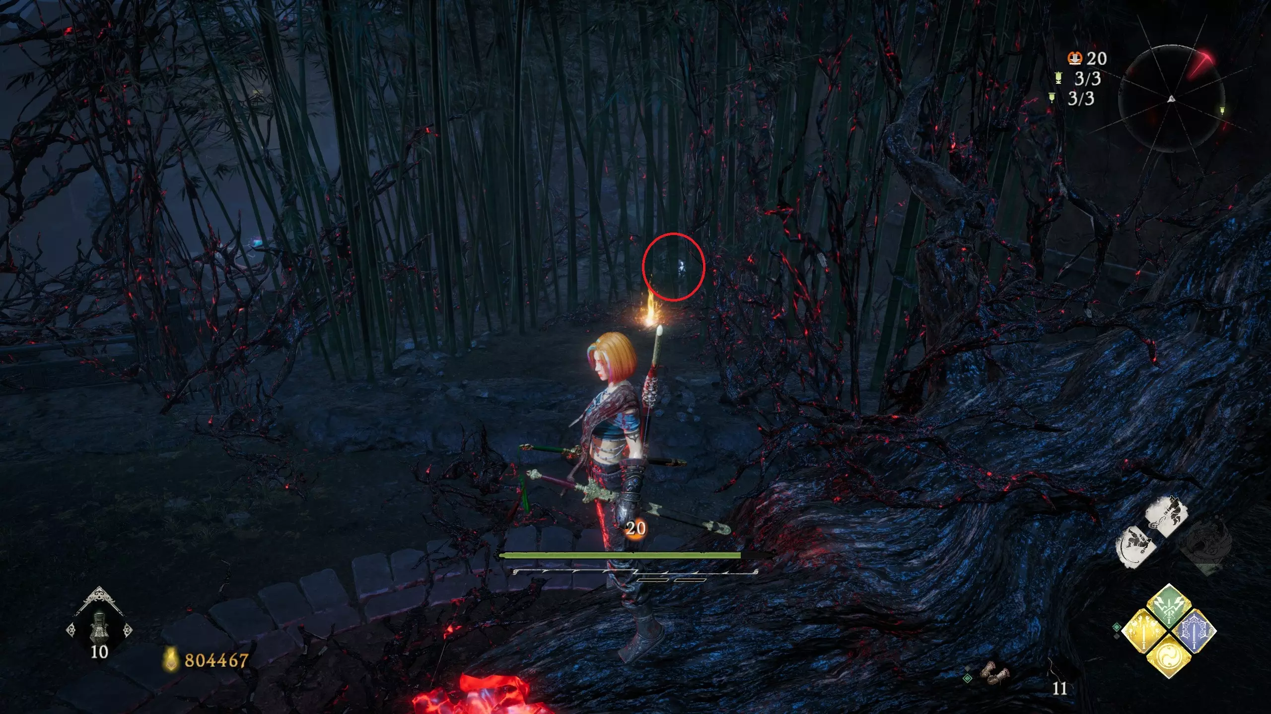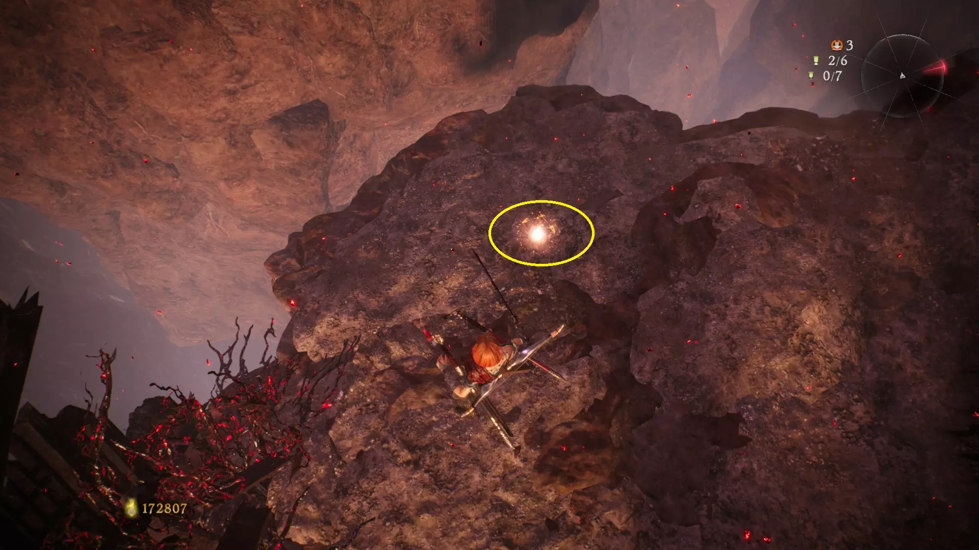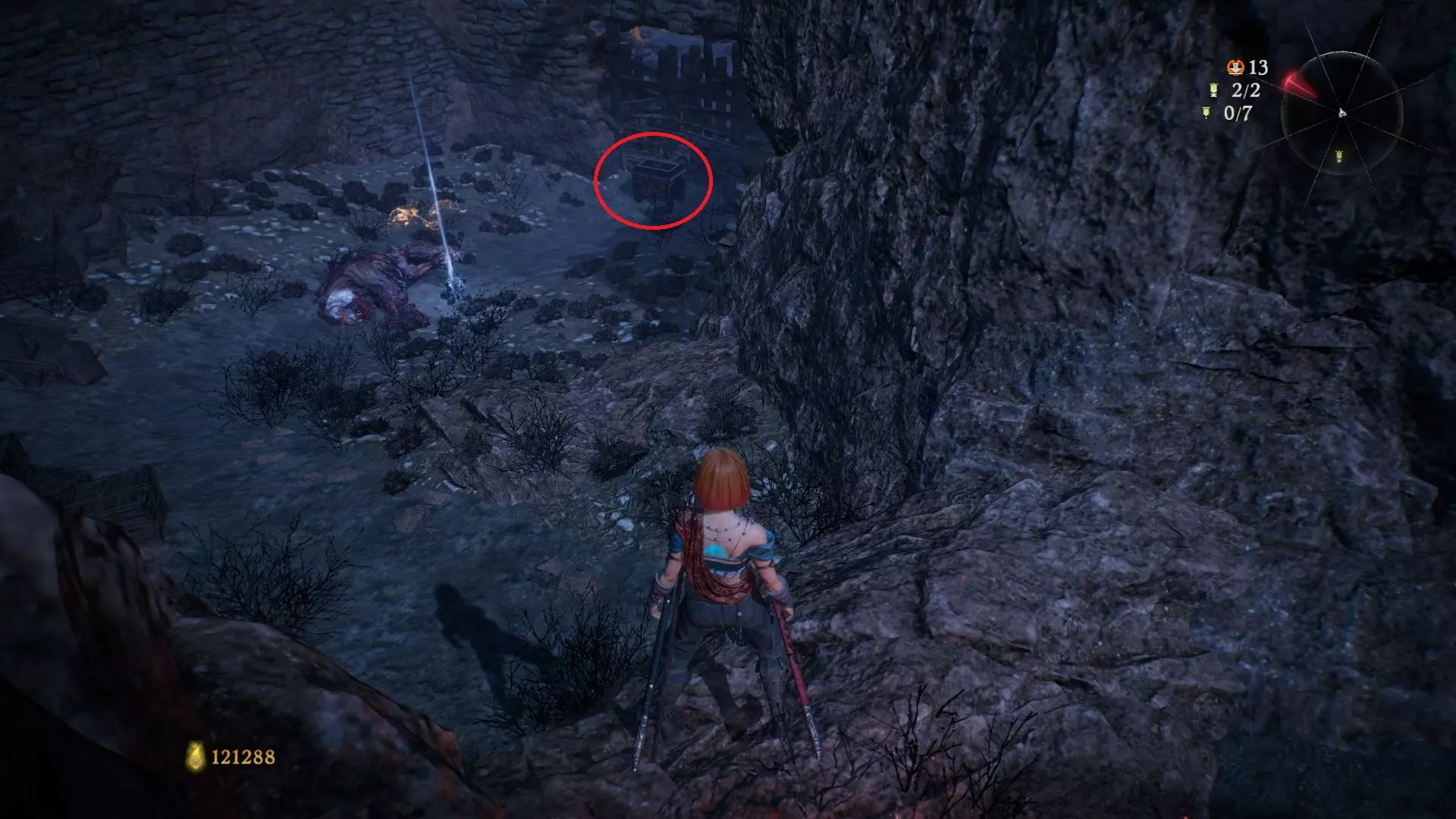 6 外章三魔殿悍鬼狂(3/3) 回到第三个牙旗处,这次从左侧门进去。穿过火焰区到达庭院,从庭院斜对角的石头跳上去即可看到。