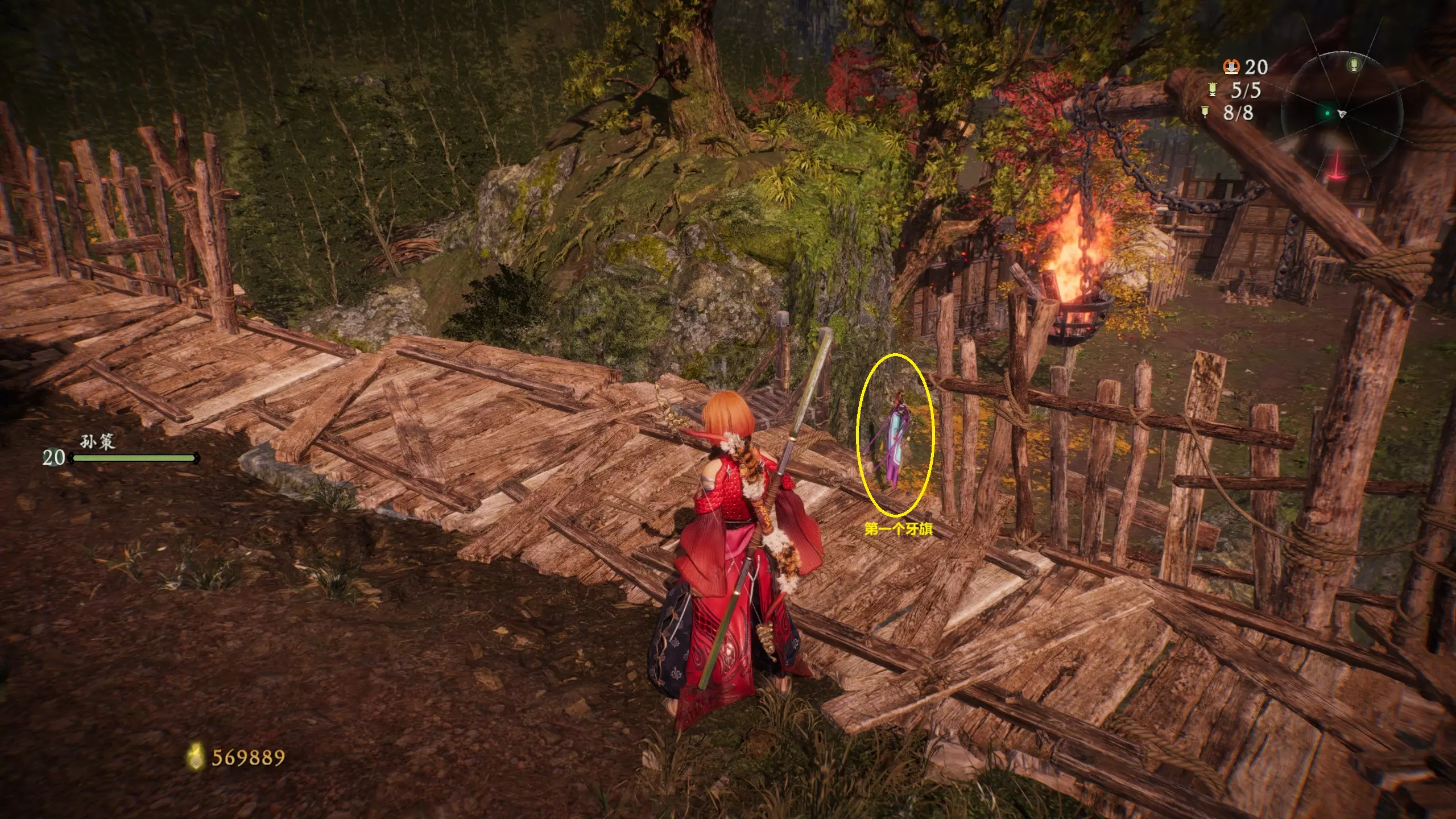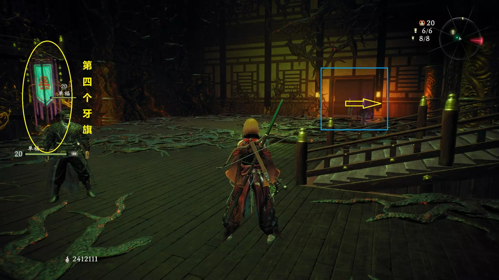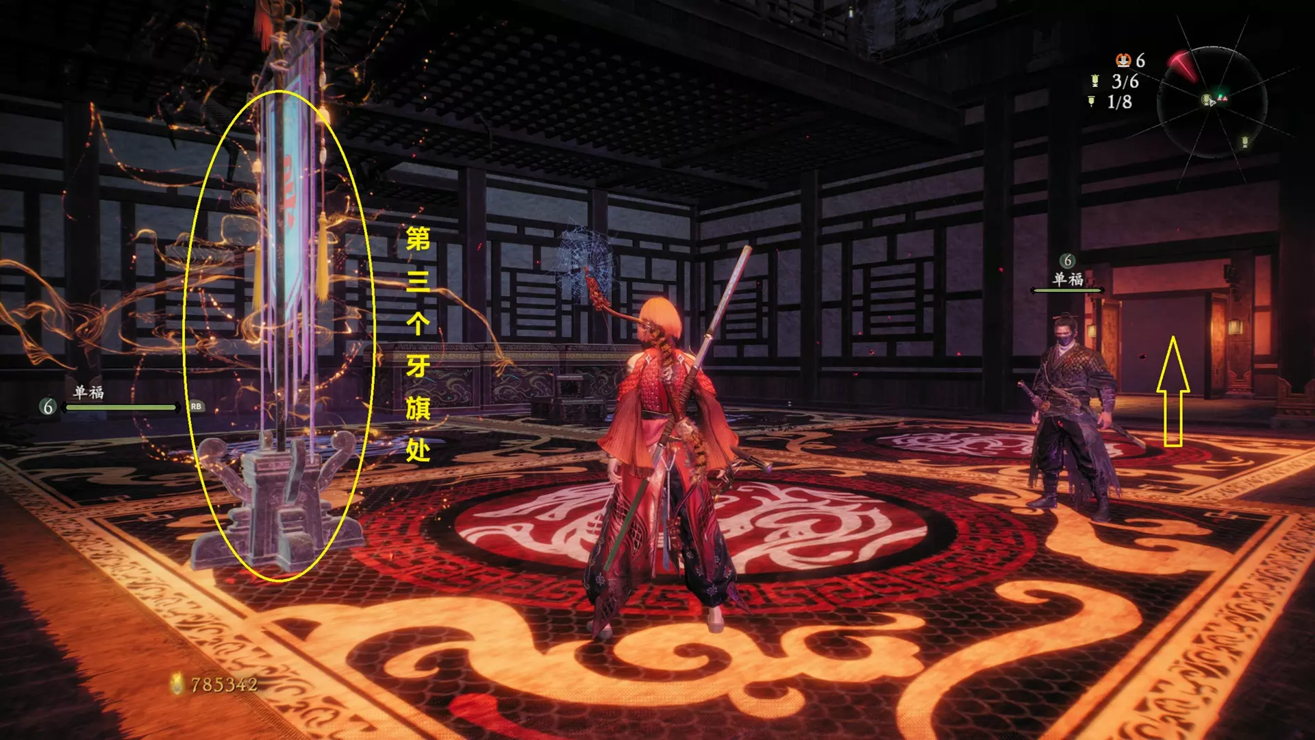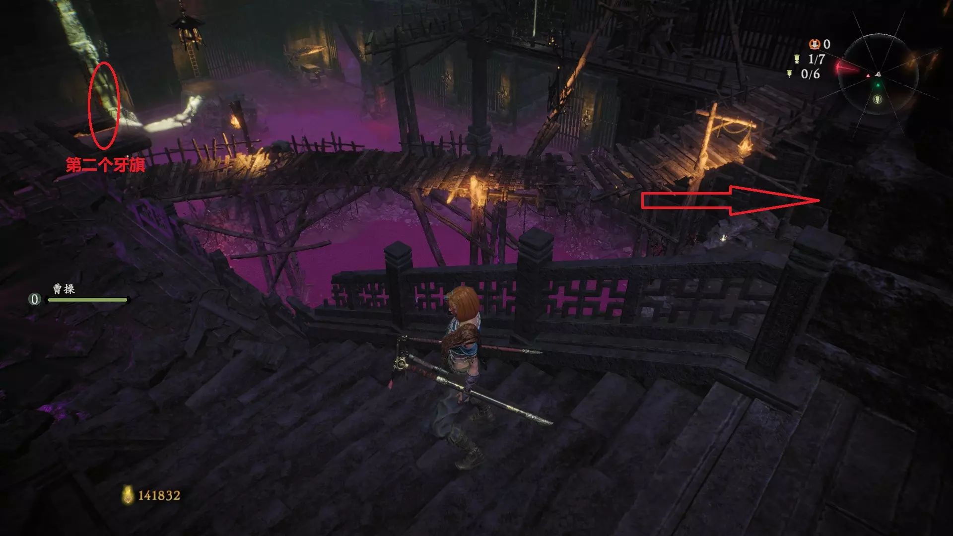 之后返回大殿,从大殿前方上到二层解锁第三个牙旗。先从牙旗右侧门进入,穿过石头区向右看