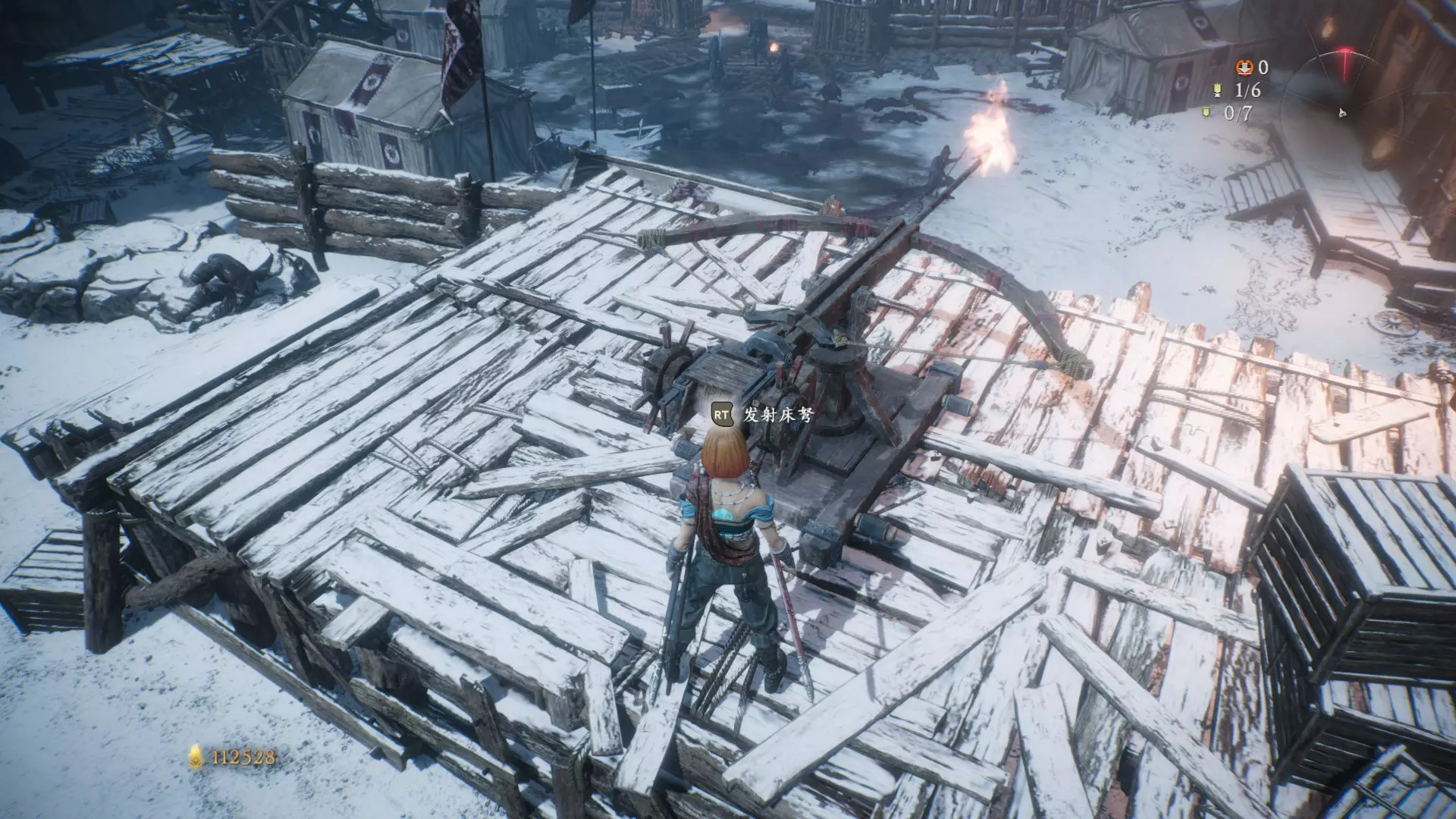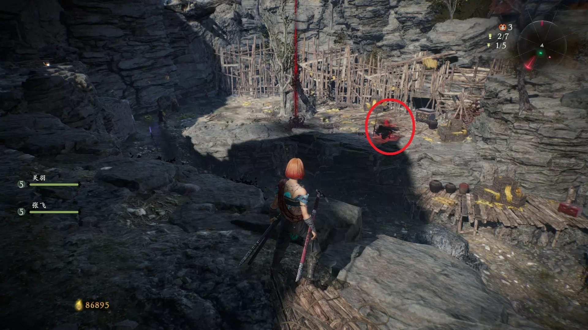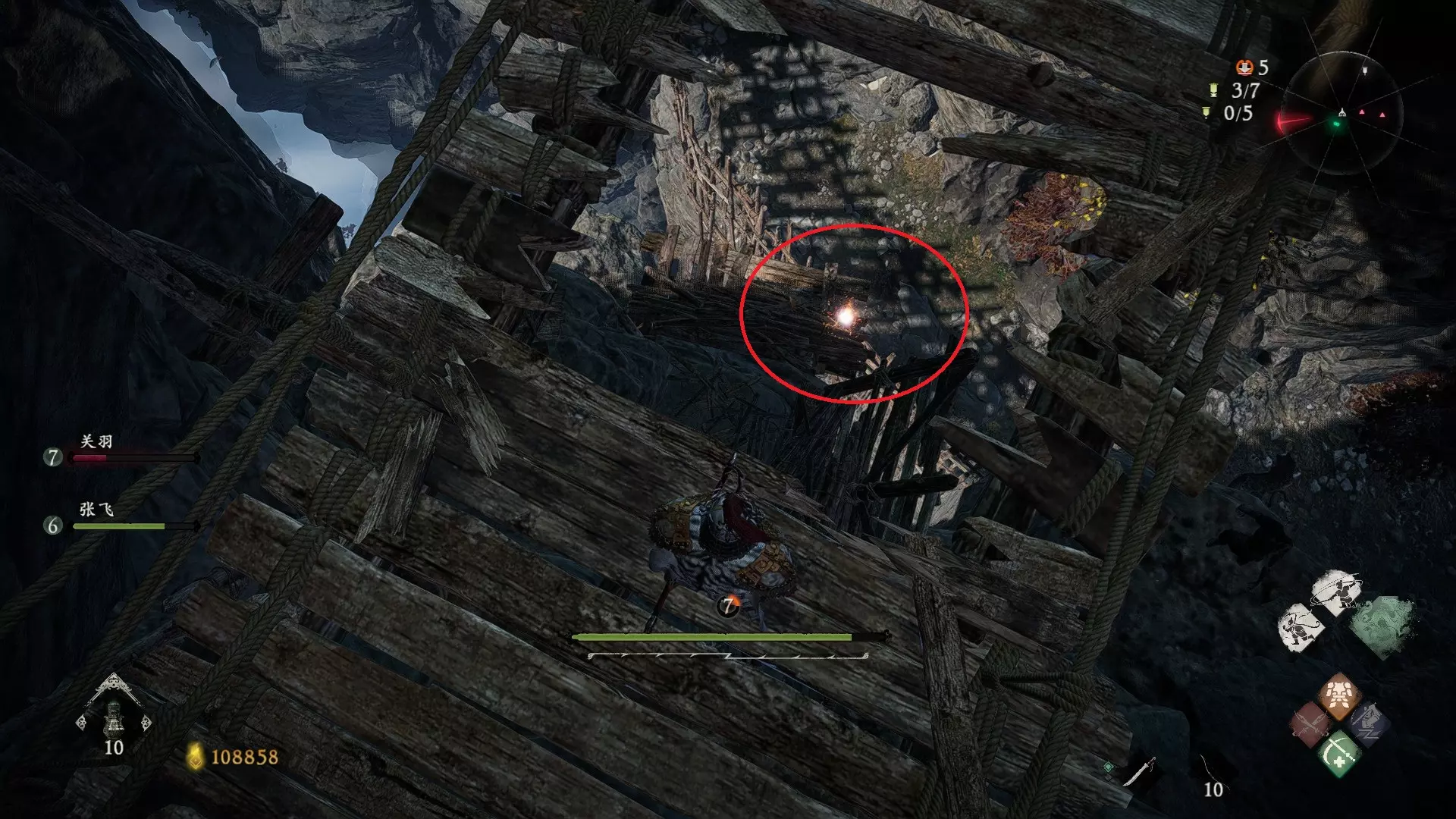 5 第四章 虎牢众鏖兵 先走到如图所示岔路口(左侧能看到牙旗),向右走,看到营地后往左绕一圈,先用弩炮打碎木板,跳上去可以开宝箱