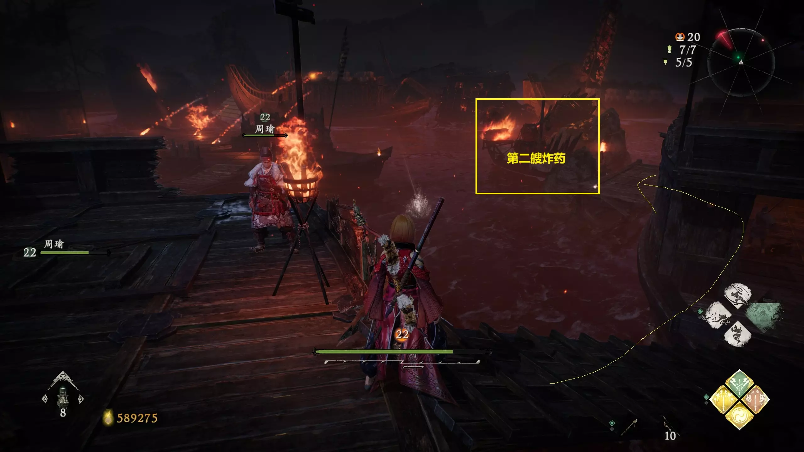 沿着黄线走到虚线位置处上去,在图二位置就能看到第二艘炸药船。