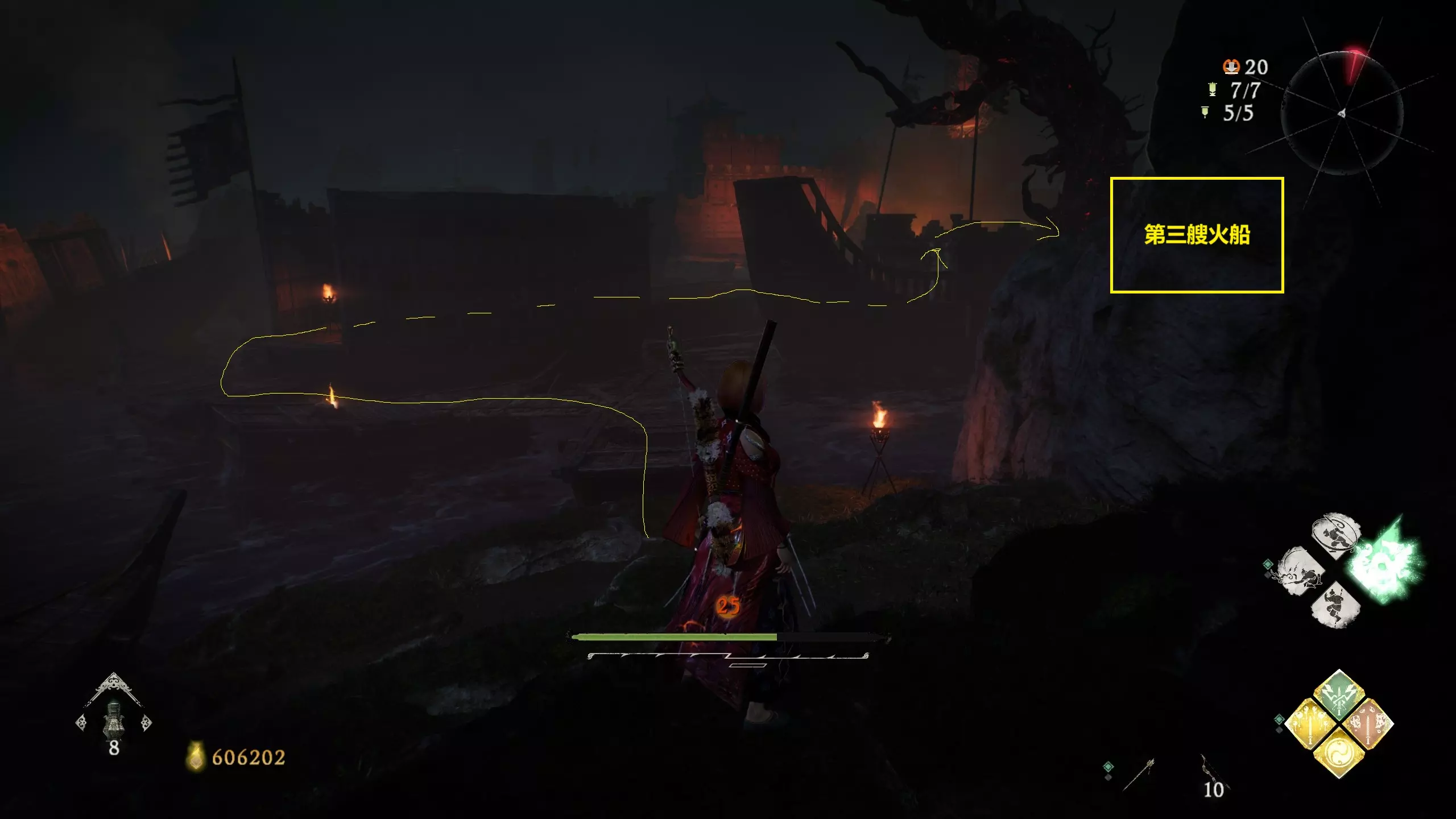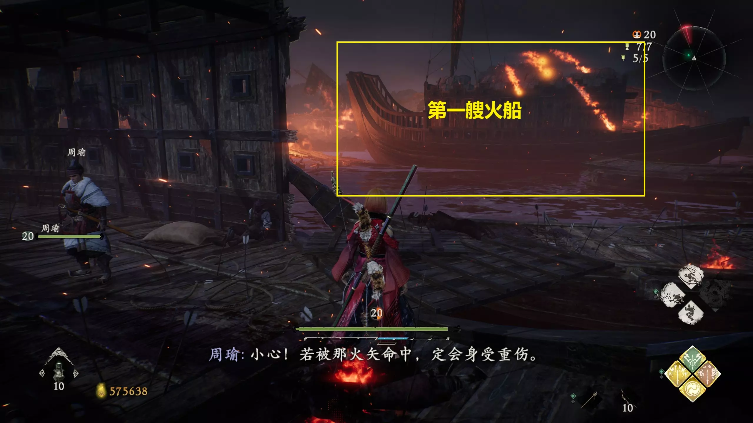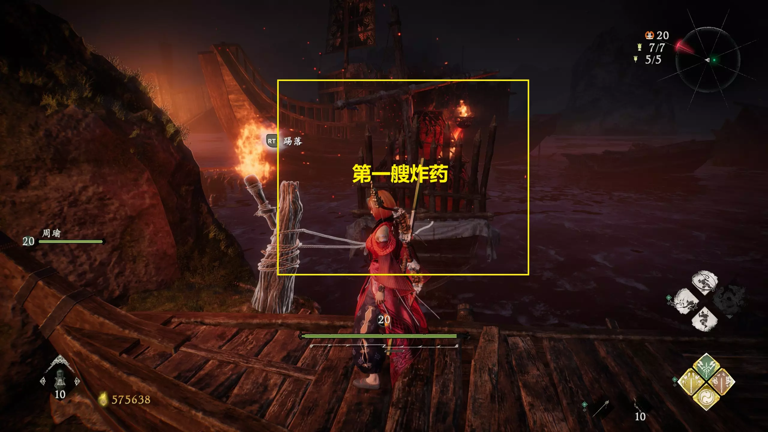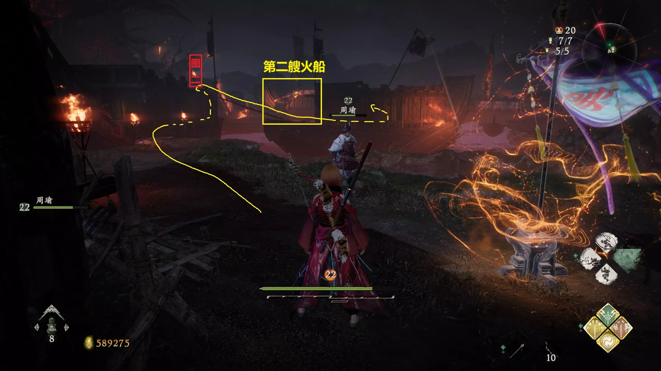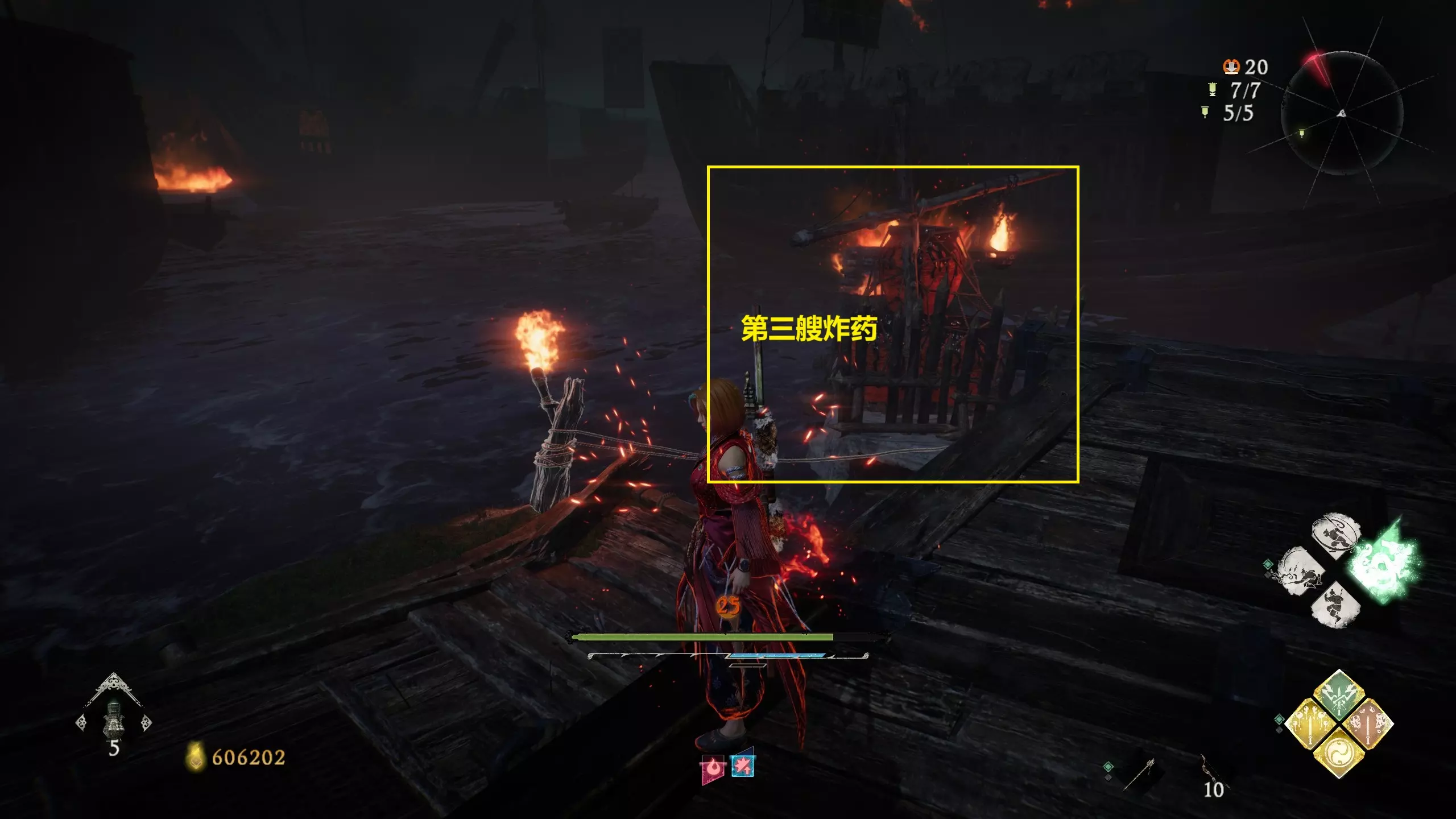 【焚舟燃舰】 已在“碧波卷暗潮”操控火船击沉所有敌军船只。 共三处。流程中使用炸药船炸沉三艘火箭船。 开局出门即可碰到第一艘火箭船。