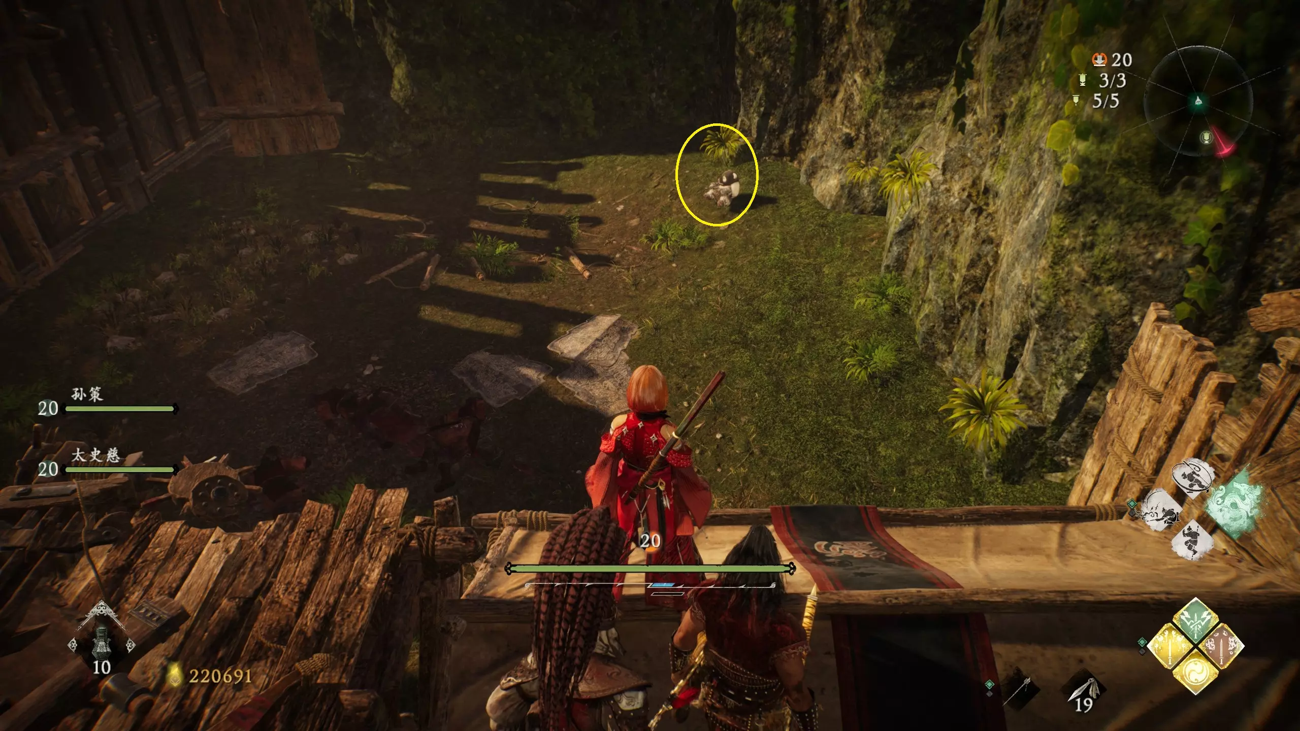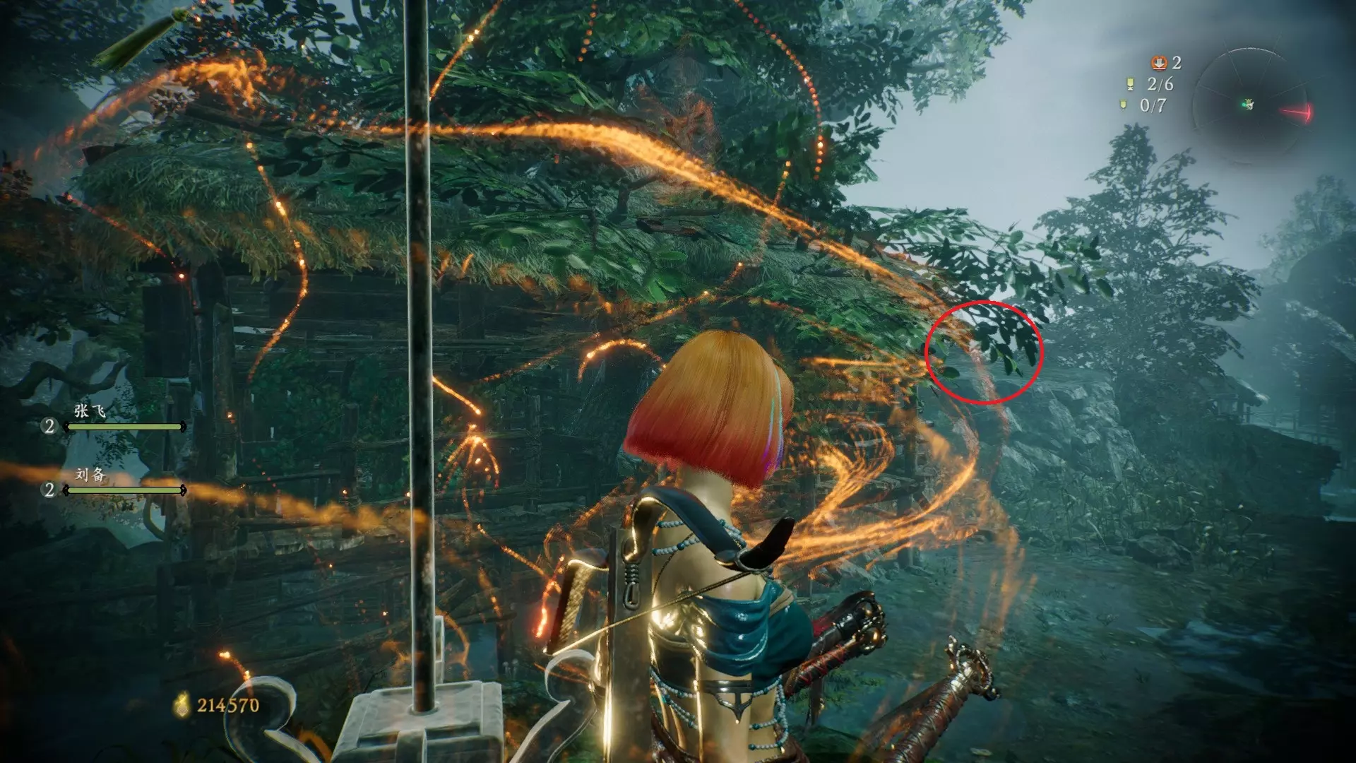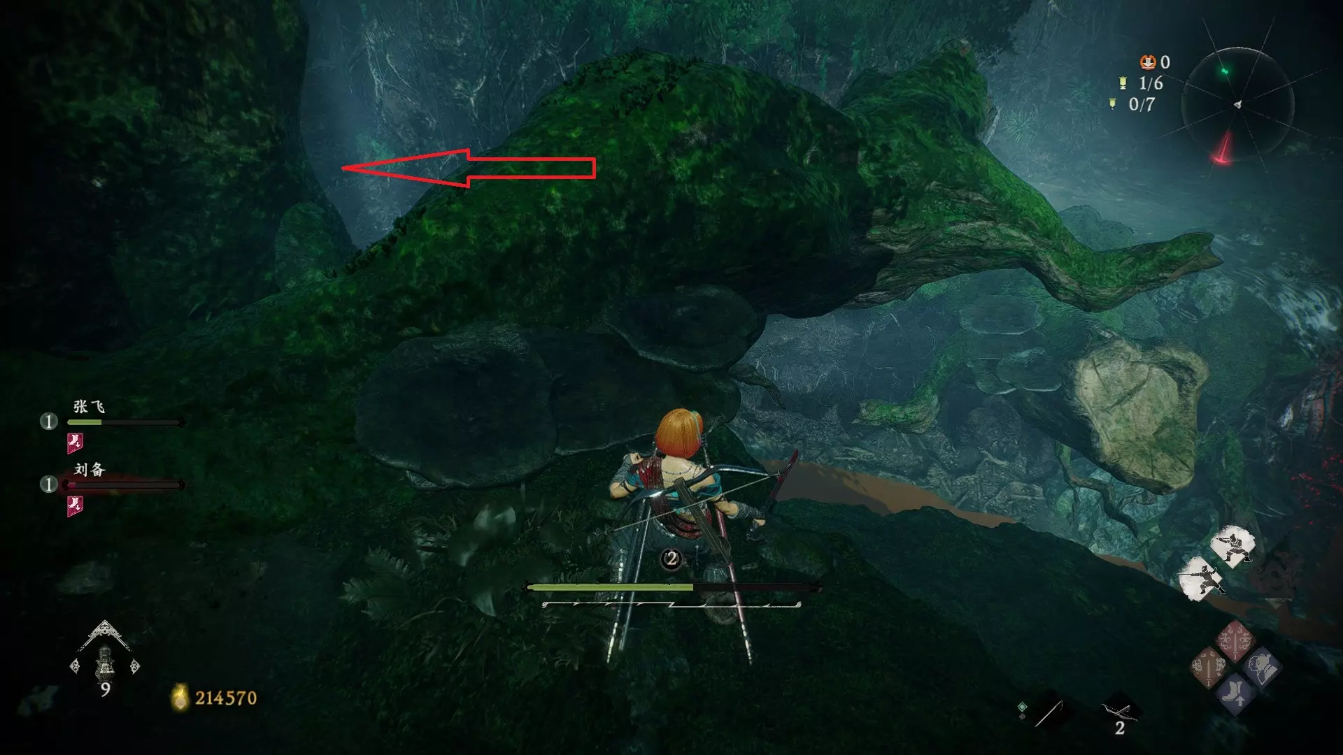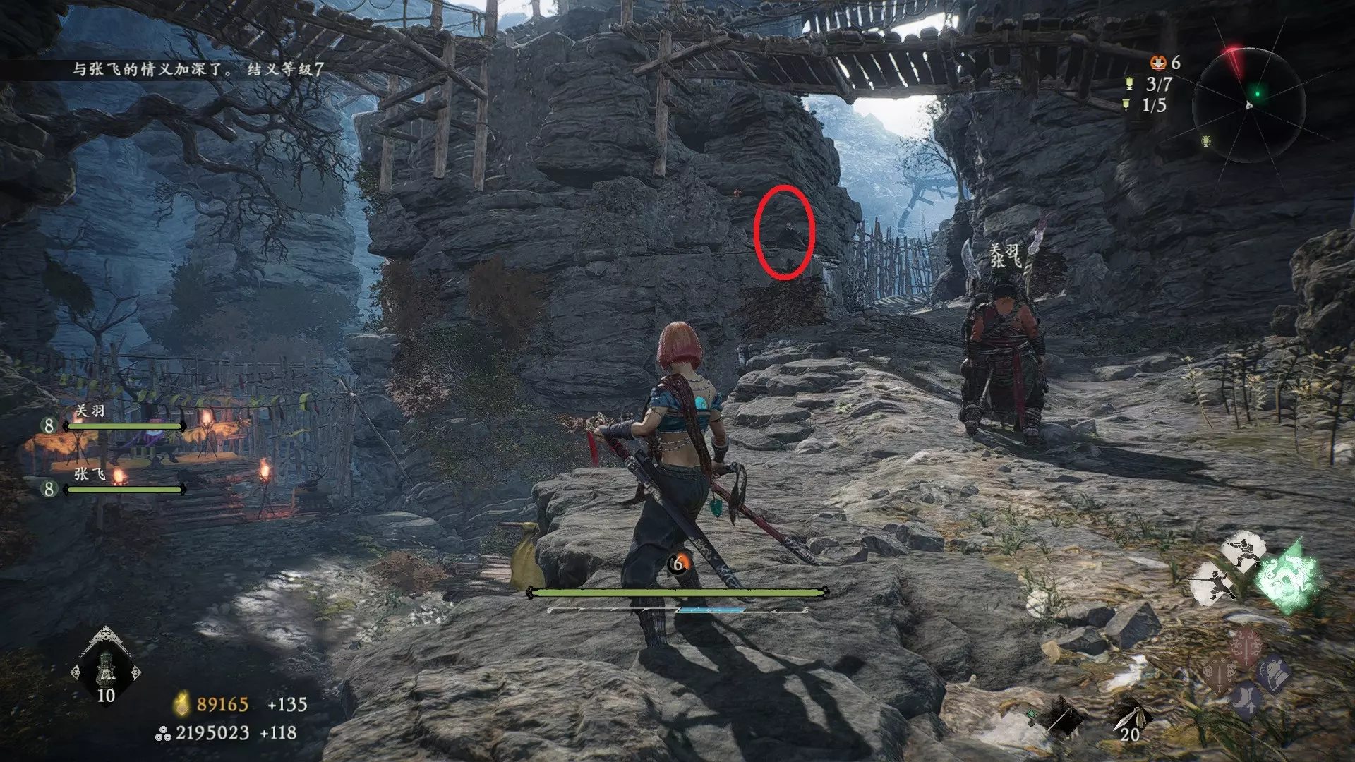 7 外章二 英豪争归附 本章需沿着主线【东莱有义士】的路线反向行进,开局一直走到有三只带翅膀的小怪区域,抬头能看到一个断掉的树干,从右侧上去,走过树干桥,再往前走到断掉的树枝处,跳过去。