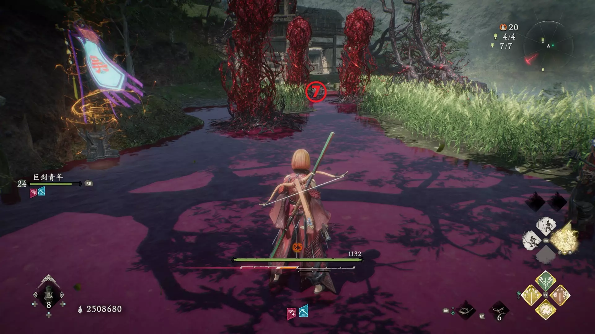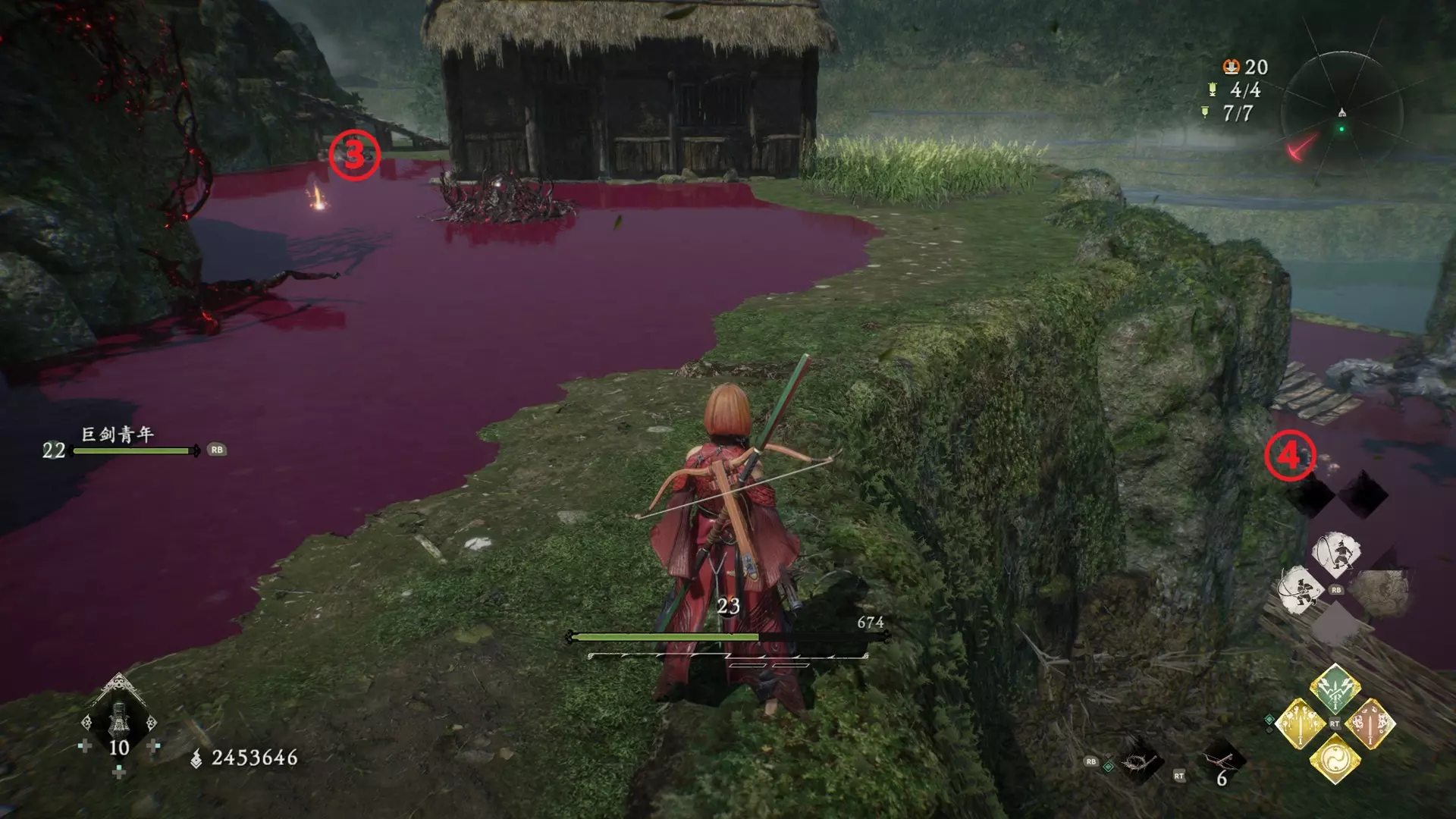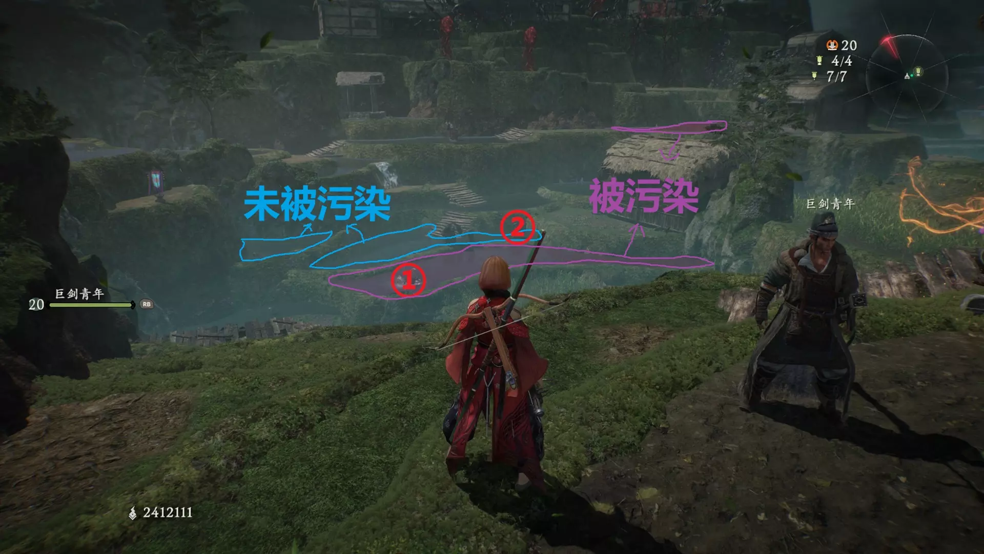 虾荒蟹乱 已在【水畔空然村】击败所有污染水源的虾兵。 干掉污染水的怪,共七只。 鉴定方法:被污染的水是紫色,干掉污染怪后水会变清,借此观察哪一片水域有污染怪。 ①、②:开局第一个牙旗下方的梯田有两只